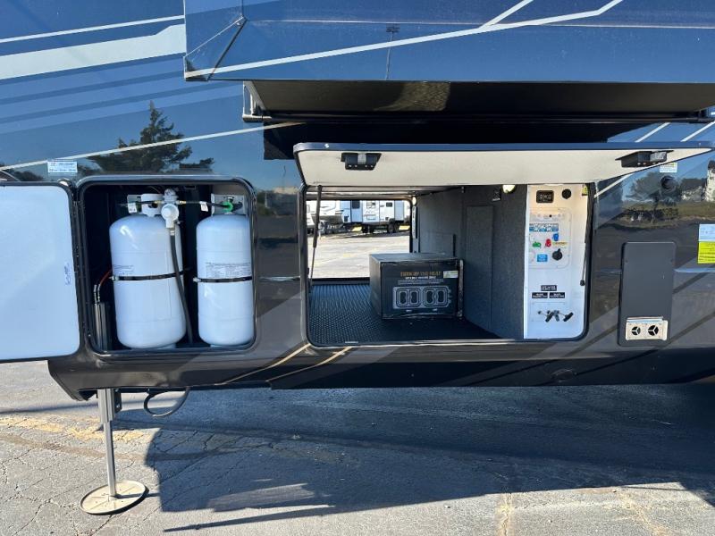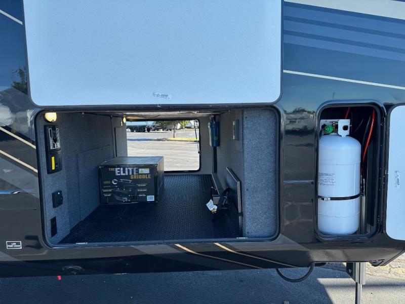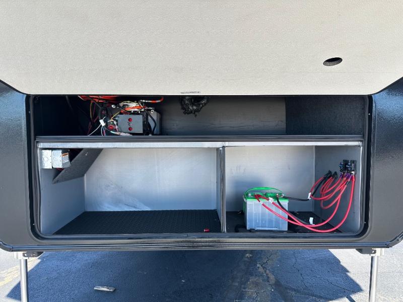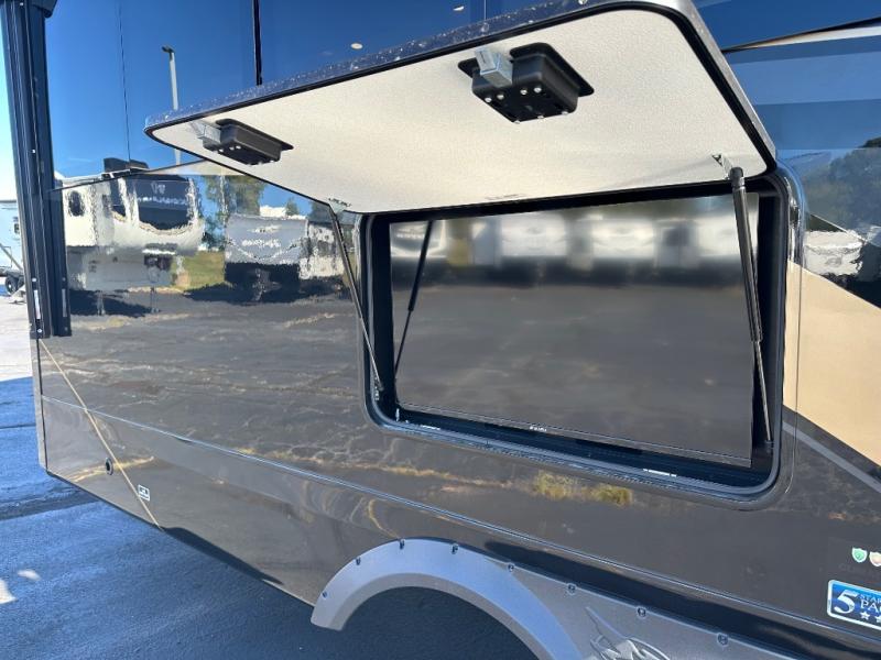 Outside, you’ll find two large power awnings with integrated LED lighting for shaded outdoor living, a 32" exterior TV for backyard entertainment, and a Jayport with LP quick connect for your grill. Additional exterior features include pass-through storage, outdoor speakers, and conveniently placed utility hookups.