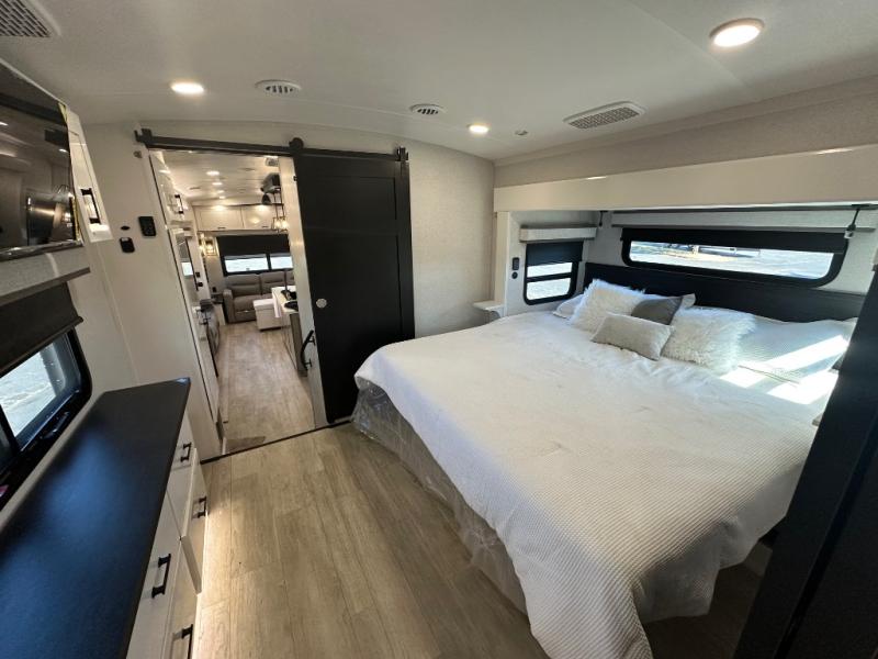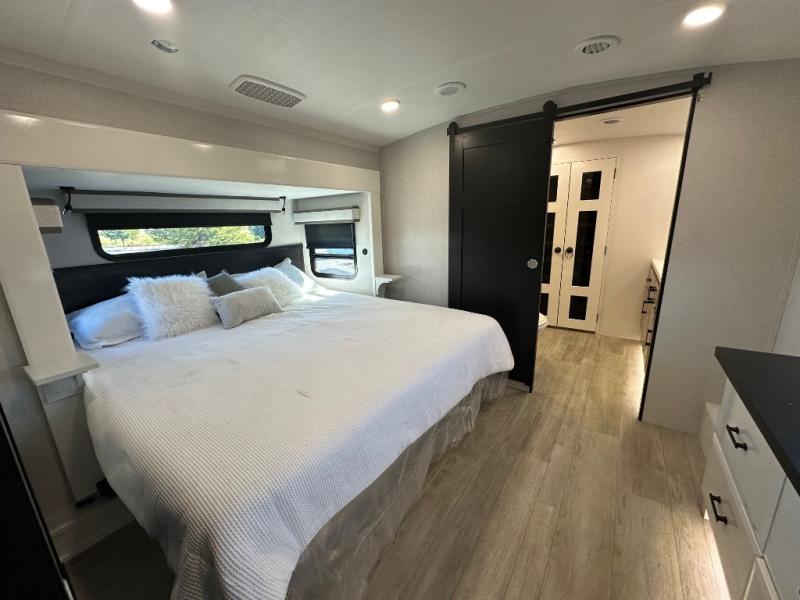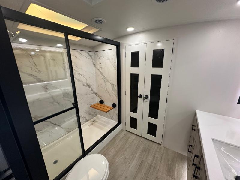 The front master suite includes a king bed slide out, dual nightstands, and a 32" TV for private viewing. The master bath is particularly impressive with dual sinks, a large walk-in shower with a built-in seat, and a spacious walk-in closet for all your clothes and accessories. The kitchen comes fully equipped with a 30" convection microwave, residential dishwasher, pantry, and a large refrigerator to make meal prep easy and enjoyable. Dining is simple at the booth or optional free-standing table, while the roll-top counters provide added versatility.