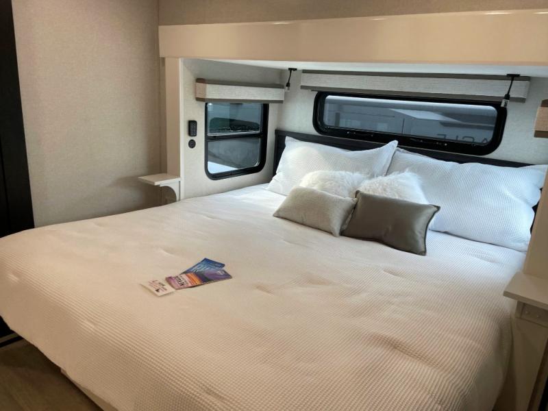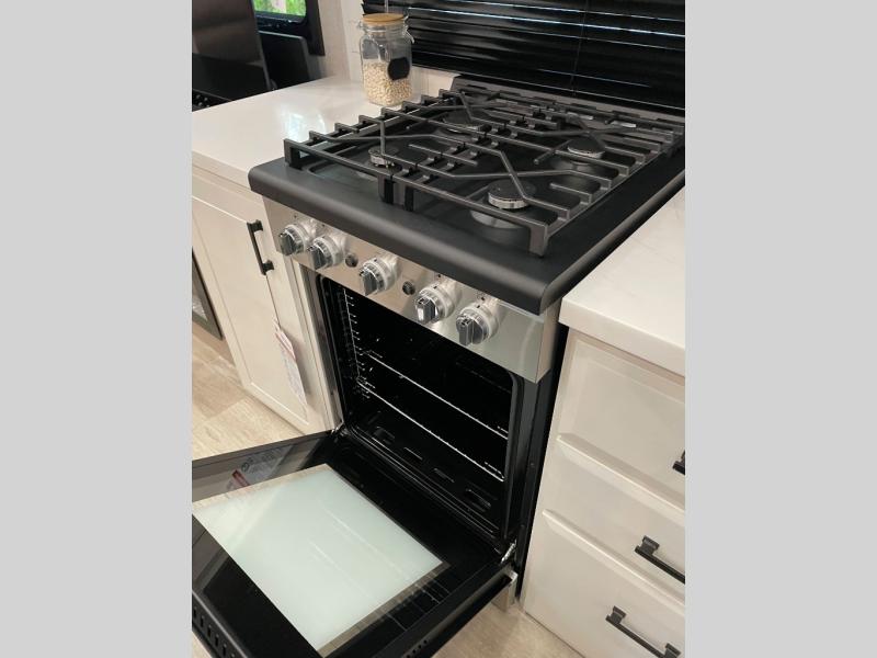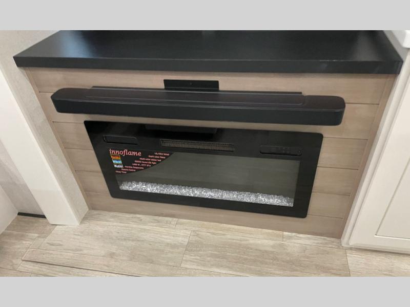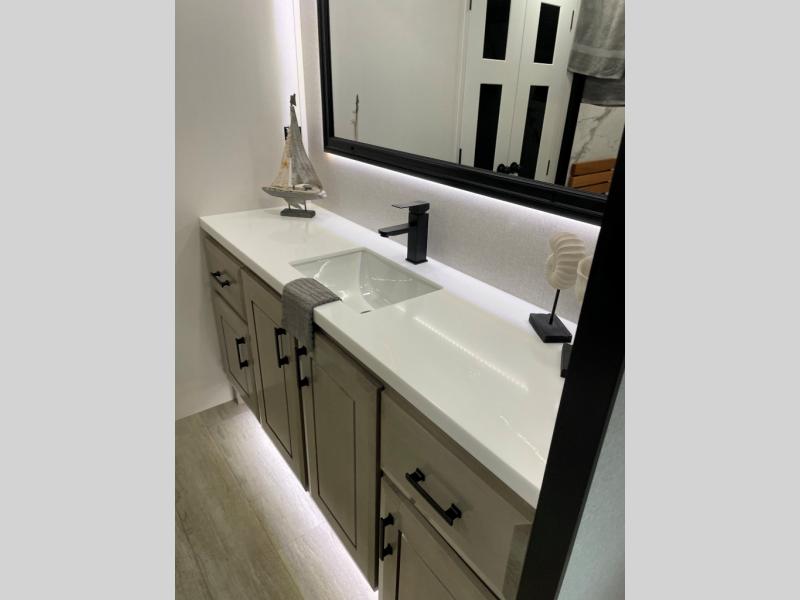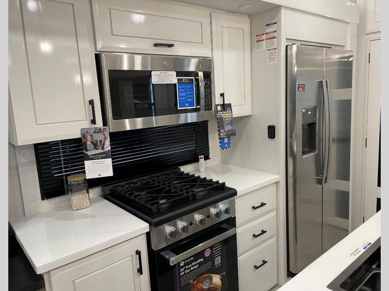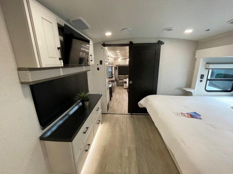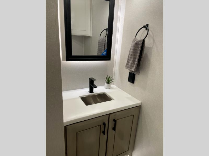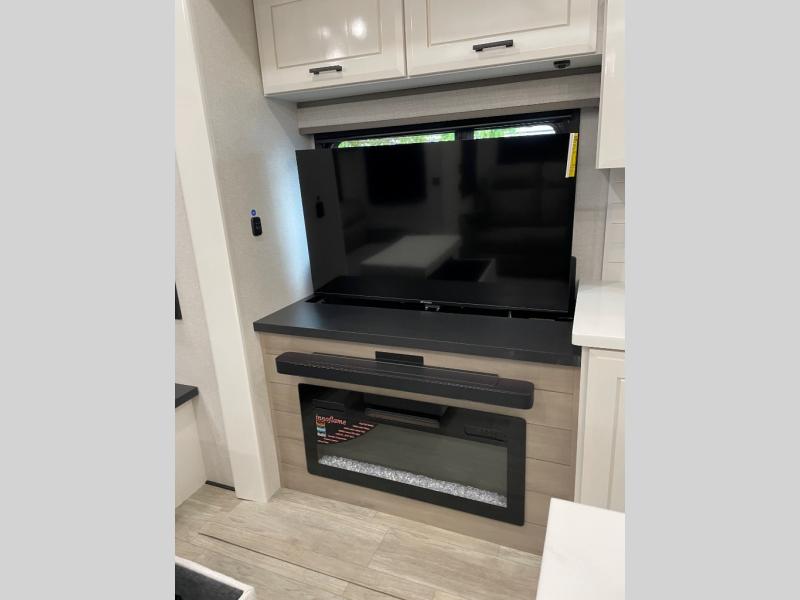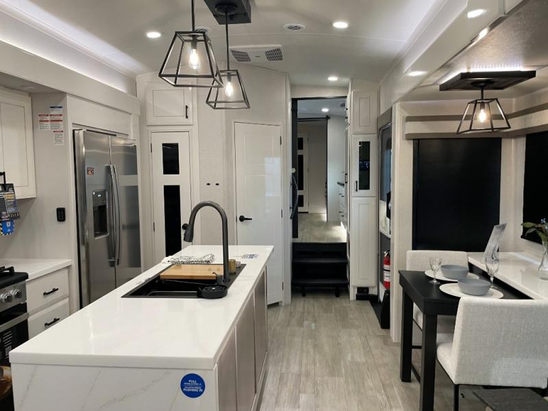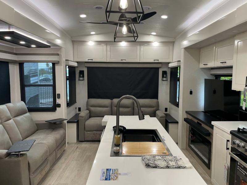 You can't go wrong with this fifth wheel that can sleep four! You will love how much space you have in the main living area thanks to the dual opposing slides, and there is a kitchen island here with a pull-out extension for added prep space. The convenient half bath is right off of the kitchen for quick restroom breaks, and you'll find a shoe garage and a wardrobe just as you enter the unit to keep the RV tidy. Head to the master bedroom for a rest on the king bed slide out, or you may want to watch a show on the 32" bedroom TV. The front master bath may be your favorite feature of this unit. Here, you'll find dual bath sinks, a walk-in shower with a seat, plus a spacious walk-in closet for your clothes. And don't overlook the exterior with its two power awnings, 32" exterior TV, and a Jayport with LP quick connect for your outdoor grill.