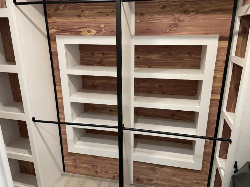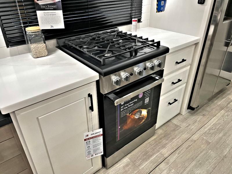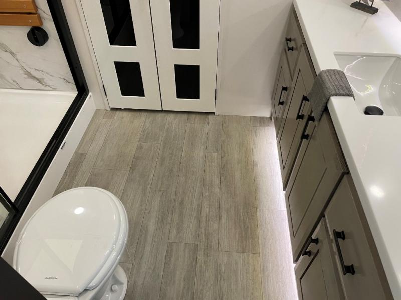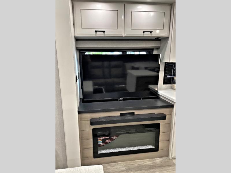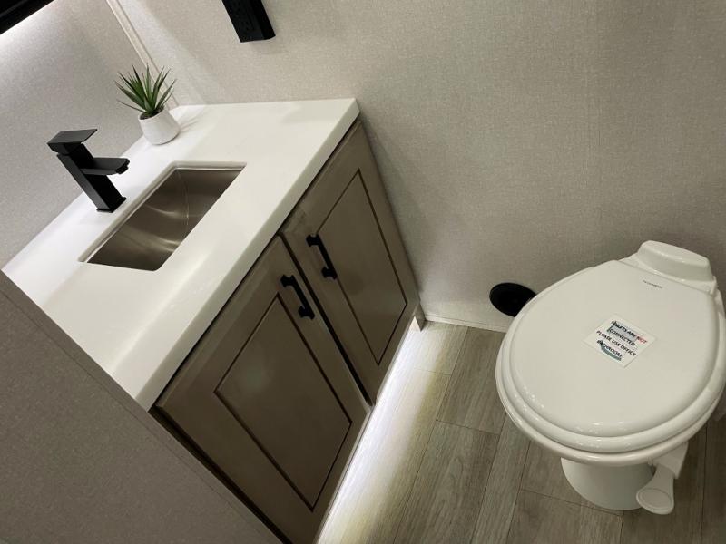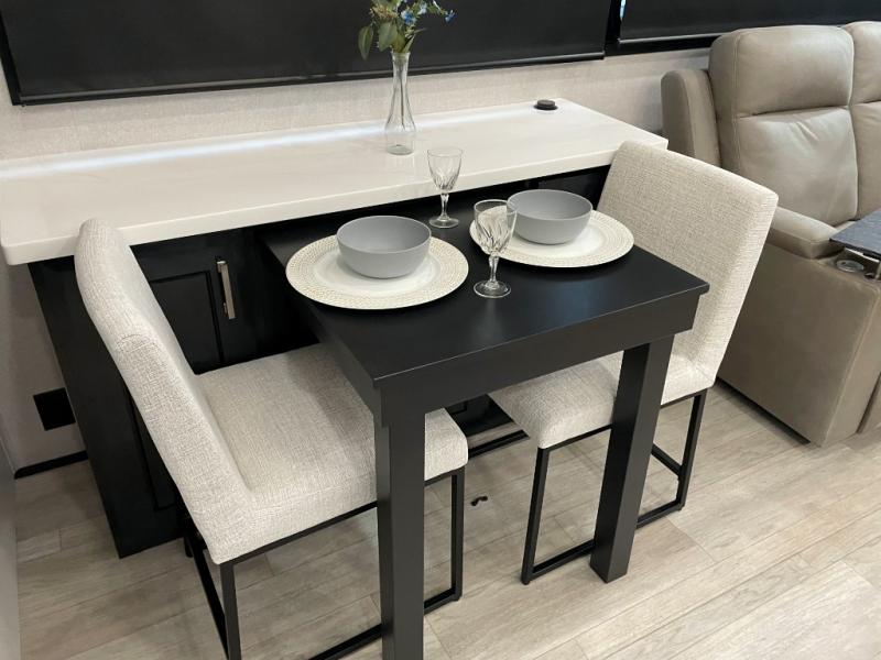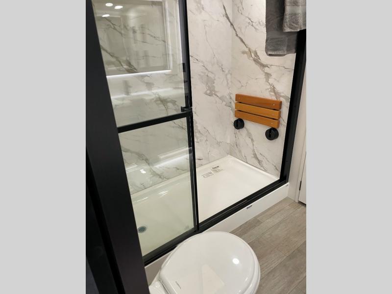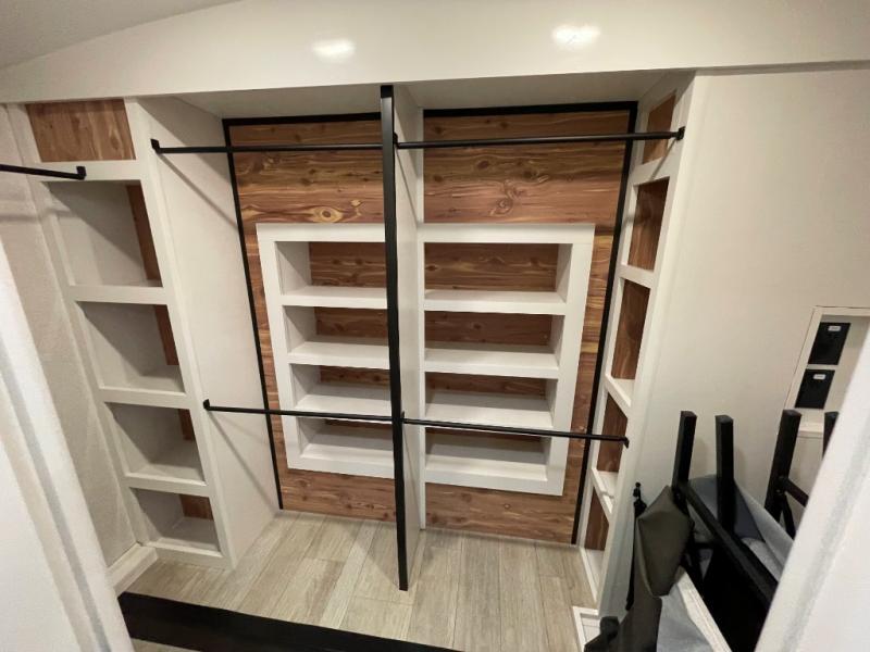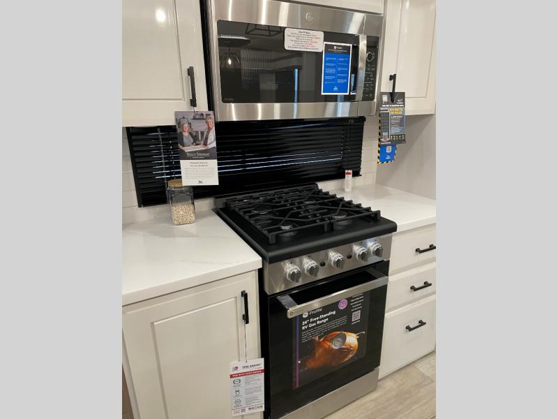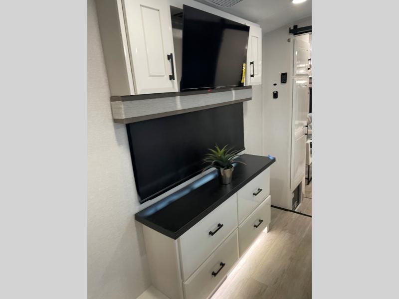 You can't go wrong with this fifth wheel that can sleep four! You will love how much space you have in the main living area thanks to the dual opposing slides, and there is a kitchen island here with a pull-out extension for added prep space. The convenient half bath is right off of the kitchen for quick restroom breaks, and you'll find a shoe garage and a wardrobe just as you enter the unit to keep the RV tidy. Head to the master bedroom for a rest on the king bed slide out, or you may want to watch a show on the 32" bedroom TV. The front master bath may be your favorite feature of this unit. Here, you'll find dual bath sinks, a walk-in shower with a seat, plus a spacious walk-in closet for your clothes. And don't overlook the exterior with its two power awnings, 32" exterior TV, and a Jayport with LP quick connect for your outdoor grill.