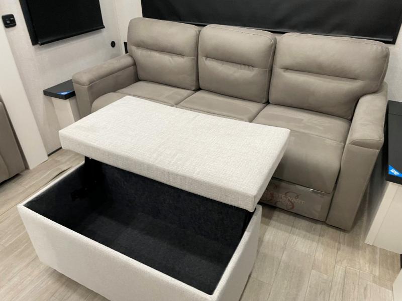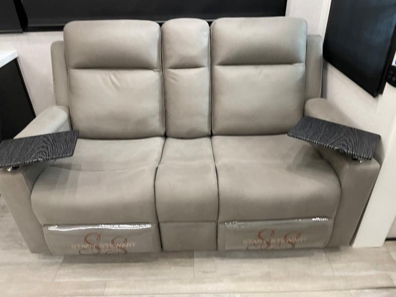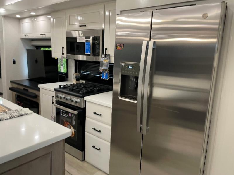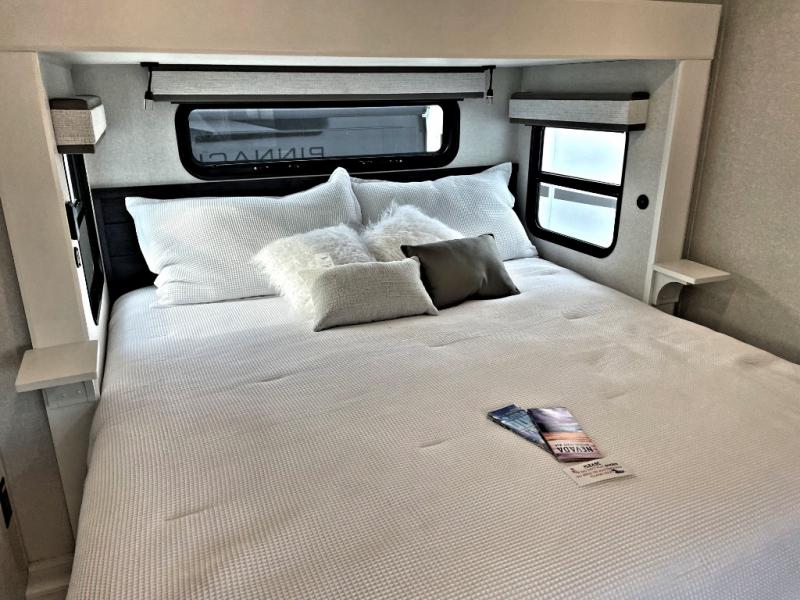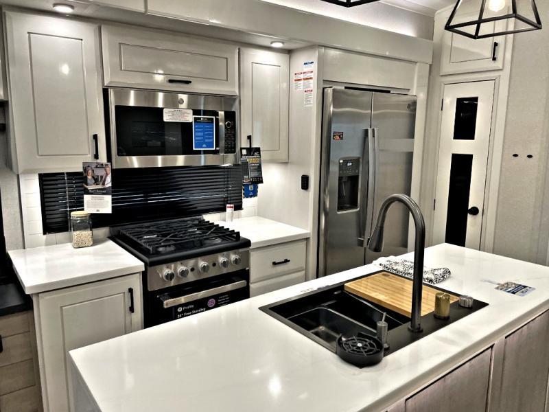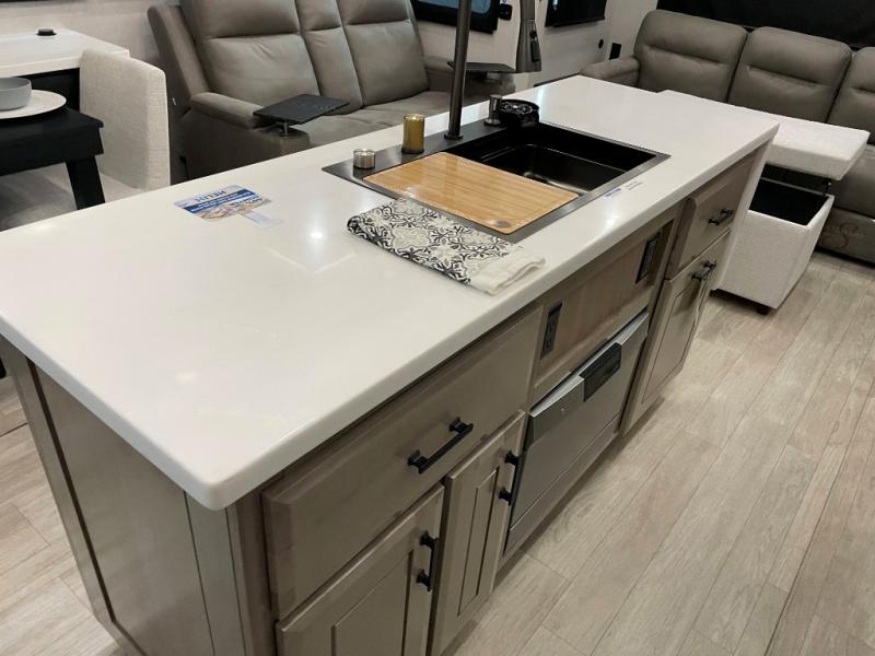 Each Pinnacle fifth wheel features Stronghold VBL lamination for the lightest, yet strongest construction in the RV industry. Add that to the Magnum Truss XL6 roof system and Climate Shield zero-degree tested weather protection and you'll be enjoying your fifth wheel for years to come. Some of the exterior conveniences you will appreciate are the Keyed-Alike lock system, the fully enclosed, universal docking center, and the 6-point hydraulic auto-leveling system for quick and easy set up. The 5 Star Handling Package will make towing a fifth wheel a walk in the park, and the two Whisper Quiet A/C units will keep you comfortable during the hot summer months. Inside, you'll enjoy the residential "Do it all" sink with pull-out kitchen faucet, glass rinse, and vegetable rinse, the handcrafted hardwood glazed cabinetry, the vinyl flooring throughout, plus many more comforts. There is even a central vacuum system, a wireless remote control system, USB ports throughout, plus many more conveniences to make each trip enjoyable.