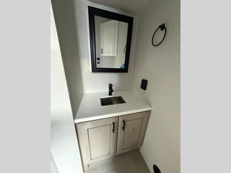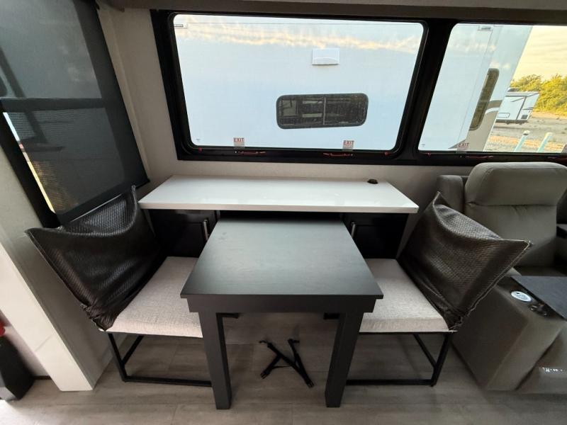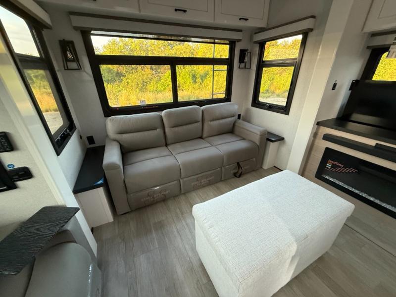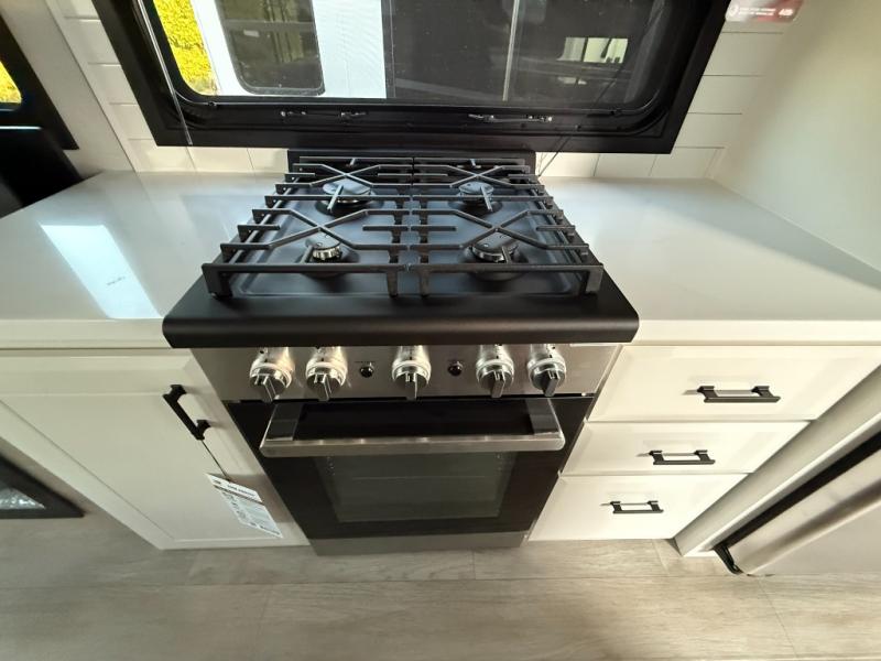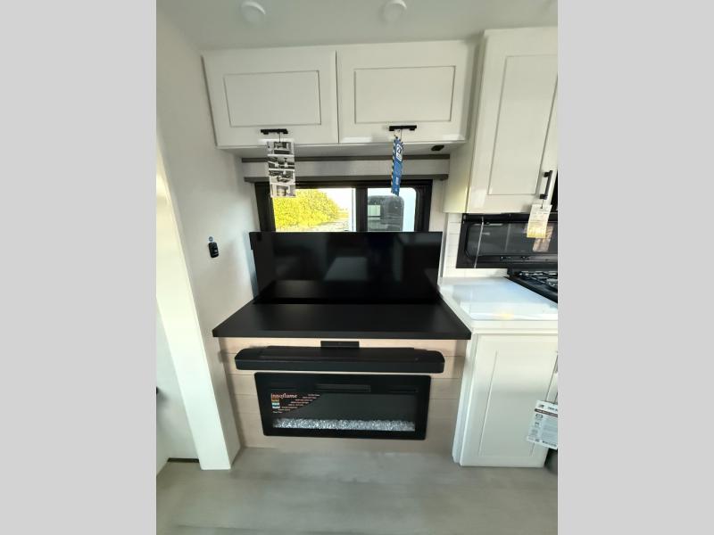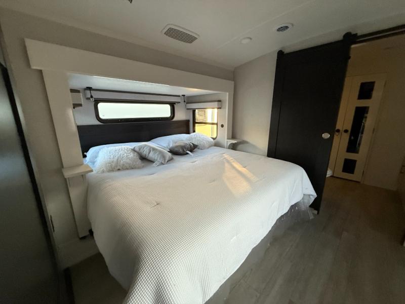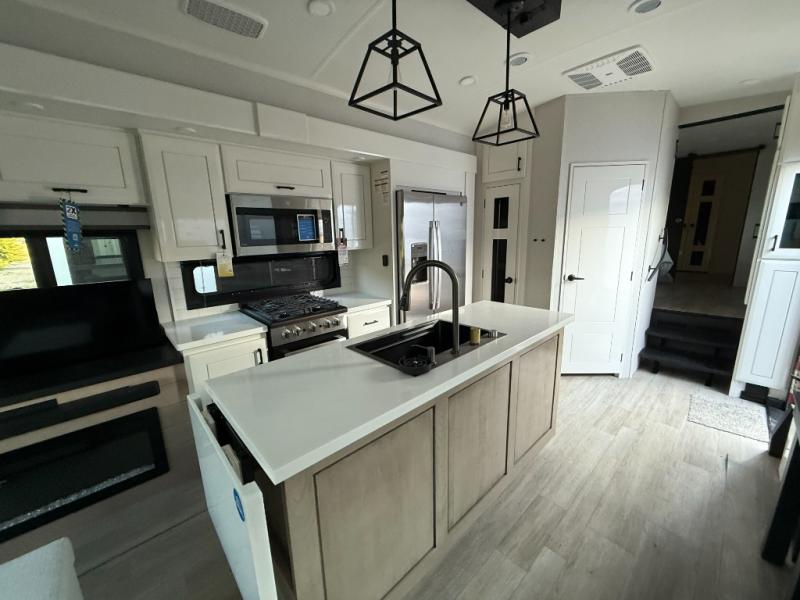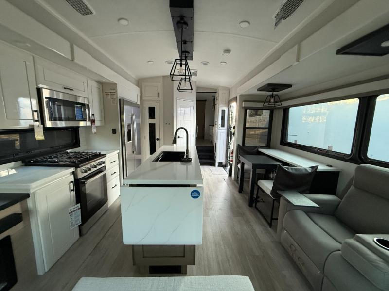 You can't go wrong with this fifth wheel that can sleep four! You will love how much space you have in the main living area thanks to the dual opposing slides, and there is a kitchen island here with a pull-out extension for added prep space. The convenient half bath is right off of the kitchen for quick restroom breaks, and you'll find a shoe garage and a wardrobe just as you enter the unit to keep the RV tidy. Head to the master bedroom for a rest on the king bed slide out, or you may want to watch a show on the 32" bedroom TV. The front master bath may be your favorite feature of this unit. Here, you'll find dual bath sinks, a walk-in shower with a seat, plus a spacious walk-in closet for your clothes. And don't overlook the exterior with its two power awnings, 32" exterior TV, and a Jayport with LP quick connect for your outdoor grill.