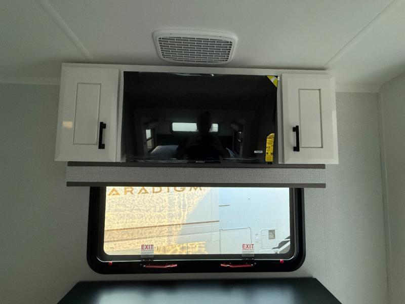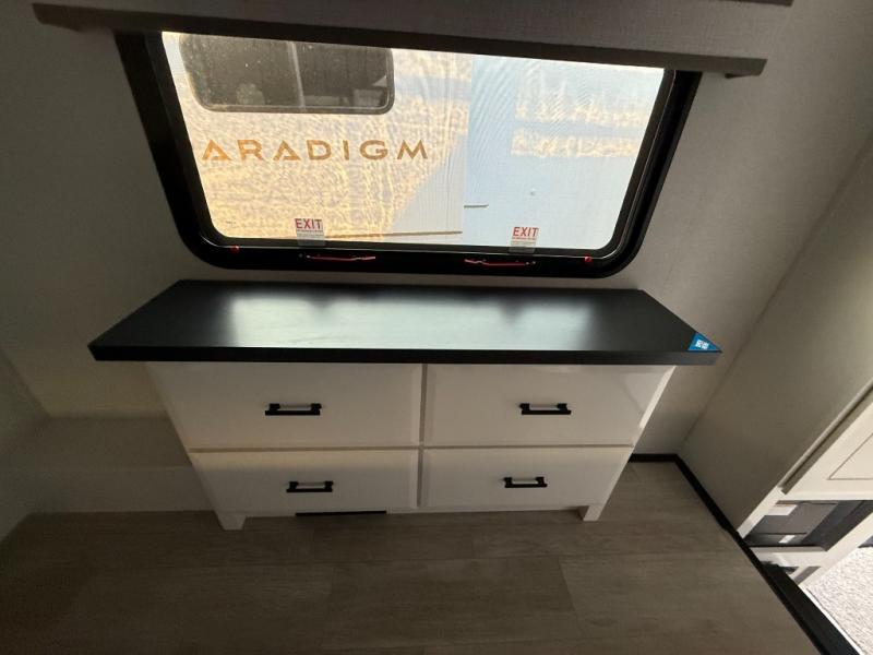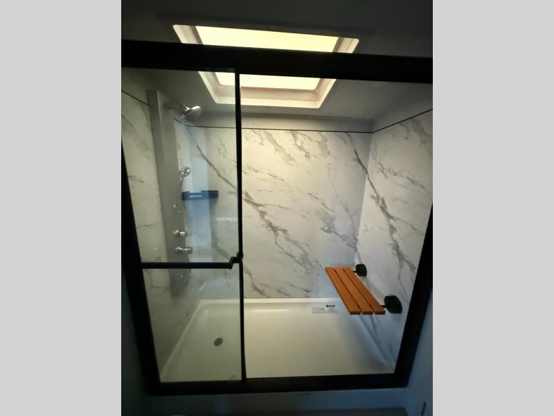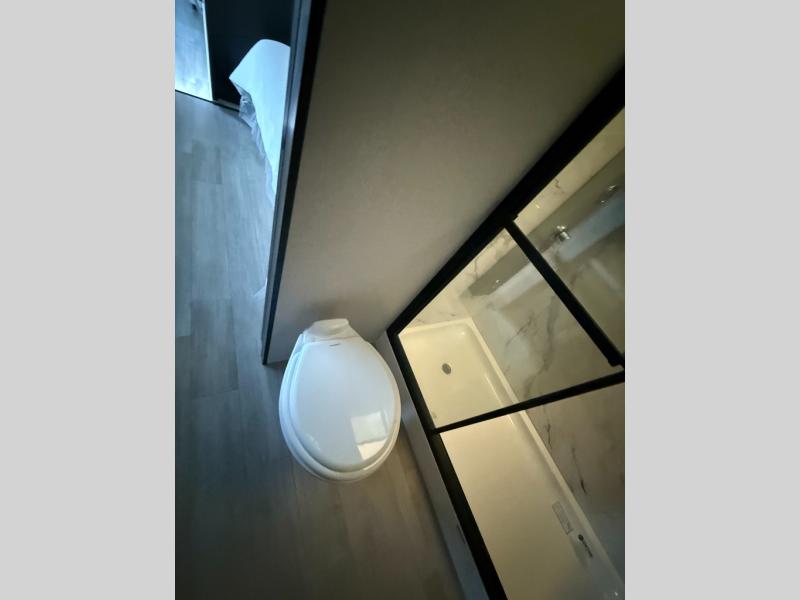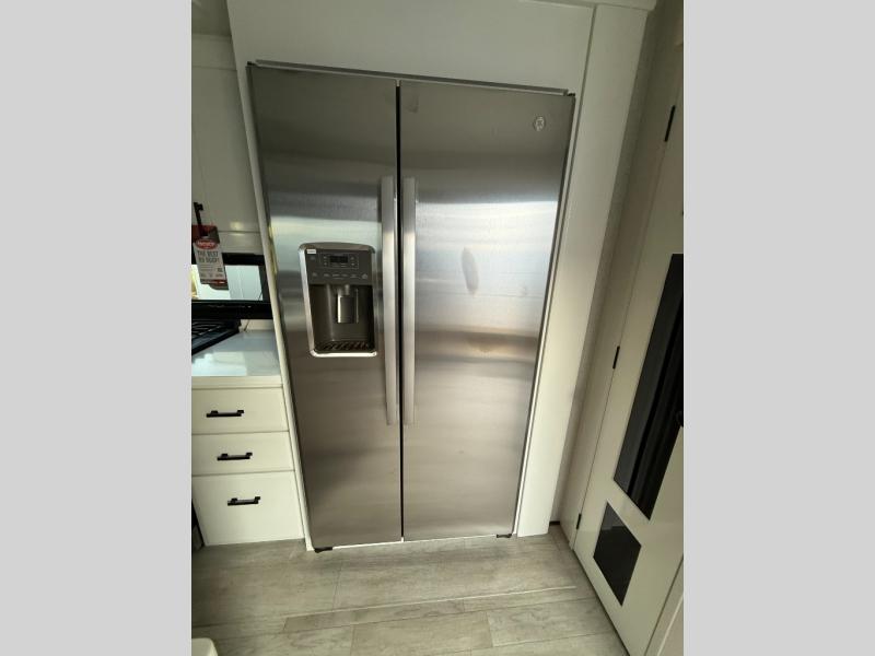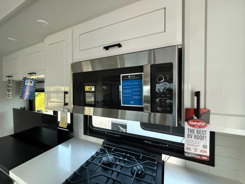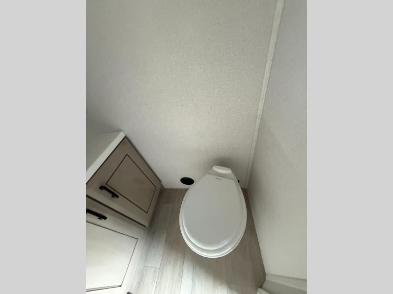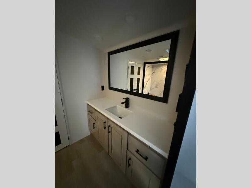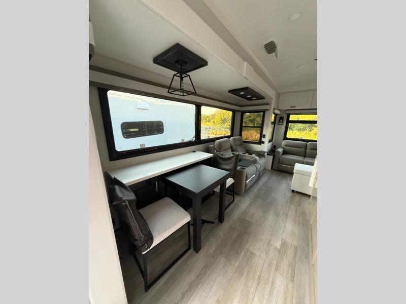 You can't go wrong with this fifth wheel that can sleep four! You will love how much space you have in the main living area thanks to the dual opposing slides, and there is a kitchen island here with a pull-out extension for added prep space. The convenient half bath is right off of the kitchen for quick restroom breaks, and you'll find a shoe garage and a wardrobe just as you enter the unit to keep the RV tidy. Head to the master bedroom for a rest on the king bed slide out, or you may want to watch a show on the 32" bedroom TV. The front master bath may be your favorite feature of this unit. Here, you'll find dual bath sinks, a walk-in shower with a seat, plus a spacious walk-in closet for your clothes. And don't overlook the exterior with its two power awnings, 32" exterior TV, and a Jayport with LP quick connect for your outdoor grill.