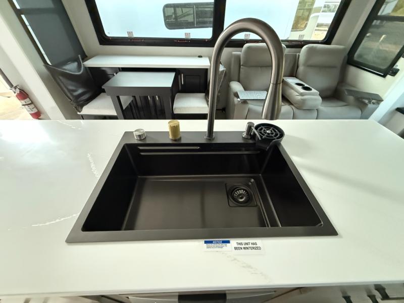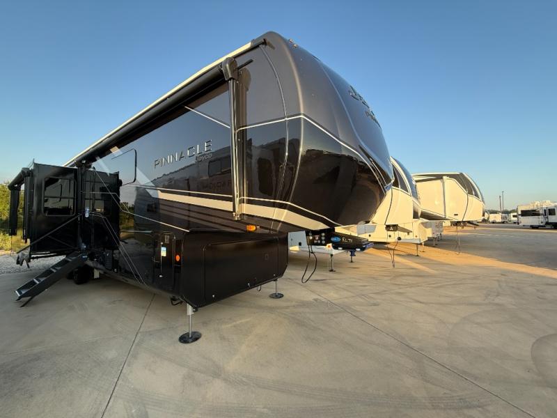 Each Pinnacle fifth wheel features Stronghold VBL lamination for the lightest, yet strongest construction in the RV industry. Add that to the Magnum Truss XL6 roof system and Climate Shield zero-degree tested weather protection and you'll be enjoying your fifth wheel for years to come. Some of the exterior conveniences you will appreciate are the Keyed-Alike lock system, the fully enclosed, universal docking center, and the 6-point hydraulic auto-leveling system for quick and easy set up. The 5 Star Handling Package will make towing a fifth wheel a walk in the park, and the two Whisper Quiet A/C units will keep you comfortable during the hot summer months. Inside, you'll enjoy the residential "Do it all" sink with pull-out kitchen faucet, glass rinse, and vegetable rinse, the handcrafted hardwood glazed cabinetry, the vinyl flooring throughout, plus many more comforts. There is even a central vacuum system, a wireless remote control system, USB ports throughout, plus many more conveniences to make each trip enjoyable.
