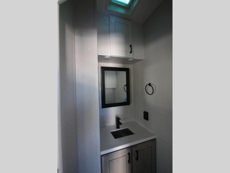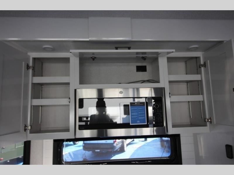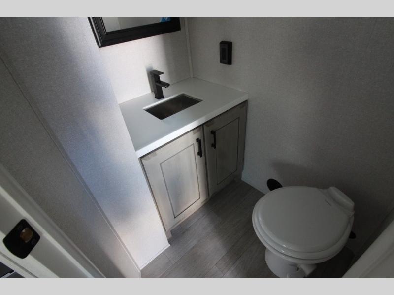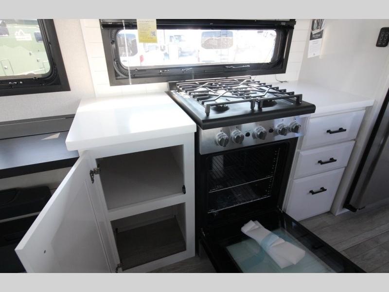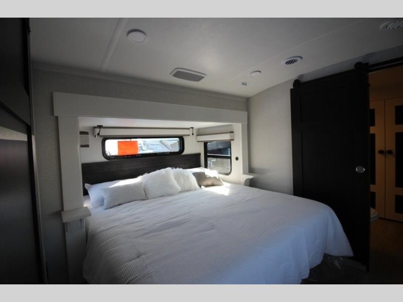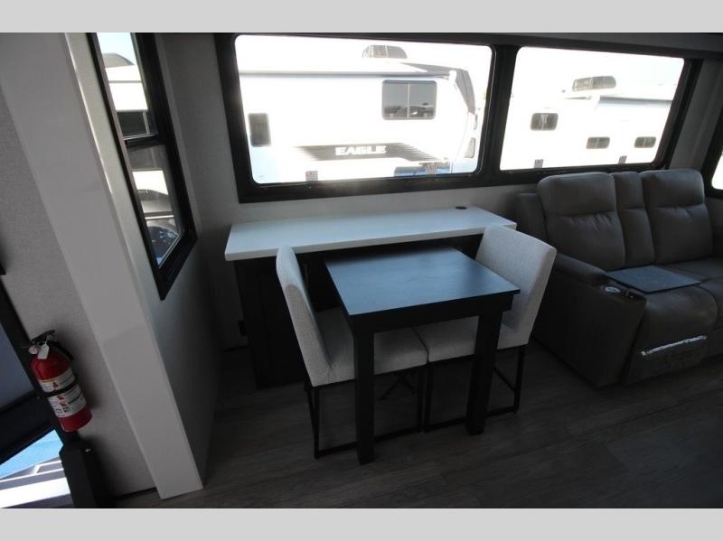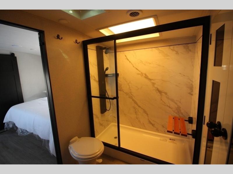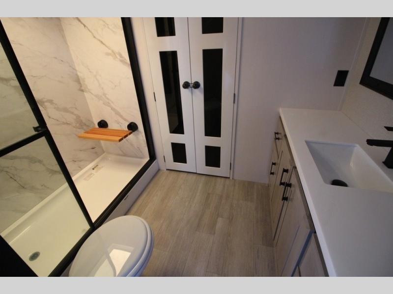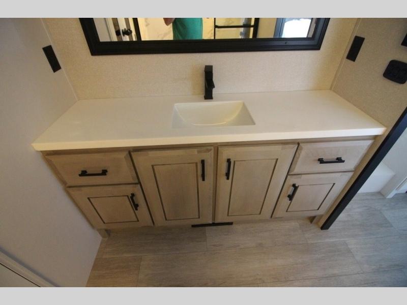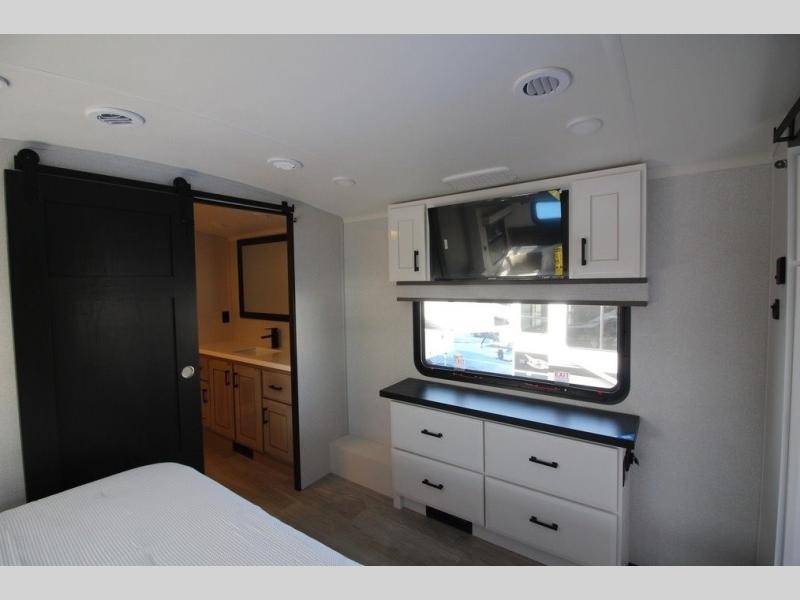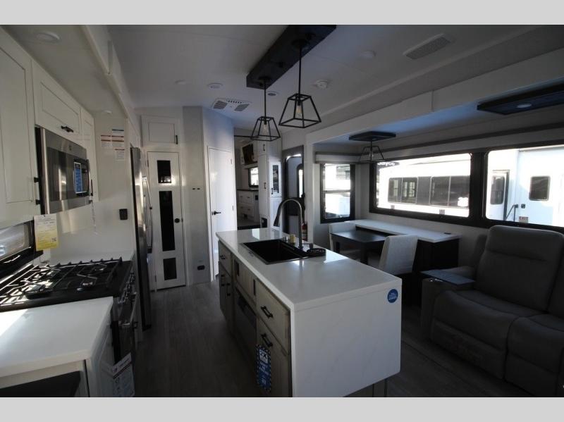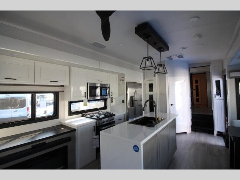 You can't go wrong with this fifth wheel that can sleep four! You will love how much space you have in the main living area thanks to the dual opposing slides, and there is a kitchen island here with a pull-out extension for added prep space. The convenient half bath is right off of the kitchen for quick restroom breaks, and you'll find a shoe garage and a wardrobe just as you enter the unit to keep the RV tidy. Head to the master bedroom for a rest on the king bed slide out, or you may want to watch a show on the 32" bedroom TV. The front master bath may be your favorite feature of this unit. Here, you'll find dual bath sinks, a walk-in shower with a seat, plus a spacious walk-in closet for your clothes. And don't overlook the exterior with its two power awnings, 32" exterior TV, and a Jayport with LP quick connect for your outdoor grill.