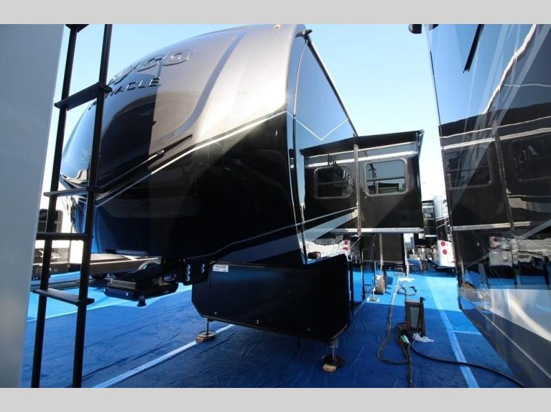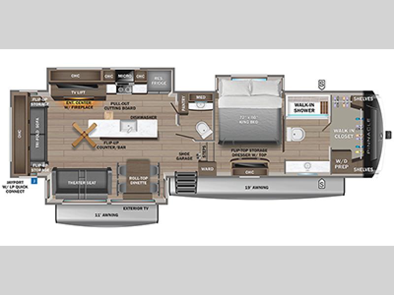 Each Pinnacle fifth wheel features Stronghold VBL lamination for the lightest, yet strongest construction in the RV industry. Add that to the Magnum Truss XL6 roof system and Climate Shield zero-degree tested weather protection and you'll be enjoying your fifth wheel for years to come. Some of the exterior conveniences you will appreciate are the Keyed-Alike lock system, the fully enclosed, universal docking center, and the 6-point hydraulic auto-leveling system for quick and easy set up. The 5 Star Handling Package will make towing a fifth wheel a walk in the park, and the two Whisper Quiet A/C units will keep you comfortable during the hot summer months. Inside, you'll enjoy the residential "Do it all" sink with pull-out kitchen faucet, glass rinse, and vegetable rinse, the handcrafted hardwood glazed cabinetry, the vinyl flooring throughout, plus many more comforts. There is even a central vacuum system, a wireless remote control system, USB ports throughout, plus many more conveniences to make each trip enjoyable.