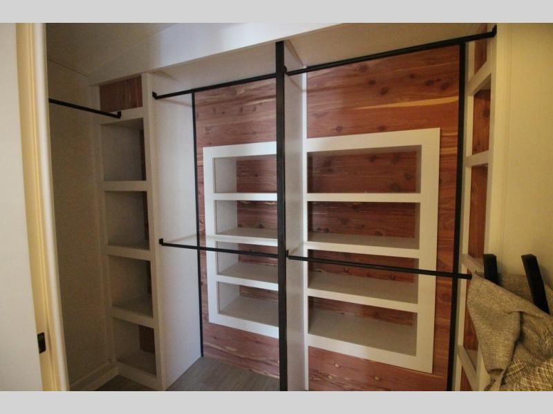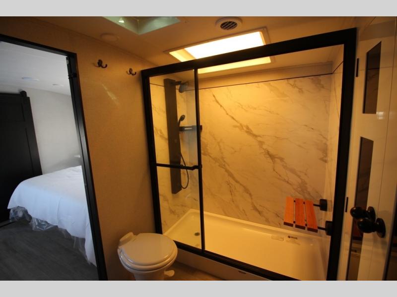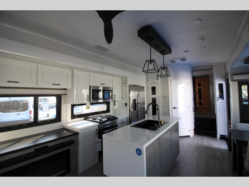 You can't go wrong with this fifth wheel that can sleep four! You will love how much space you have in the main living area thanks to the dual opposing slides, and there is a kitchen island here with a pull-out extension for added prep space. The convenient half bath is right off of the kitchen for quick restroom breaks, and you'll find a shoe garage and a wardrobe just as you enter the unit to keep the RV tidy. Head to the master bedroom for a rest on the king bed slide out, or you may want to watch a show on the 32" bedroom TV. The front master bath may be your favorite feature of this unit. Here, you'll find dual bath sinks, a walk-in shower with a seat, plus a spacious walk-in closet for your clothes. And don't overlook the exterior with its two power awnings, 32" exterior TV, and a Jayport with LP quick connect for your outdoor grill.