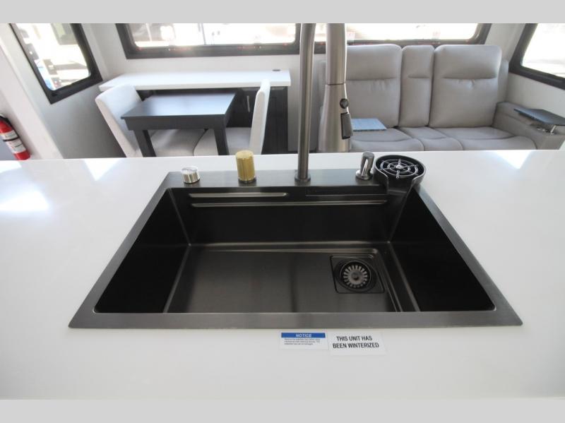 Each Pinnacle fifth wheel features Stronghold VBL lamination for the lightest, yet strongest construction in the RV industry. Add that to the Magnum Truss XL6 roof system and Climate Shield zero-degree tested weather protection and you'll be enjoying your fifth wheel for years to come. Some of the exterior conveniences you will appreciate are the Keyed-Alike lock system, the fully enclosed, universal docking center, and the 6-point hydraulic auto-leveling system for quick and easy set up. The 5 Star Handling Package will make towing a fifth wheel a walk in the park, and the two Whisper Quiet A/C units will keep you comfortable during the hot summer months. Inside, you'll enjoy the residential "Do it all" sink with pull-out kitchen faucet, glass rinse, and vegetable rinse, the handcrafted hardwood glazed cabinetry, the vinyl flooring throughout, plus many more comforts. There is even a central vacuum system, a wireless remote control system, USB ports throughout, plus many more conveniences to make each trip enjoyable.