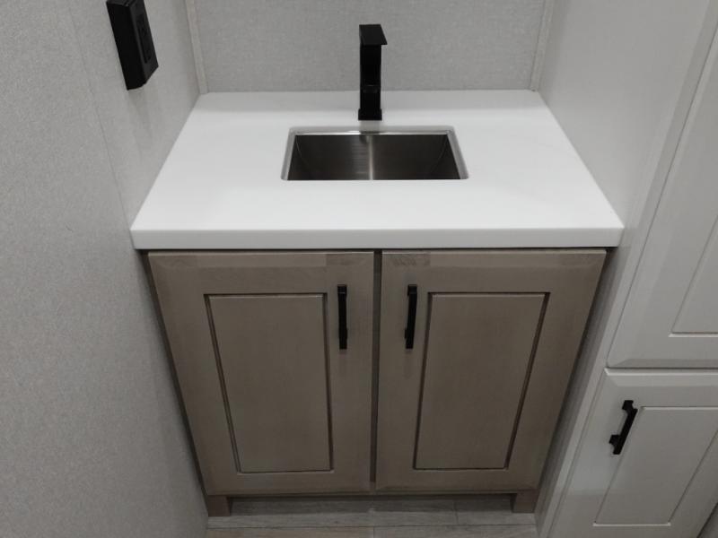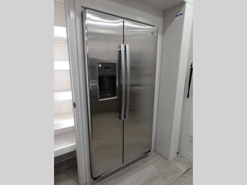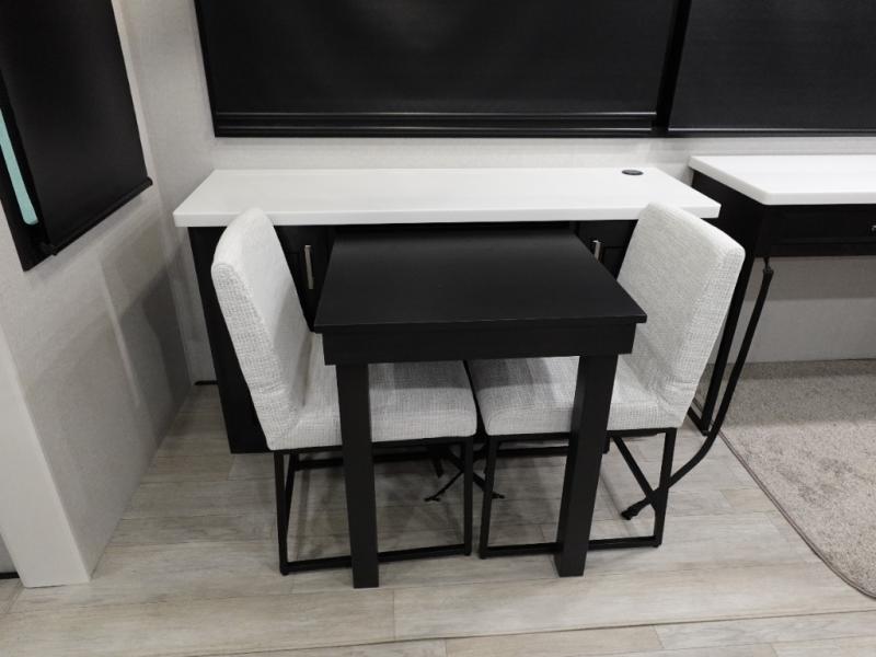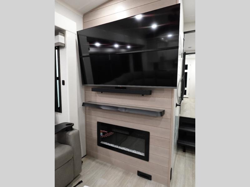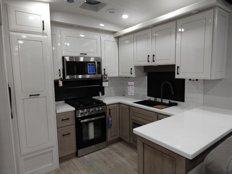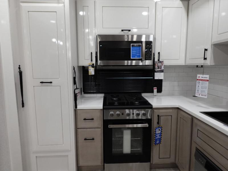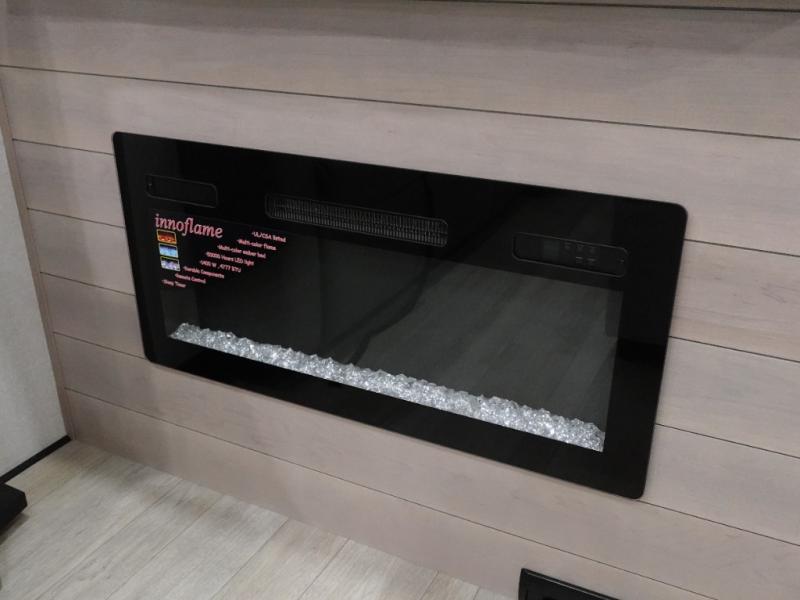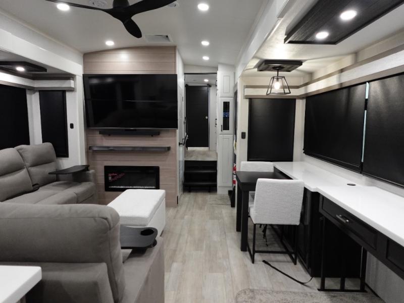 Triples slides, a desk/coffee bar, fireplace, and a huge master bath in front all indicate the kind of vacation you will experience in this Pinnacle Fifth Wheel! As you enter, a convenient half bath is located straight ahead. Slightly to your left, a nice seating area for gathering with family or friends to relax and watch TV, enjoy the fireplace while reading a book or watching a movie, and the dining table with chairs. The dinette slide also houses a 21 cu. ft. residential refrigerator and pantry. The rear kitchen features a u-shaped counter, all the appliances you need to cook like at home, even a pull-out butcher block space for chopping up your veggies. Back through and up the steps to your right in front, the master bedroom will make you feel like royalty with its king bed, plus luxurious full rear bath. A huge vanity with dual bath sinks will allow you both to get ready at the same time, plus there is a walk-in shower with a seat for added convenience. Speaking of walk-in, you will also love the spacious walk-in closet that includes washer/dryer prep.