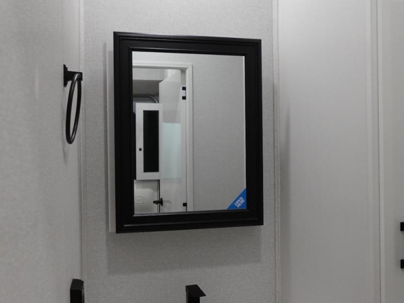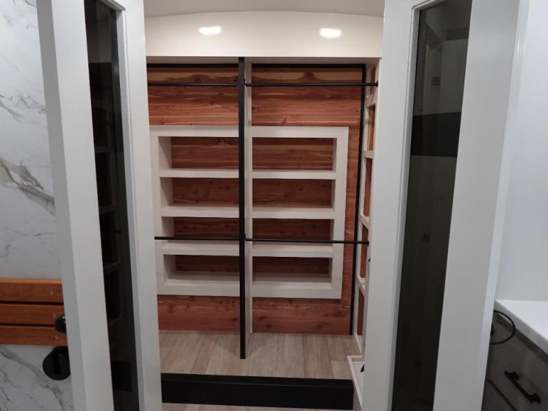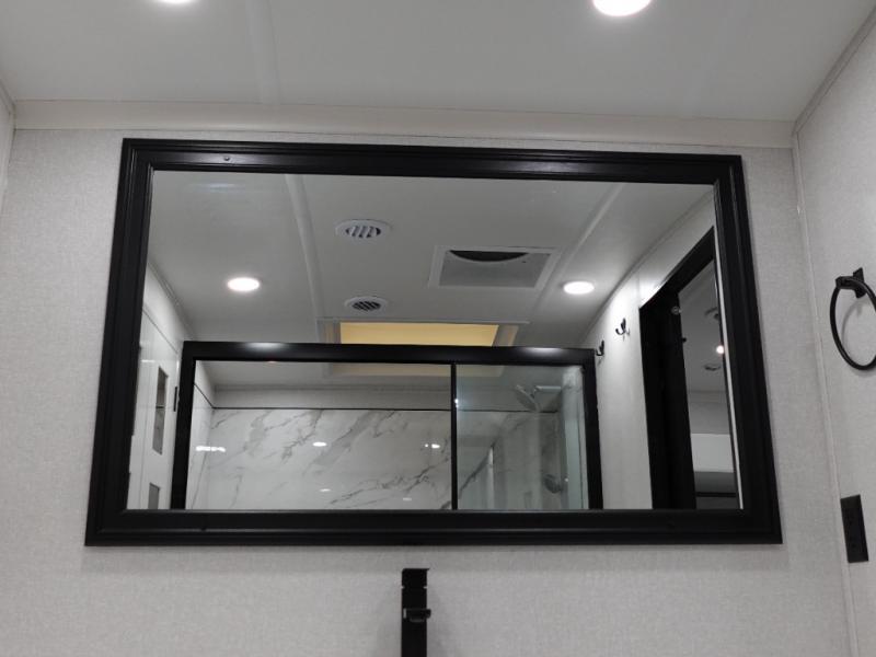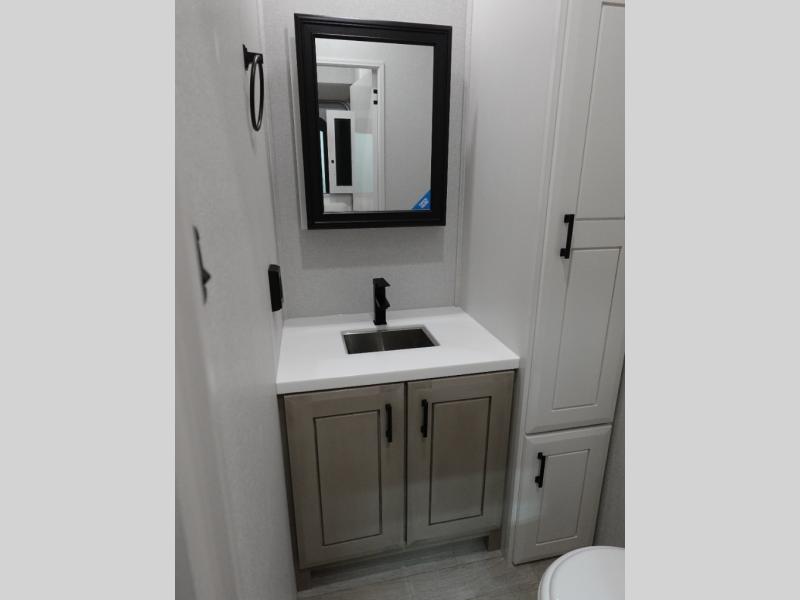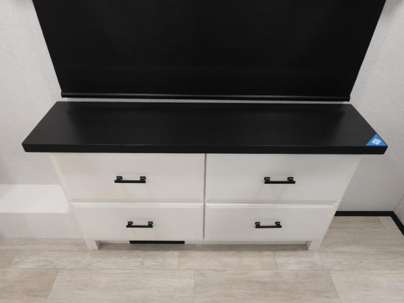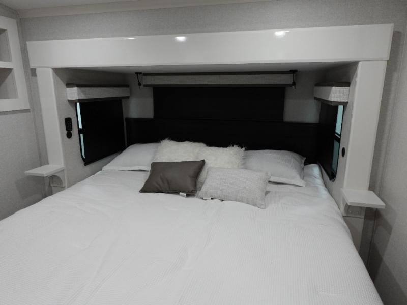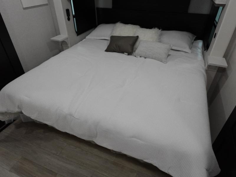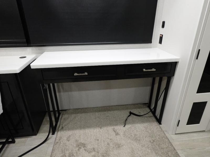 Triples slides, a desk/coffee bar, fireplace, and a huge master bath in front all indicate the kind of vacation you will experience in this Pinnacle Fifth Wheel! As you enter, a convenient half bath is located straight ahead. Slightly to your left, a nice seating area for gathering with family or friends to relax and watch TV, enjoy the fireplace while reading a book or watching a movie, and the dining table with chairs. The dinette slide also houses a 21 cu. ft. residential refrigerator and pantry. The rear kitchen features a u-shaped counter, all the appliances you need to cook like at home, even a pull-out butcher block space for chopping up your veggies. Back through and up the steps to your right in front, the master bedroom will make you feel like royalty with its king bed, plus luxurious full rear bath. A huge vanity with dual bath sinks will allow you both to get ready at the same time, plus there is a walk-in shower with a seat for added convenience. Speaking of walk-in, you will also love the spacious walk-in closet that includes washer/dryer prep.