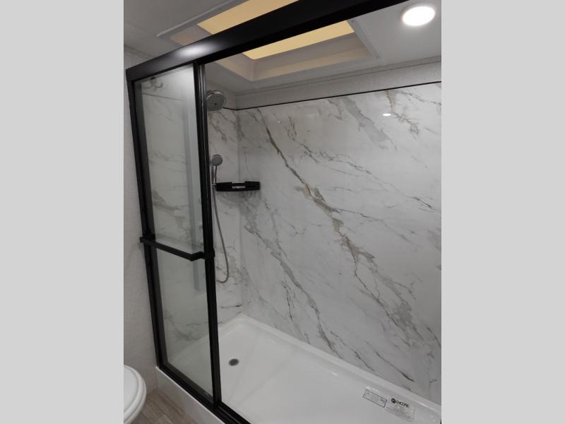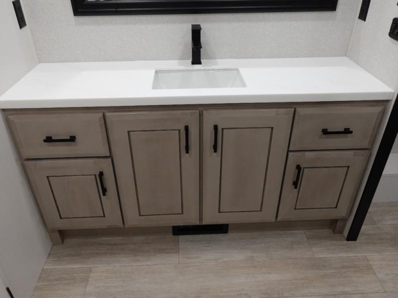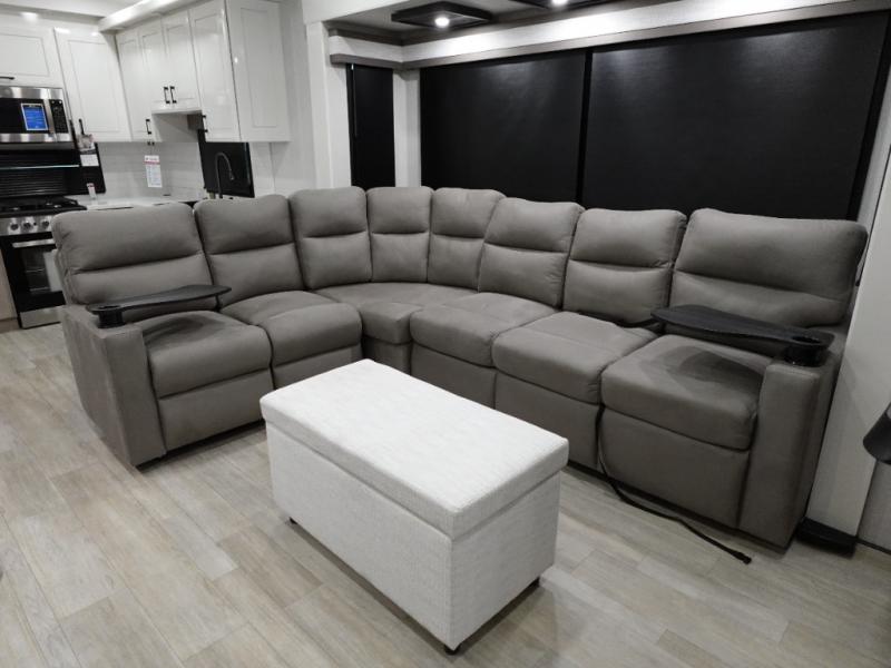 Each Pinnacle fifth wheel features Stronghold VBL lamination for the lightest, yet strongest construction in the RV industry. Add that to the Magnum Truss XL6 roof system and Climate Shield zero-degree tested weather protection and you'll be enjoying your fifth wheel for years to come. Some of the exterior conveniences you will appreciate are the Keyed-Alike lock system, the fully enclosed, universal docking center, and the 6-point hydraulic auto-leveling system for quick and easy set up. The 5 Star Handling Package will make towing a fifth wheel a walk in the park, and the two Whisper Quiet A/C units will keep you comfortable during the hot summer months. Inside, you'll enjoy the residential "Do it all" sink with pull-out kitchen faucet, glass rinse, and vegetable rinse, the handcrafted hardwood glazed cabinetry, the vinyl flooring throughout, plus many more comforts. There is even a central vacuum system, a wireless remote control system, USB ports throughout, plus many more conveniences to make each trip enjoyable.