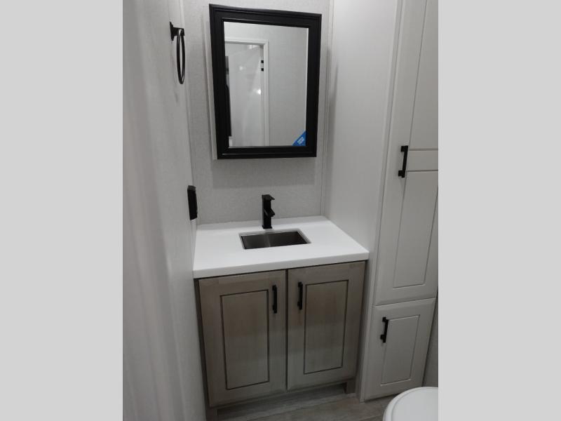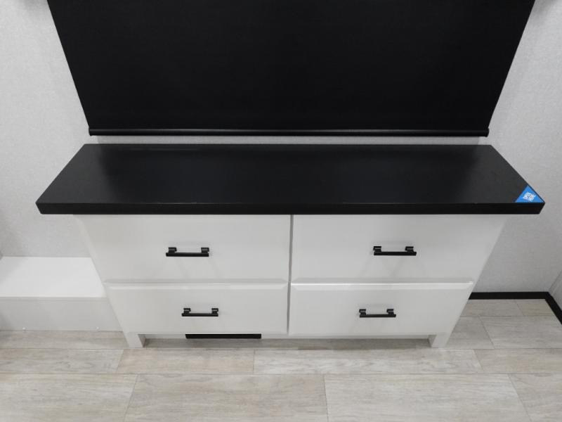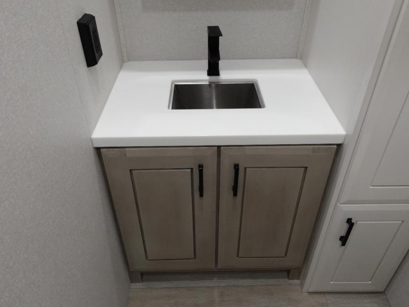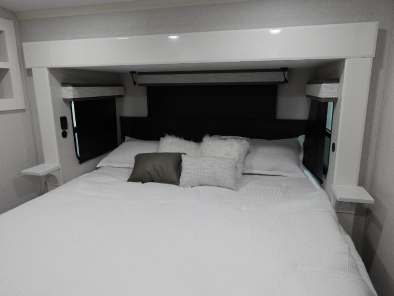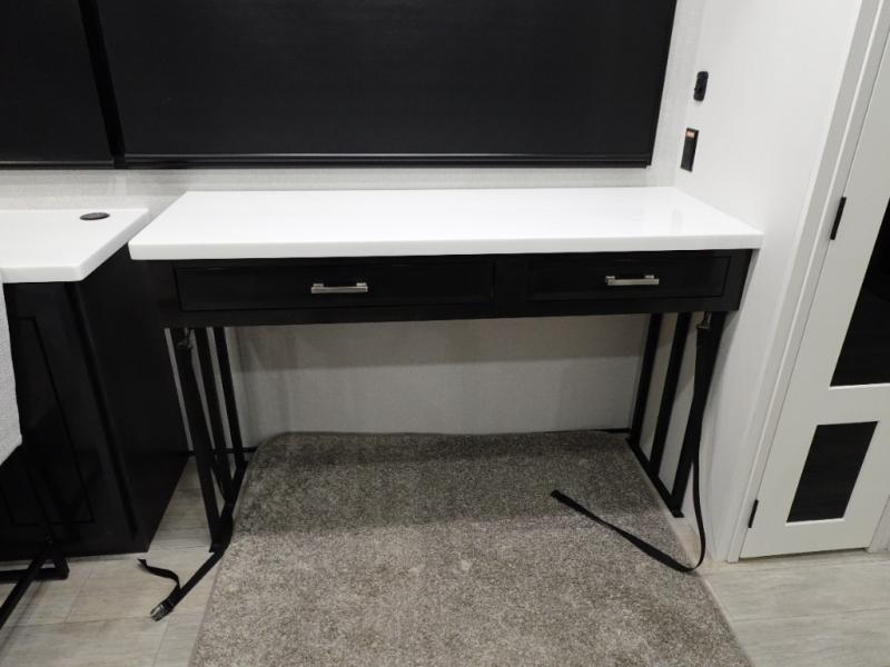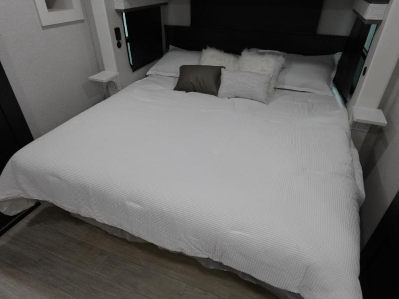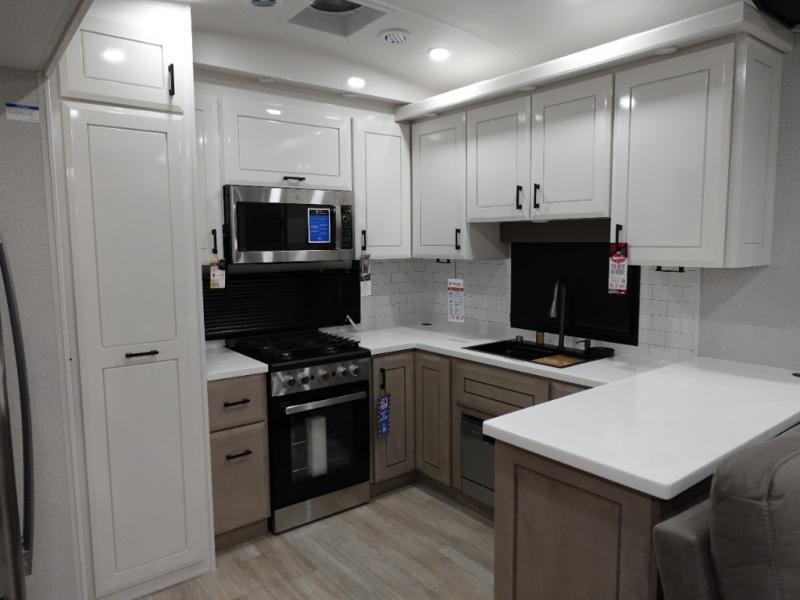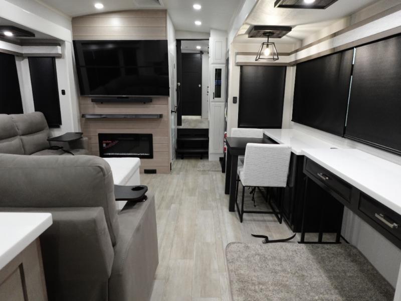 Triples slides, a desk/coffee bar, fireplace, and a huge master bath in front all indicate the kind of vacation you will experience in this Pinnacle Fifth Wheel! As you enter, a convenient half bath is located straight ahead. Slightly to your left, a nice seating area for gathering with family or friends to relax and watch TV, enjoy the fireplace while reading a book or watching a movie, and the dining table with chairs. The dinette slide also houses a 21 cu. ft. residential refrigerator and pantry. The rear kitchen features a u-shaped counter, all the appliances you need to cook like at home, even a pull-out butcher block space for chopping up your veggies. Back through and up the steps to your right in front, the master bedroom will make you feel like royalty with its king bed, plus luxurious full rear bath. A huge vanity with dual bath sinks will allow you both to get ready at the same time, plus there is a walk-in shower with a seat for added convenience. Speaking of walk-in, you will also love the spacious walk-in closet that includes washer/dryer prep.