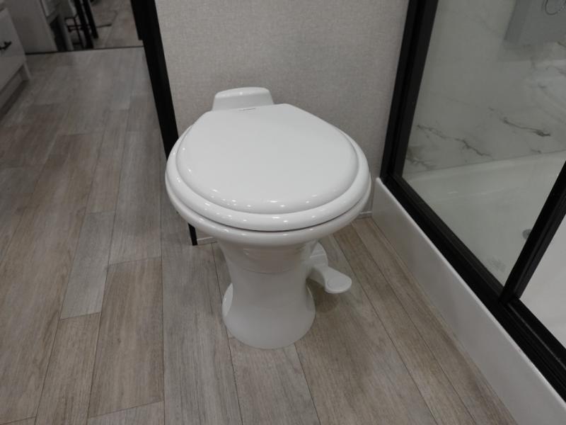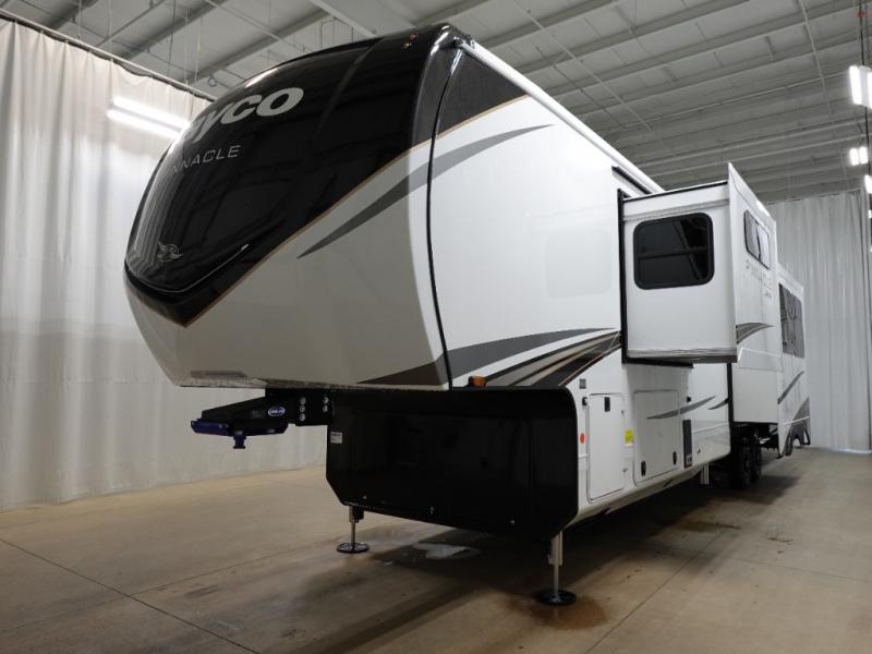 Each Pinnacle fifth wheel features Stronghold VBL lamination for the lightest, yet strongest construction in the RV industry. Add that to the Magnum Truss XL6 roof system and Climate Shield zero-degree tested weather protection and you'll be enjoying your fifth wheel for years to come. Some of the exterior conveniences you will appreciate are the Keyed-Alike lock system, the fully enclosed, universal docking center, and the 6-point hydraulic auto-leveling system for quick and easy set up. The 5 Star Handling Package will make towing a fifth wheel a walk in the park, and the two Whisper Quiet A/C units will keep you comfortable during the hot summer months. Inside, you'll enjoy the residential "Do it all" sink with pull-out kitchen faucet, glass rinse, and vegetable rinse, the handcrafted hardwood glazed cabinetry, the vinyl flooring throughout, plus many more comforts. There is even a central vacuum system, a wireless remote control system, USB ports throughout, plus many more conveniences to make each trip enjoyable.