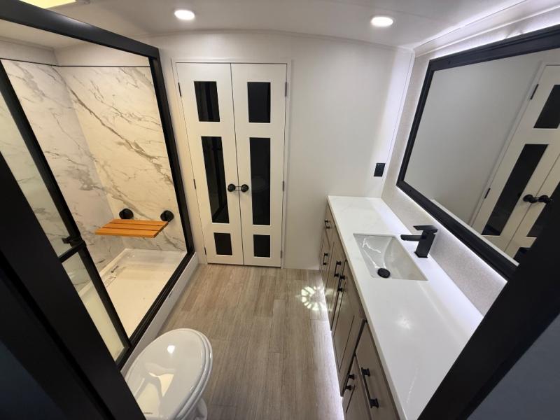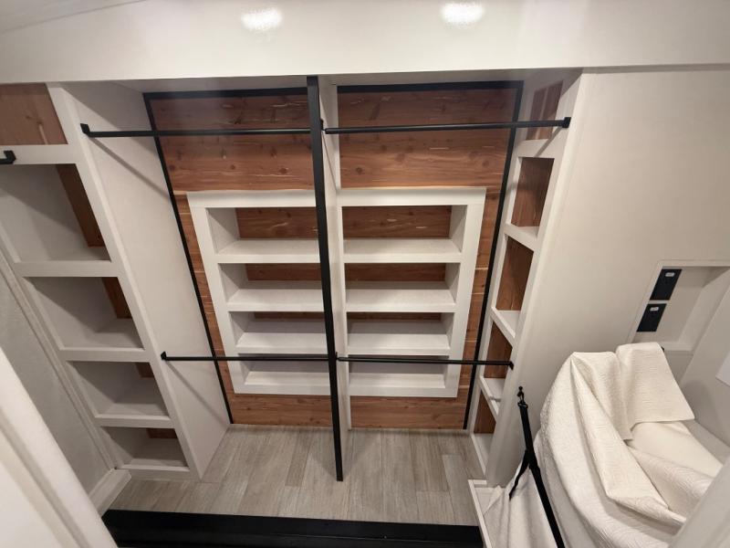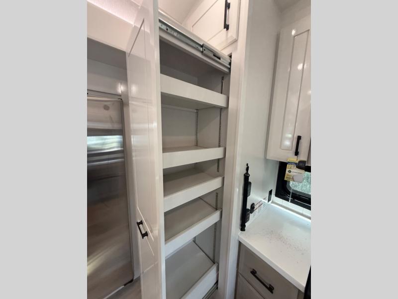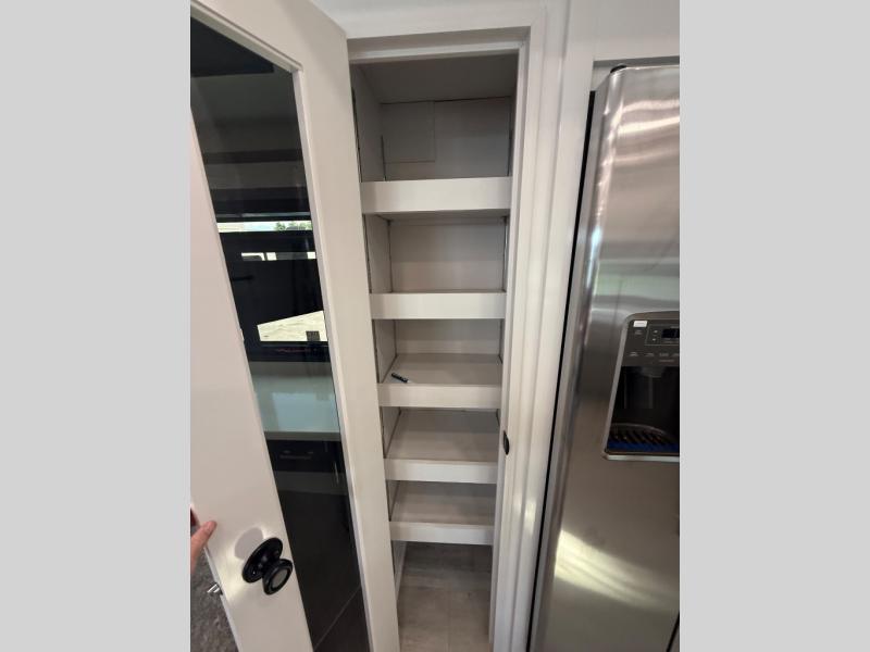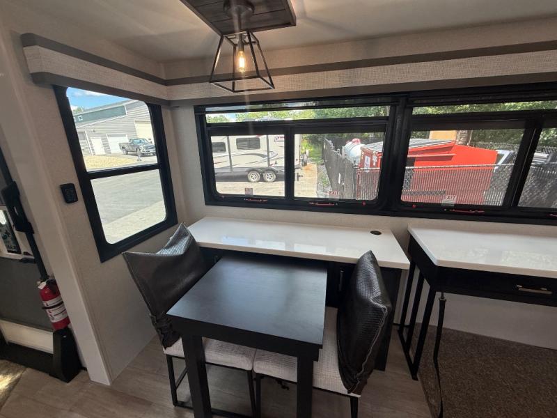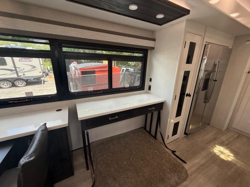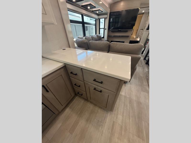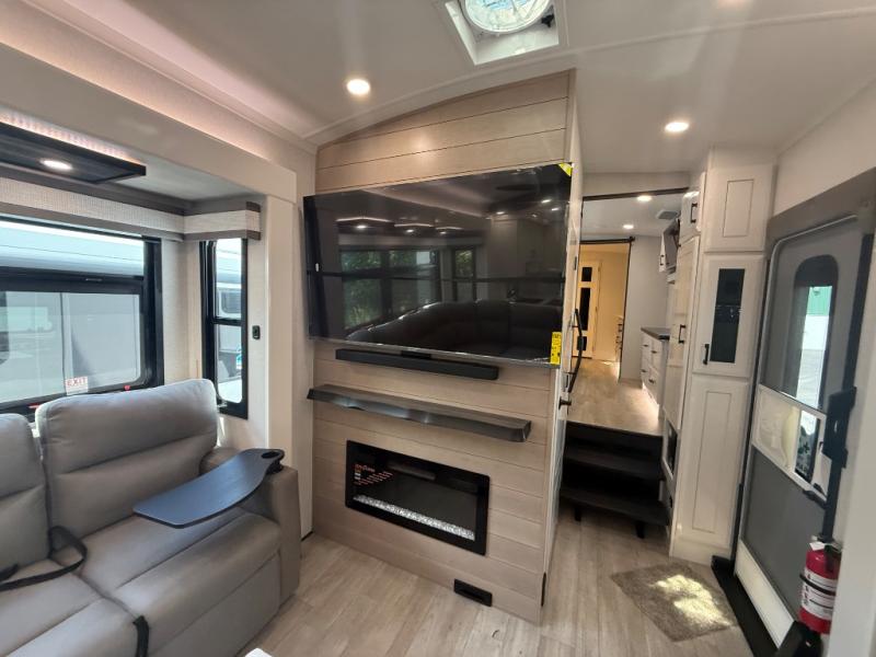 Triples slides, a desk/coffee bar, fireplace, and a huge master bath in front all indicate the kind of vacation you will experience in this Pinnacle Fifth Wheel! As you enter, a convenient half bath is located straight ahead. Slightly to your left, a nice seating area for gathering with family or friends to relax and watch TV, enjoy the fireplace while reading a book or watching a movie, and the dining table with chairs. The dinette slide also houses a 21 cu. ft. residential refrigerator and pantry. The rear kitchen features a u-shaped counter, all the appliances you need to cook like at home, even a pull-out butcher block space for chopping up your veggies. Back through and up the steps to your right in front, the master bedroom will make you feel like royalty with its king bed, plus luxurious full rear bath. A huge vanity with dual bath sinks will allow you both to get ready at the same time, plus there is a walk-in shower with a seat for added convenience. Speaking of walk-in, you will also love the spacious walk-in closet that includes washer/dryer prep.
