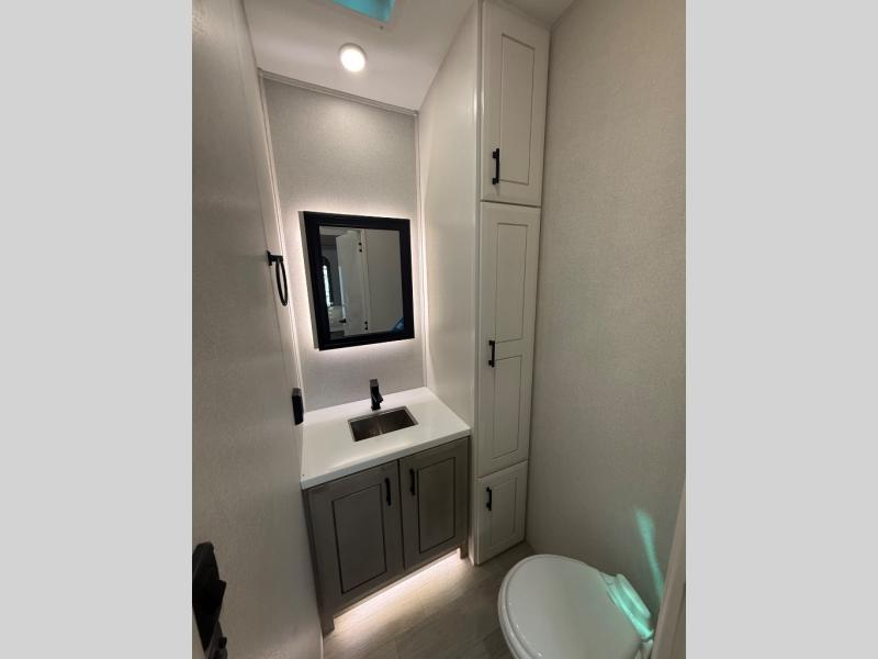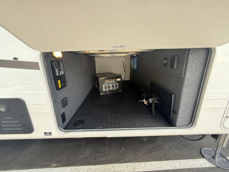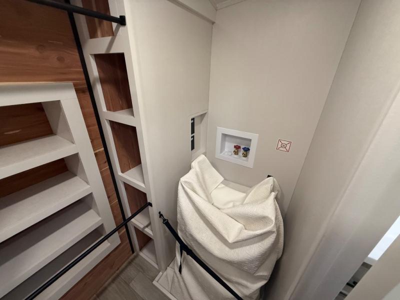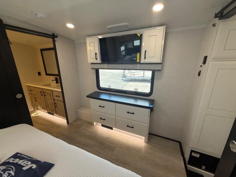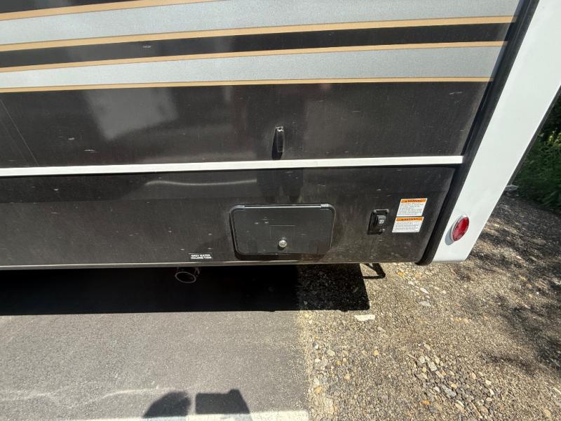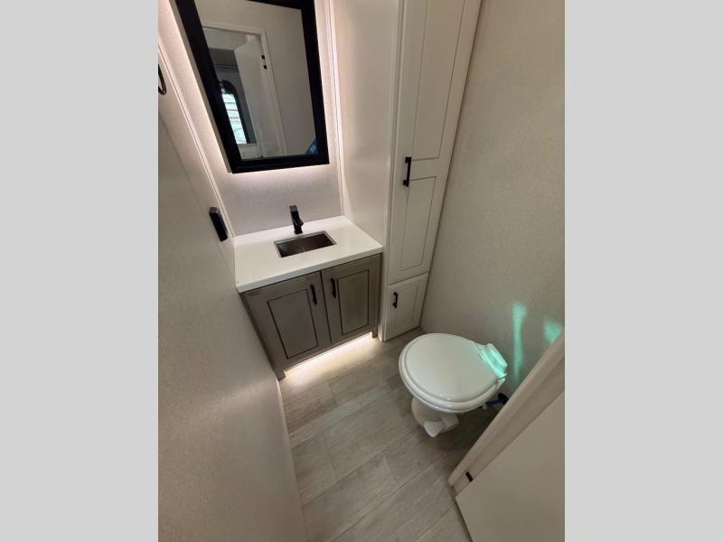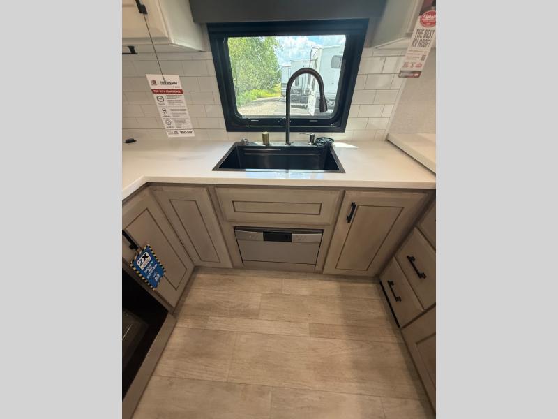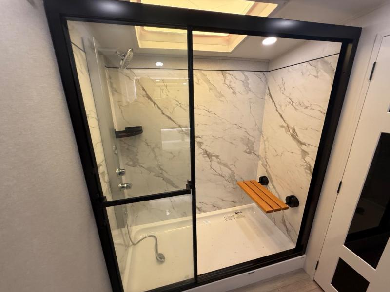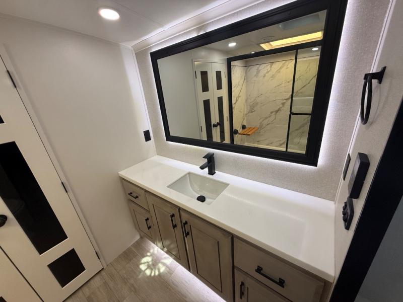 Triples slides, a desk/coffee bar, fireplace, and a huge master bath in front all indicate the kind of vacation you will experience in this Pinnacle Fifth Wheel! As you enter, a convenient half bath is located straight ahead. Slightly to your left, a nice seating area for gathering with family or friends to relax and watch TV, enjoy the fireplace while reading a book or watching a movie, and the dining table with chairs. The dinette slide also houses a 21 cu. ft. residential refrigerator and pantry. The rear kitchen features a u-shaped counter, all the appliances you need to cook like at home, even a pull-out butcher block space for chopping up your veggies. Back through and up the steps to your right in front, the master bedroom will make you feel like royalty with its king bed, plus luxurious full rear bath. A huge vanity with dual bath sinks will allow you both to get ready at the same time, plus there is a walk-in shower with a seat for added convenience. Speaking of walk-in, you will also love the spacious walk-in closet that includes washer/dryer prep.