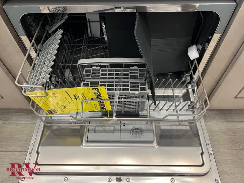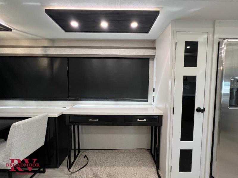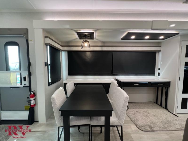 Triples slides, a desk/coffee bar, fireplace, and a huge master bath in front all indicate the kind of vacation you will experience in this Pinnacle Fifth Wheel! As you enter, a convenient half bath is located straight ahead. Slightly to your left, a nice seating area for gathering with family or friends to relax and watch TV, enjoy the fireplace while reading a book or watching a movie, and the dining table with chairs. The dinette slide also houses a 21 cu. ft. residential refrigerator and pantry. The rear kitchen features a u-shaped counter, all the appliances you need to cook like at home, even a pull-out butcher block space for chopping up your veggies. Back through and up the steps to your right in front, the master bedroom will make you feel like royalty with its king bed, plus luxurious full rear bath. A huge vanity with dual bath sinks will allow you both to get ready at the same time, plus there is a walk-in shower with a seat for added convenience. Speaking of walk-in, you will also love the spacious walk-in closet that includes washer/dryer prep.