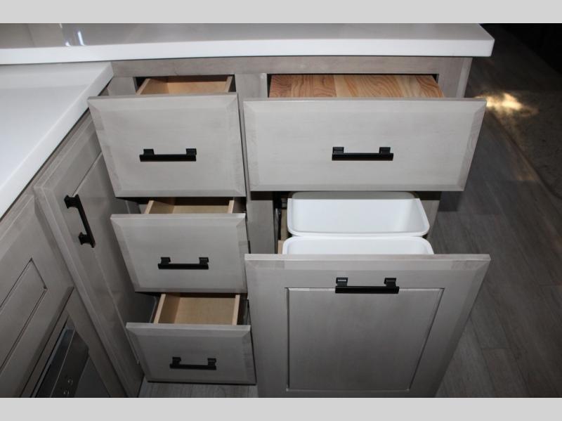 Each Pinnacle fifth wheel features Stronghold VBL lamination for the lightest, yet strongest construction in the RV industry. Add that to the Magnum Truss XL6 roof system and Climate Shield zero-degree tested weather protection and you'll be enjoying your fifth wheel for years to come. Some of the exterior conveniences you will appreciate are the Keyed-Alike lock system, the fully enclosed, universal docking center, and the 6-point hydraulic auto-leveling system for quick and easy set up. The 5 Star Handling Package will make towing a fifth wheel a walk in the park, and the two Whisper Quiet A/C units will keep you comfortable during the hot summer months. Inside, you'll enjoy the residential "Do it all" sink with pull-out kitchen faucet, glass rinse, and vegetable rinse, the handcrafted hardwood glazed cabinetry, the vinyl flooring throughout, plus many more comforts. There is even a central vacuum system, a wireless remote control system, USB ports throughout, plus many more conveniences to make each trip enjoyable.