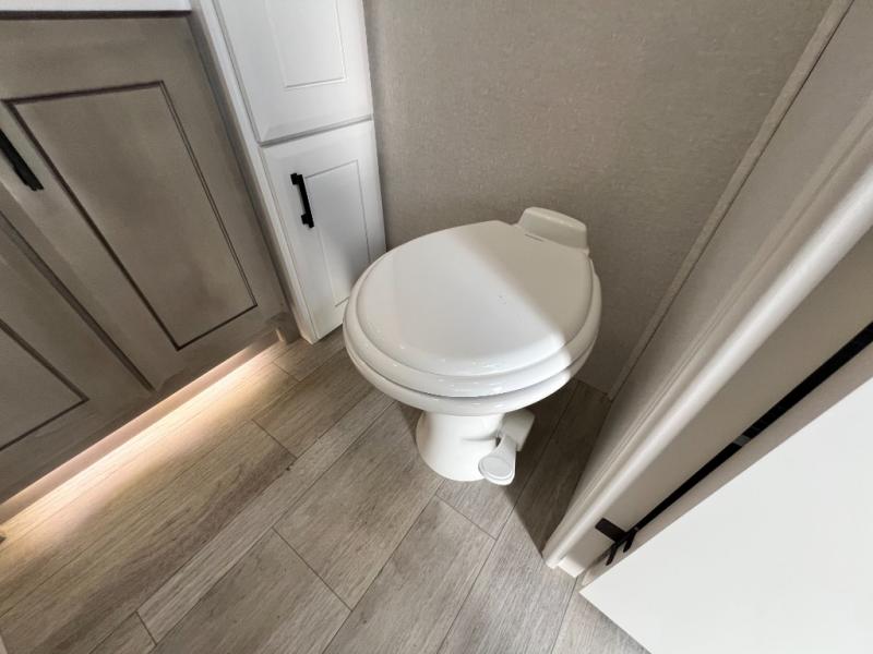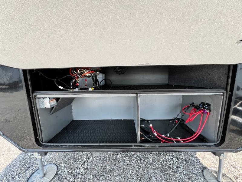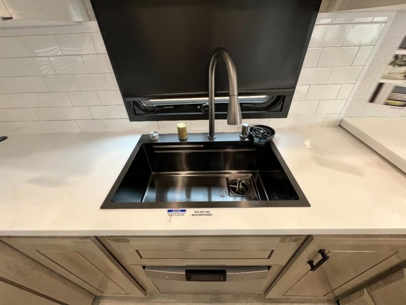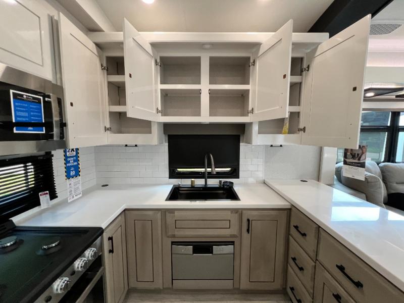 Each Pinnacle fifth wheel features Stronghold VBL lamination for the lightest, yet strongest construction in the RV industry. Add that to the Magnum Truss XL6 roof system and Climate Shield zero-degree tested weather protection and you'll be enjoying your fifth wheel for years to come. Some of the exterior conveniences you will appreciate are the Keyed-Alike lock system, the fully enclosed, universal docking center, and the 6-point hydraulic auto-leveling system for quick and easy set up. The 5 Star Handling Package will make towing a fifth wheel a walk in the park, and the two Whisper Quiet A/C units will keep you comfortable during the hot summer months. Inside, you'll enjoy the residential "Do it all" sink with pull-out kitchen faucet, glass rinse, and vegetable rinse, the handcrafted hardwood glazed cabinetry, the vinyl flooring throughout, plus many more comforts. There is even a central vacuum system, a wireless remote control system, USB ports throughout, plus many more conveniences to make each trip enjoyable.