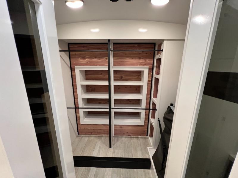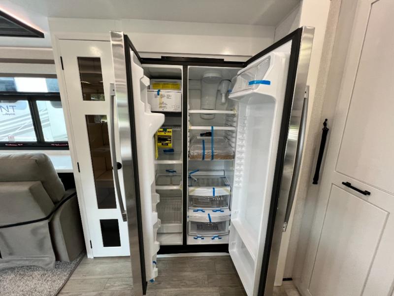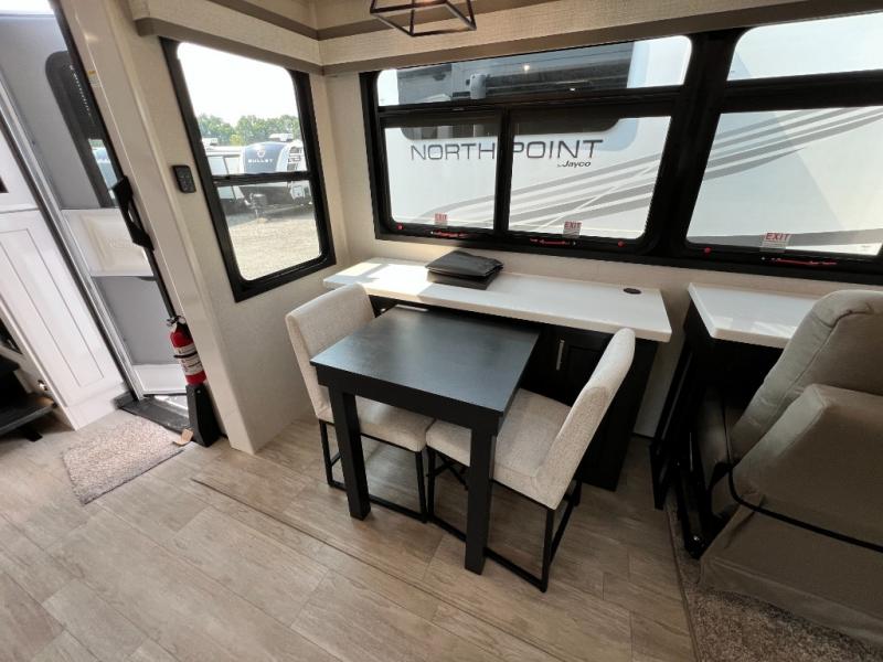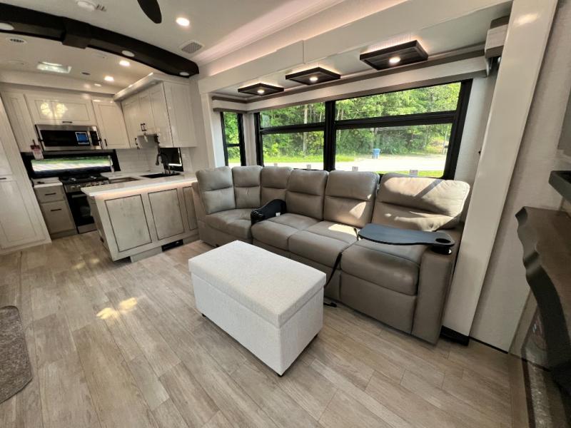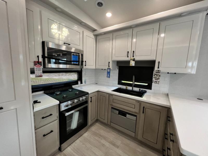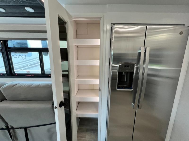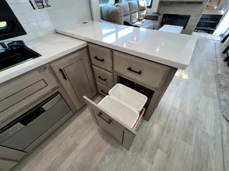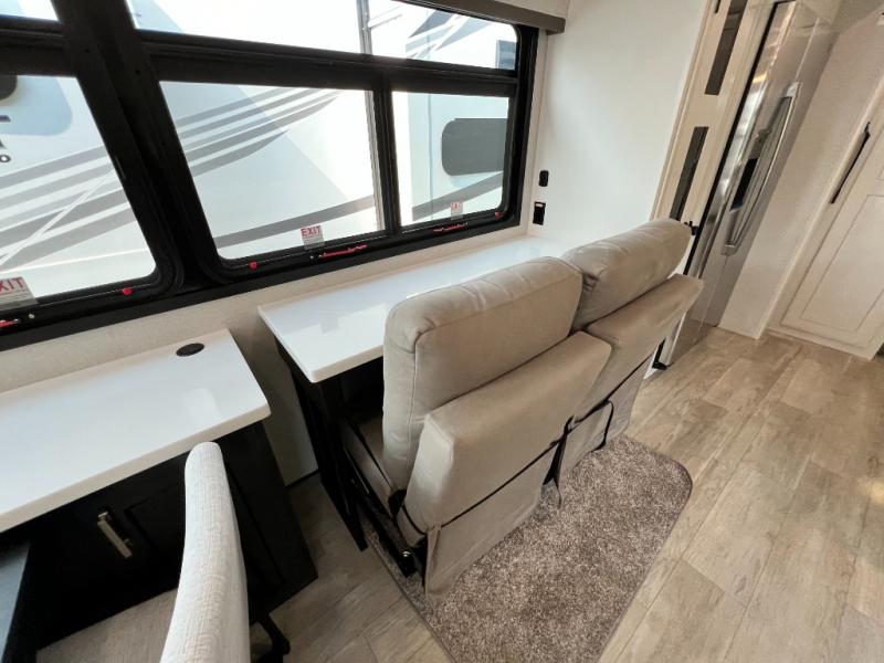 Triples slides, a desk/coffee bar, fireplace, and a huge master bath in front all indicate the kind of vacation you will experience in this Pinnacle Fifth Wheel! As you enter, a convenient half bath is located straight ahead. Slightly to your left, a nice seating area for gathering with family or friends to relax and watch TV, enjoy the fireplace while reading a book or watching a movie, and the dining table with chairs. The dinette slide also houses a 21 cu. ft. residential refrigerator and pantry. The rear kitchen features a u-shaped counter, all the appliances you need to cook like at home, even a pull-out butcher block space for chopping up your veggies. Back through and up the steps to your right in front, the master bedroom will make you feel like royalty with its king bed, plus luxurious full rear bath. A huge vanity with dual bath sinks will allow you both to get ready at the same time, plus there is a walk-in shower with a seat for added convenience. Speaking of walk-in, you will also love the spacious walk-in closet that includes washer/dryer prep.