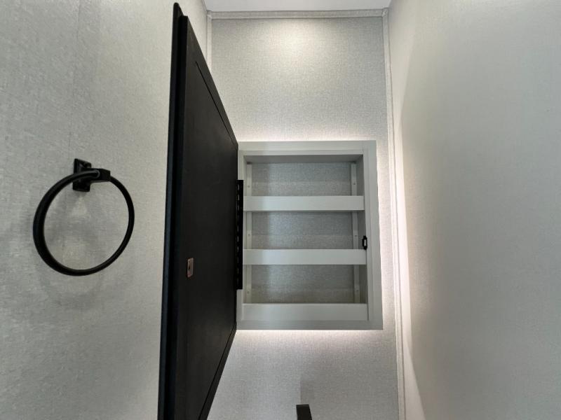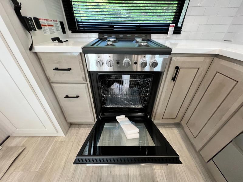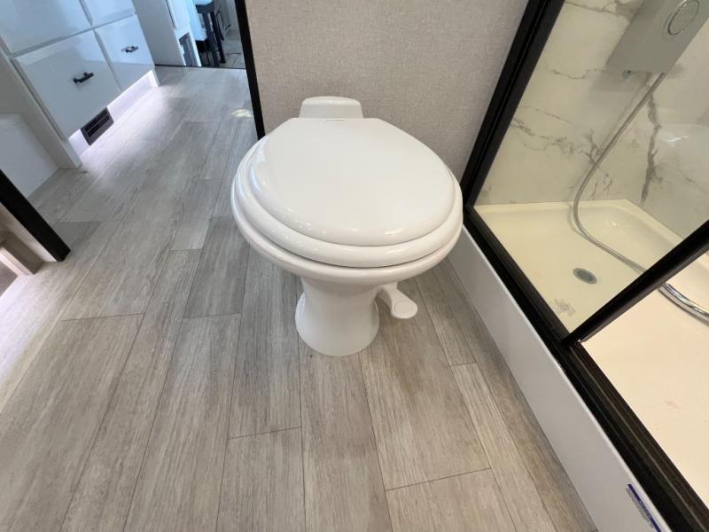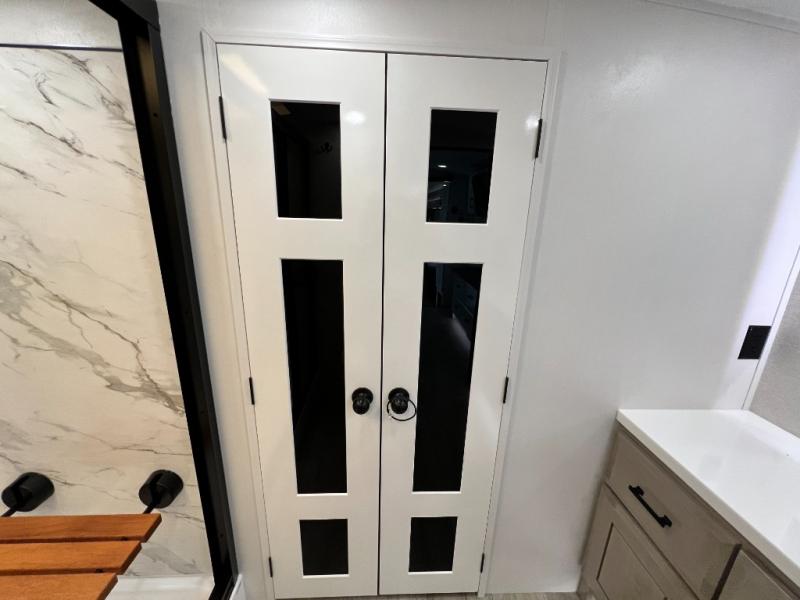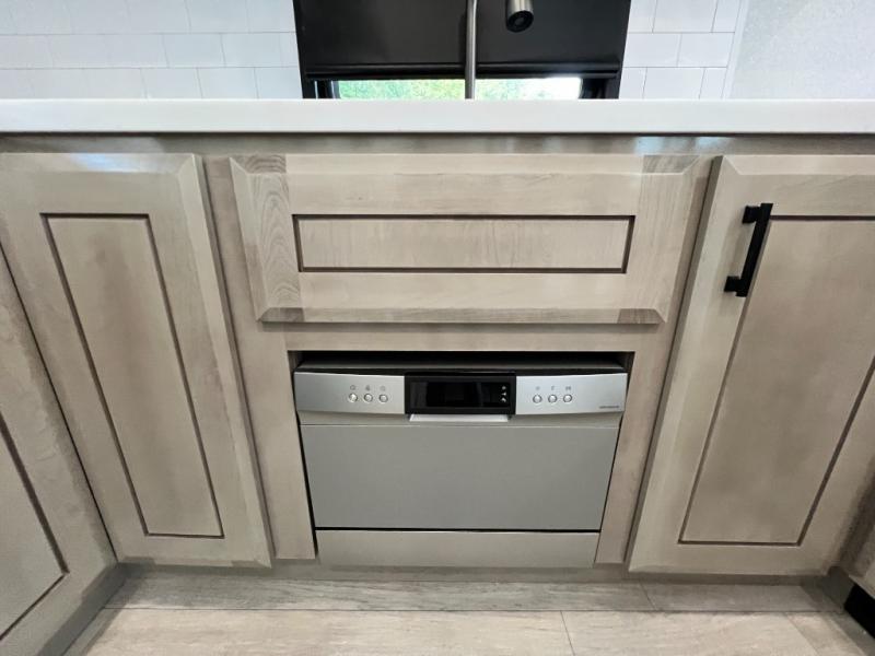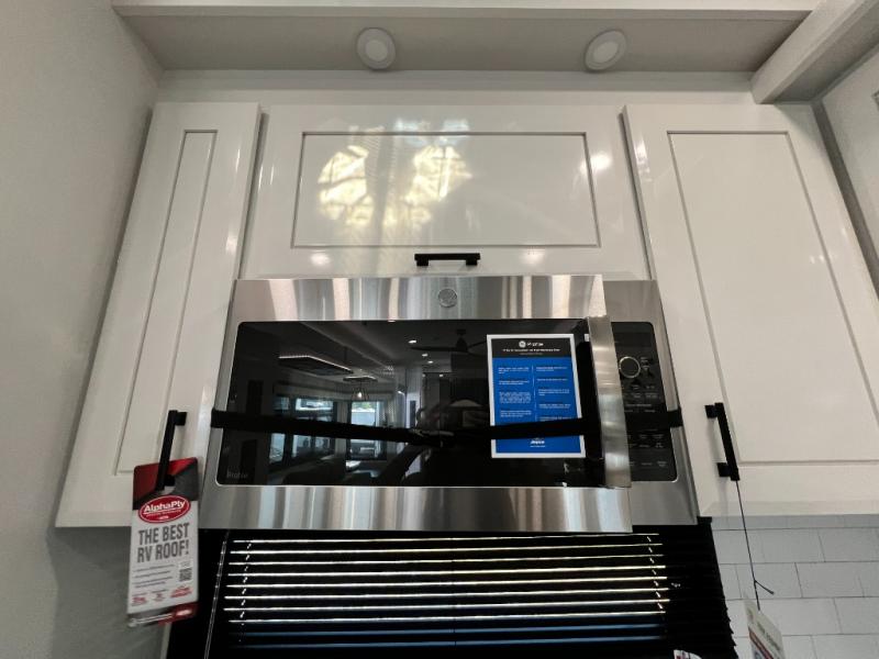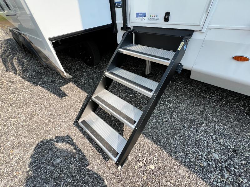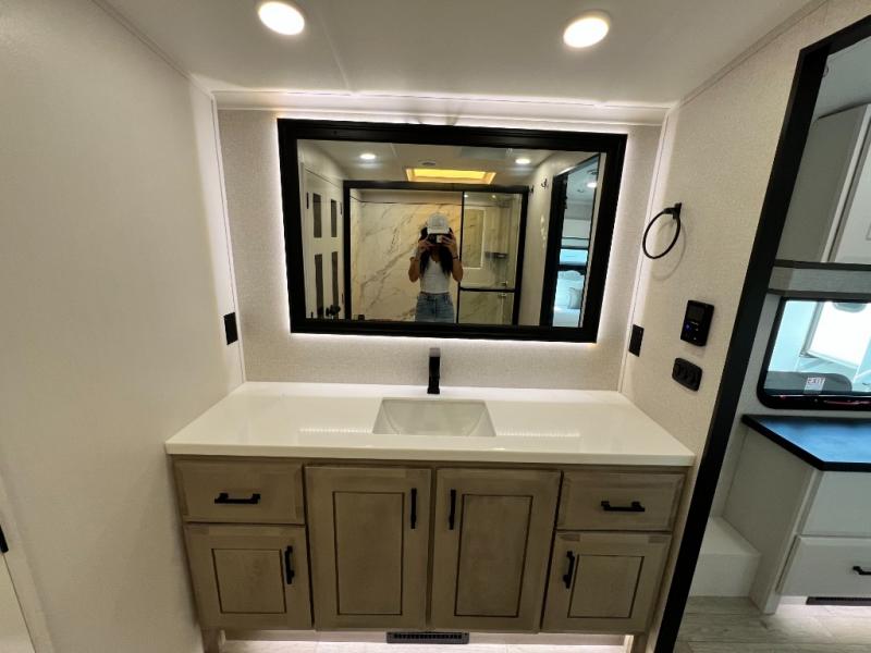 Triples slides, a desk/coffee bar, fireplace, and a huge master bath in front all indicate the kind of vacation you will experience in this Pinnacle Fifth Wheel! As you enter, a convenient half bath is located straight ahead. Slightly to your left, a nice seating area for gathering with family or friends to relax and watch TV, enjoy the fireplace while reading a book or watching a movie, and the dining table with chairs. The dinette slide also houses a 21 cu. ft. residential refrigerator and pantry. The rear kitchen features a u-shaped counter, all the appliances you need to cook like at home, even a pull-out butcher block space for chopping up your veggies. Back through and up the steps to your right in front, the master bedroom will make you feel like royalty with its king bed, plus luxurious full rear bath. A huge vanity with dual bath sinks will allow you both to get ready at the same time, plus there is a walk-in shower with a seat for added convenience. Speaking of walk-in, you will also love the spacious walk-in closet that includes washer/dryer prep.