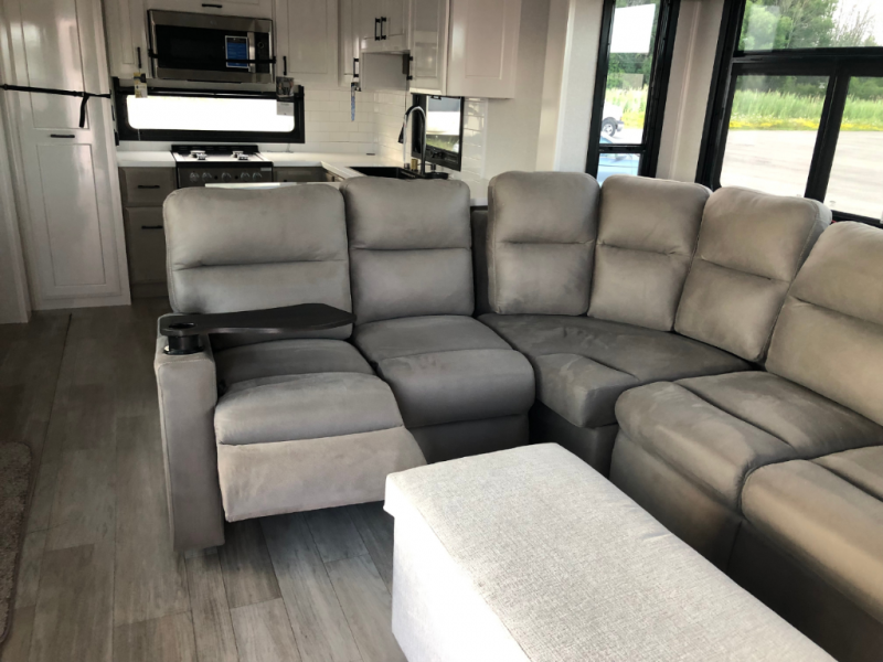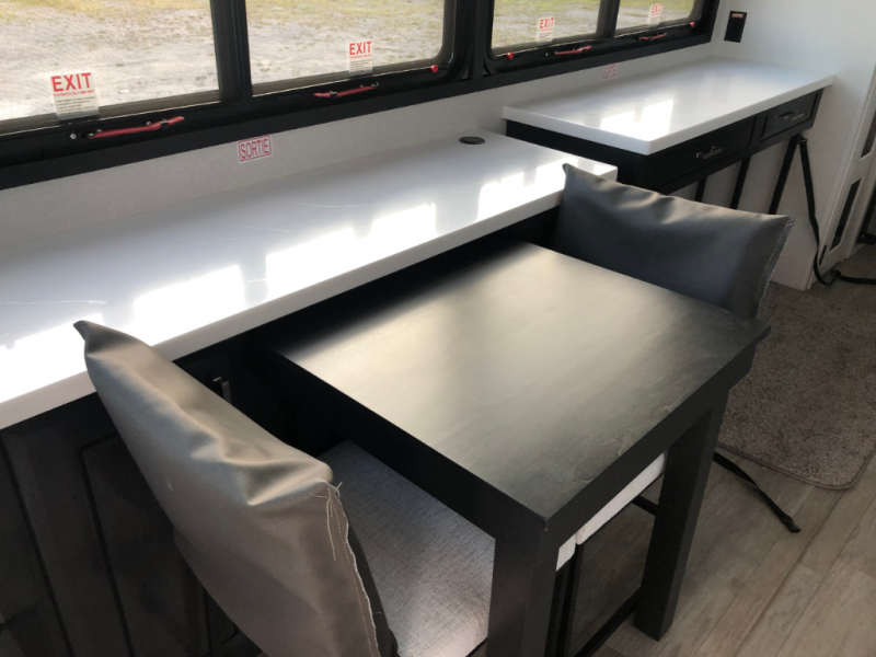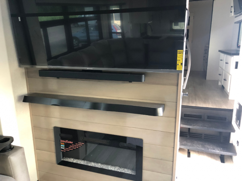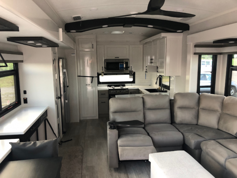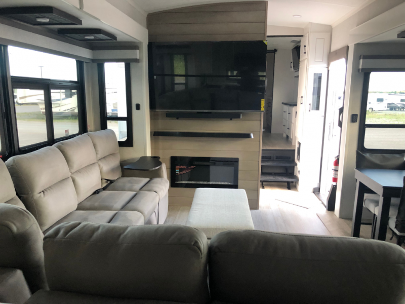 Triples slides, a desk/coffee bar, fireplace, and a huge master bath in front all indicate the kind of vacation you will experience in this Pinnacle Fifth Wheel! As you enter, a convenient half bath is located straight ahead. Slightly to your left, a nice seating area for gathering with family or friends to relax and watch TV, enjoy the fireplace while reading a book or watching a movie, and the dining table with chairs. The dinette slide also houses a 21 cu. ft. residential refrigerator and pantry. The rear kitchen features a u-shaped counter, all the appliances you need to cook like at home, even a pull-out butcher block space for chopping up your veggies. Back through and up the steps to your right in front, the master bedroom will make you feel like royalty with its king bed, plus luxurious full rear bath. A huge vanity with dual bath sinks will allow you both to get ready at the same time, plus there is a walk-in shower with a seat for added convenience. Speaking of walk-in, you will also love the spacious walk-in closet that includes washer/dryer prep.