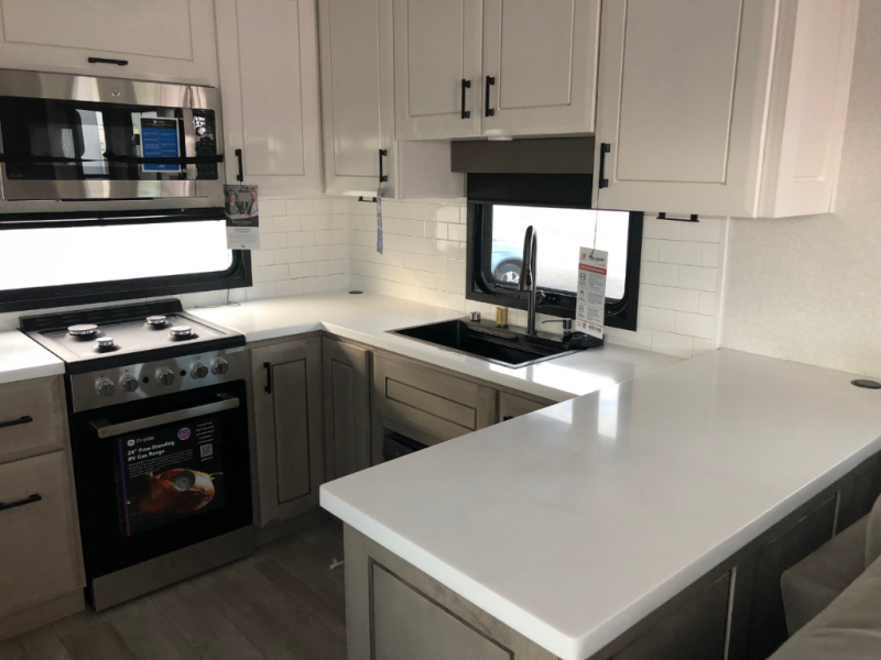 Each Pinnacle fifth wheel features Stronghold VBL lamination for the lightest, yet strongest construction in the RV industry. Add that to the Magnum Truss XL6 roof system and Climate Shield zero-degree tested weather protection and you'll be enjoying your fifth wheel for years to come. Some of the exterior conveniences you will appreciate are the Keyed-Alike lock system, the fully enclosed, universal docking center, and the 6-point hydraulic auto-leveling system for quick and easy set up. The 5 Star Handling Package will make towing a fifth wheel a walk in the park, and the two Whisper Quiet A/C units will keep you comfortable during the hot summer months. Inside, you'll enjoy the residential "Do it all" sink with pull-out kitchen faucet, glass rinse, and vegetable rinse, the handcrafted hardwood glazed cabinetry, the vinyl flooring throughout, plus many more comforts. There is even a central vacuum system, a wireless remote control system, USB ports throughout, plus many more conveniences to make each trip enjoyable.