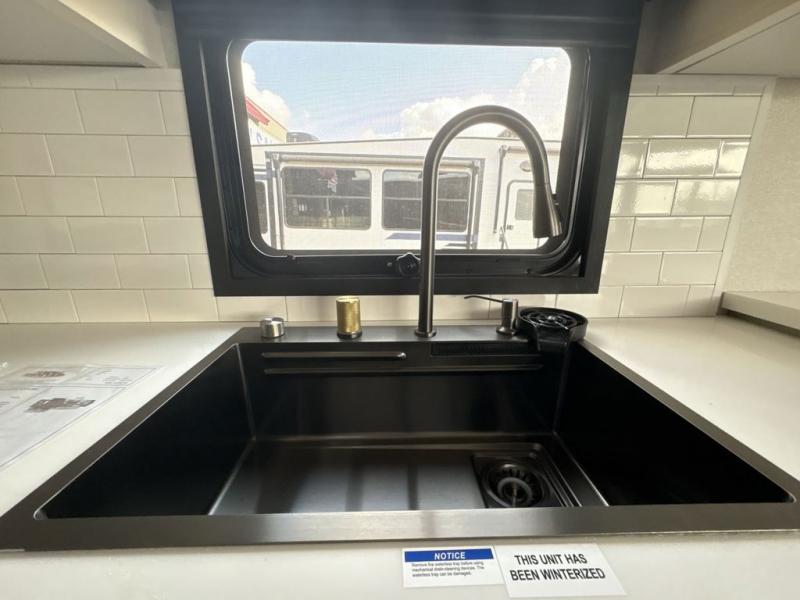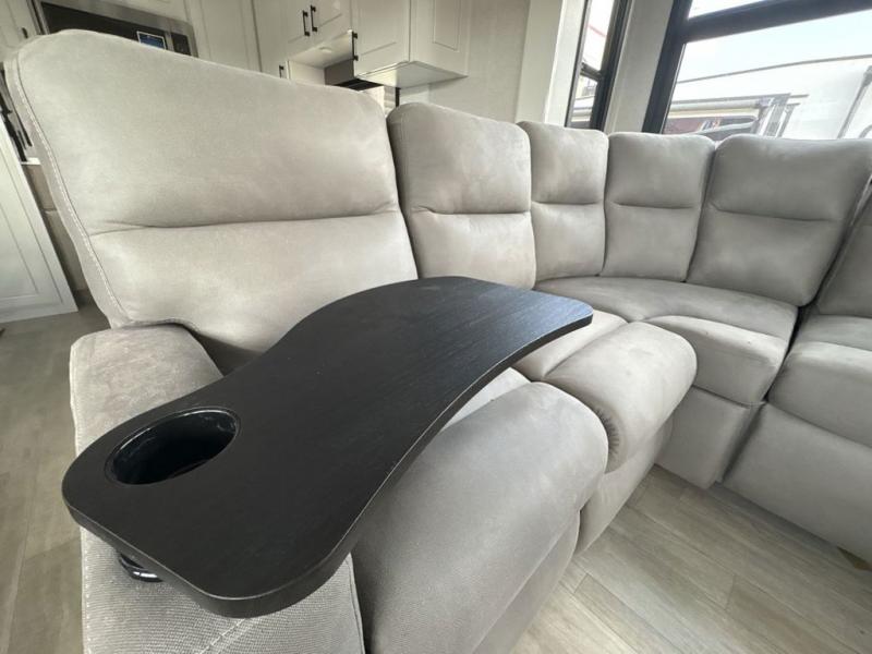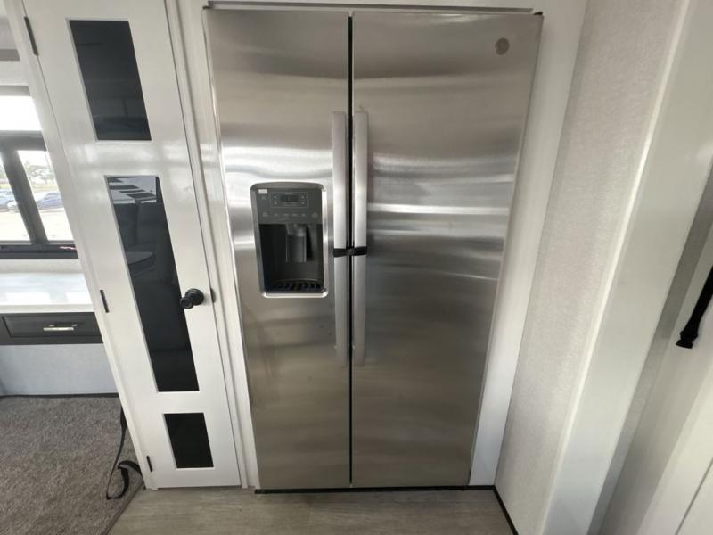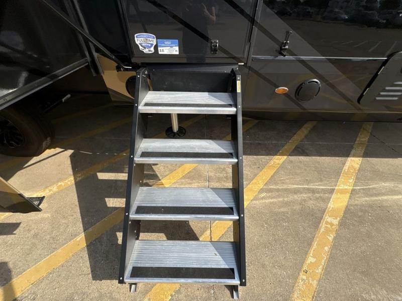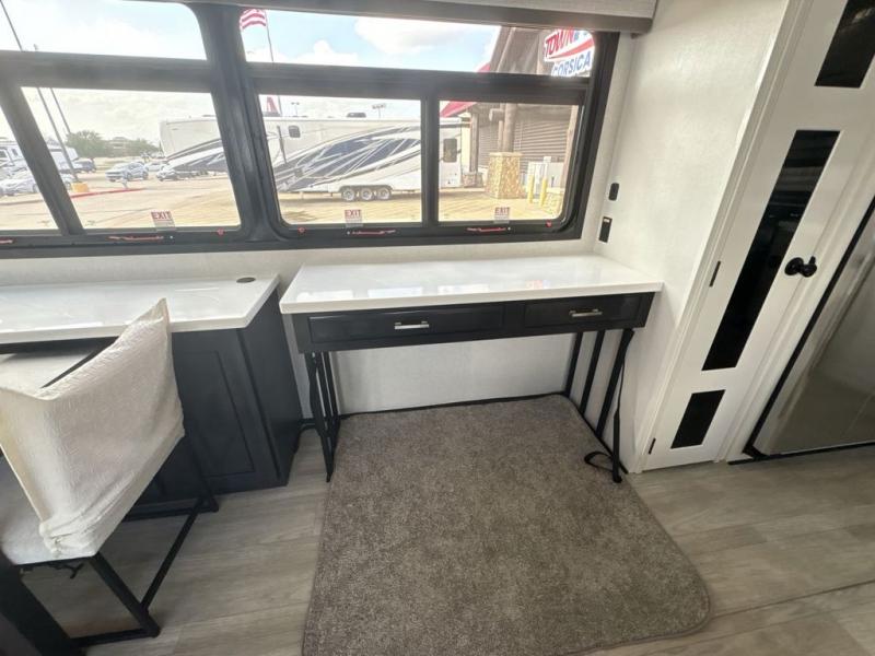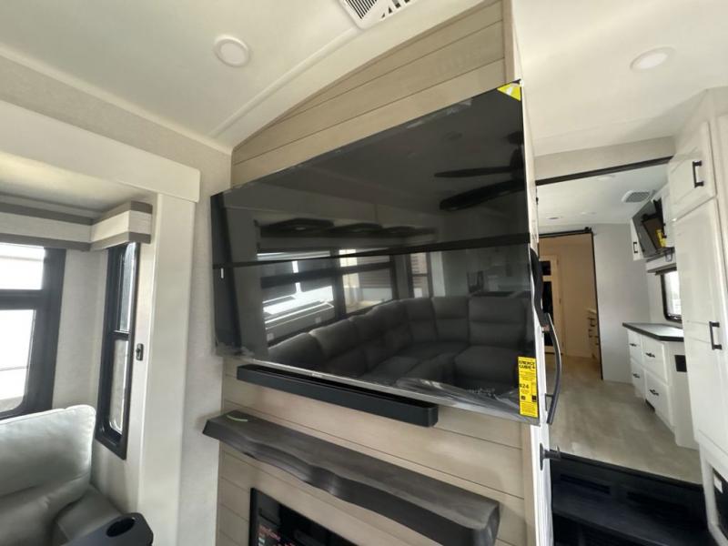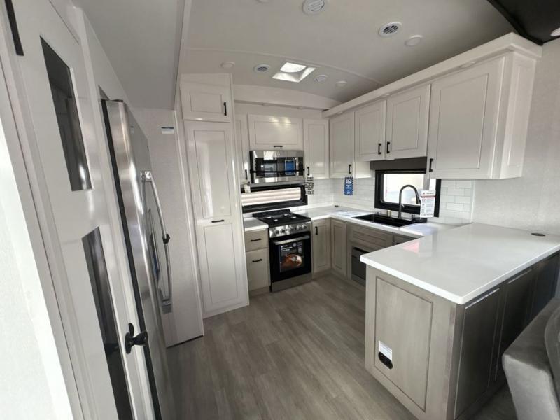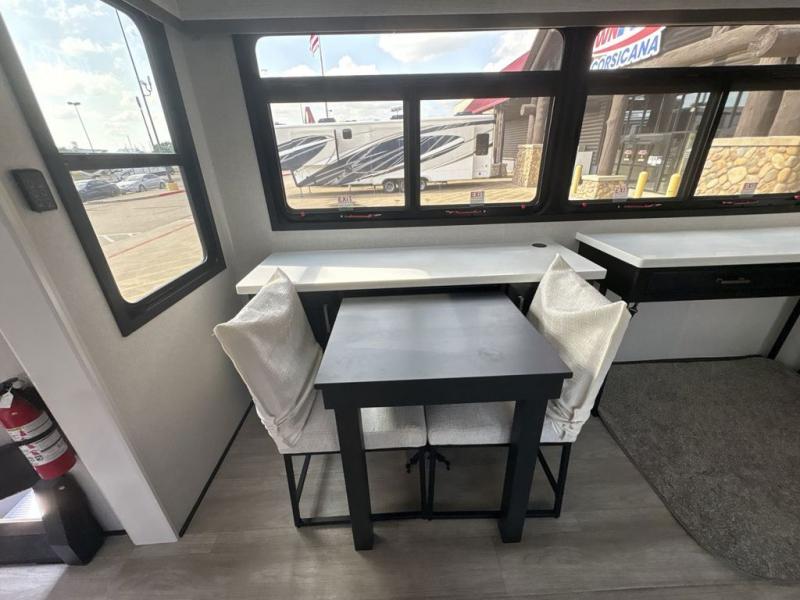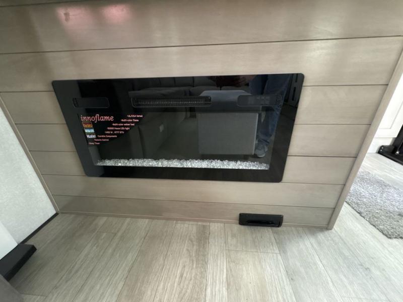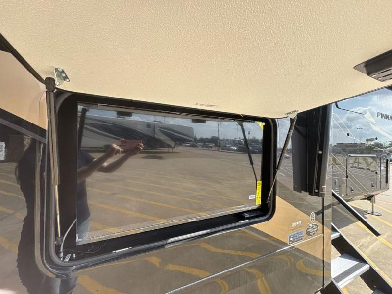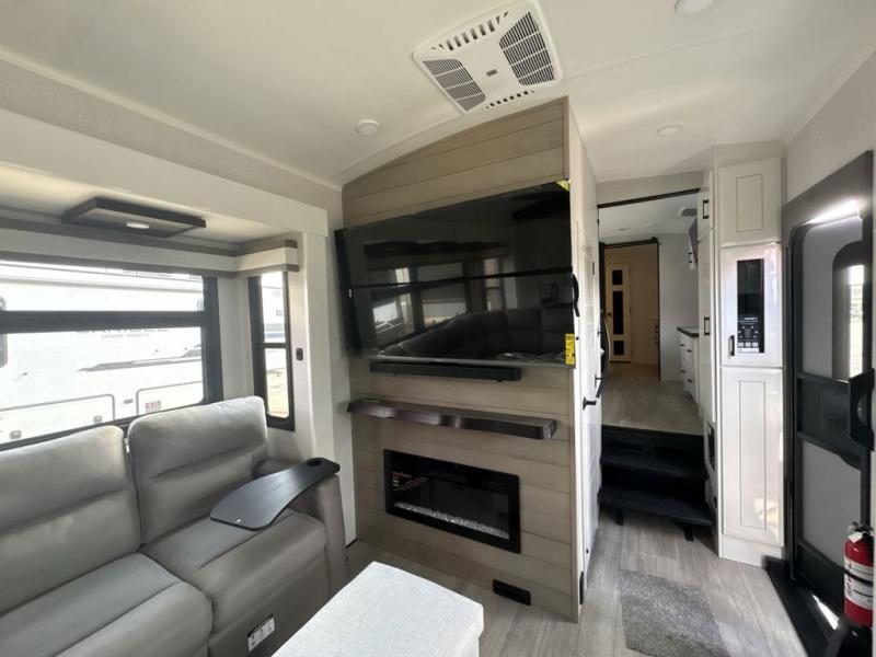 Triples slides, a desk/coffee bar, fireplace, and a huge master bath in front all indicate the kind of vacation you will experience in this Pinnacle Fifth Wheel! As you enter, a convenient half bath is located straight ahead. Slightly to your left, a nice seating area for gathering with family or friends to relax and watch TV, enjoy the fireplace while reading a book or watching a movie, and the dining table with chairs. The dinette slide also houses a 21 cu. ft. residential refrigerator and pantry. The rear kitchen features a u-shaped counter, all the appliances you need to cook like at home, even a pull-out butcher block space for chopping up your veggies. Back through and up the steps to your right in front, the master bedroom will make you feel like royalty with its king bed, plus luxurious full rear bath. A huge vanity with dual bath sinks will allow you both to get ready at the same time, plus there is a walk-in shower with a seat for added convenience. Speaking of walk-in, you will also love the spacious walk-in closet that includes washer/dryer prep.