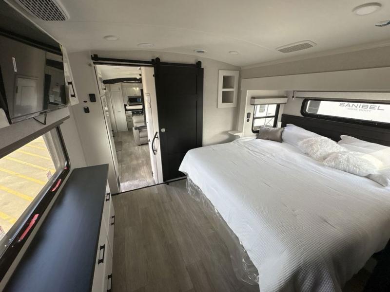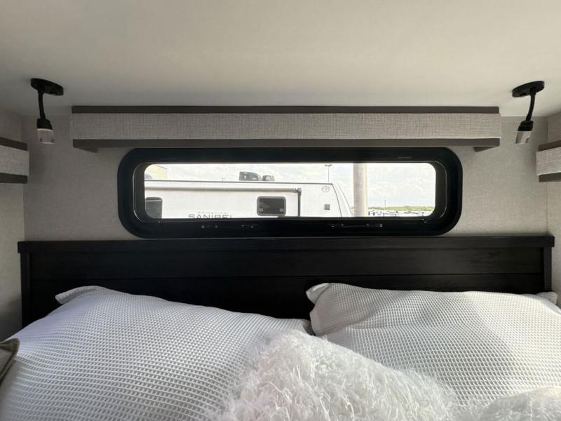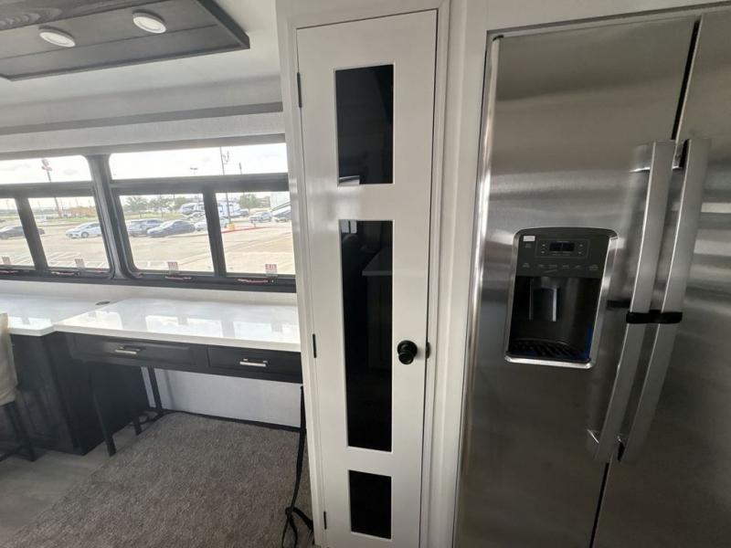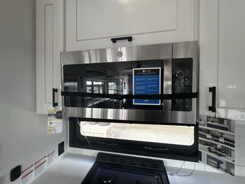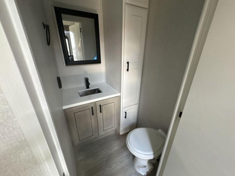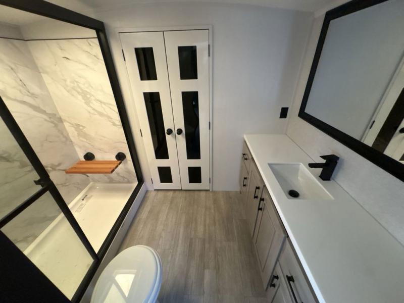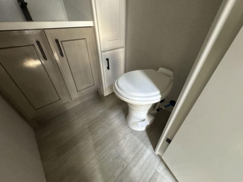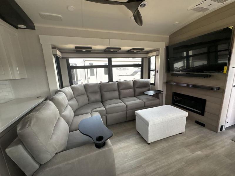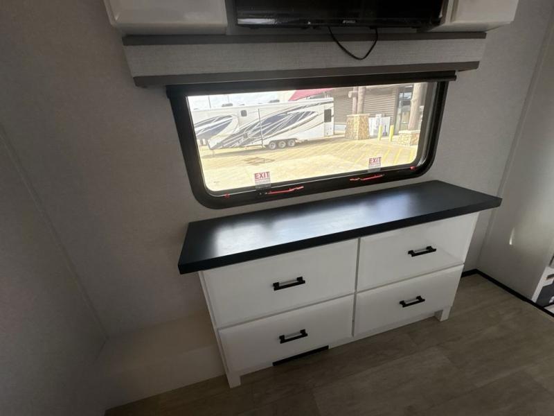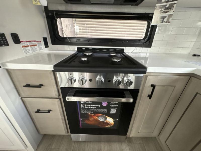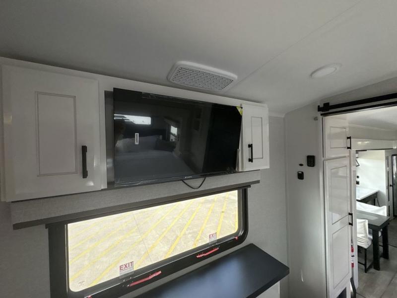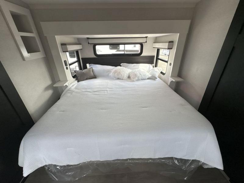 Triples slides, a desk/coffee bar, fireplace, and a huge master bath in front all indicate the kind of vacation you will experience in this Pinnacle Fifth Wheel! As you enter, a convenient half bath is located straight ahead. Slightly to your left, a nice seating area for gathering with family or friends to relax and watch TV, enjoy the fireplace while reading a book or watching a movie, and the dining table with chairs. The dinette slide also houses a 21 cu. ft. residential refrigerator and pantry. The rear kitchen features a u-shaped counter, all the appliances you need to cook like at home, even a pull-out butcher block space for chopping up your veggies. Back through and up the steps to your right in front, the master bedroom will make you feel like royalty with its king bed, plus luxurious full rear bath. A huge vanity with dual bath sinks will allow you both to get ready at the same time, plus there is a walk-in shower with a seat for added convenience. Speaking of walk-in, you will also love the spacious walk-in closet that includes washer/dryer prep.