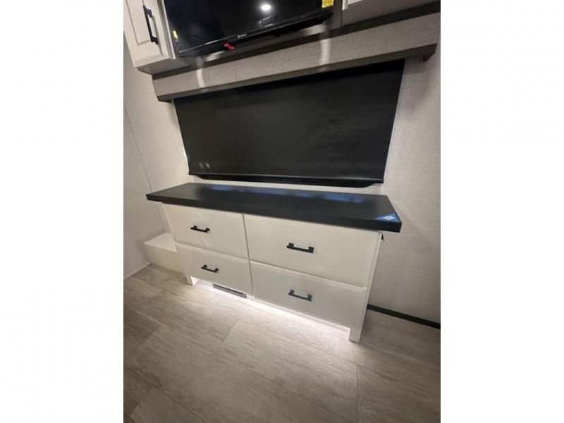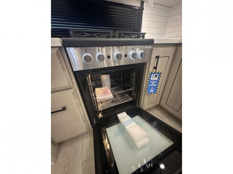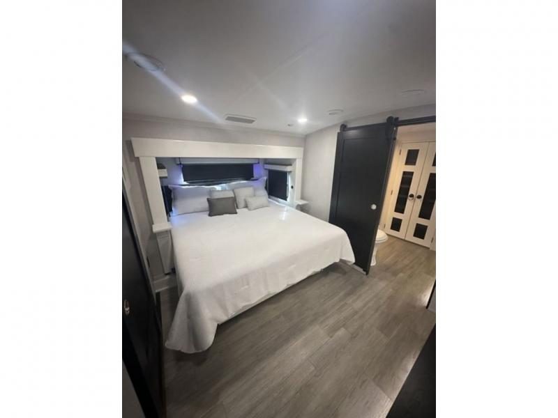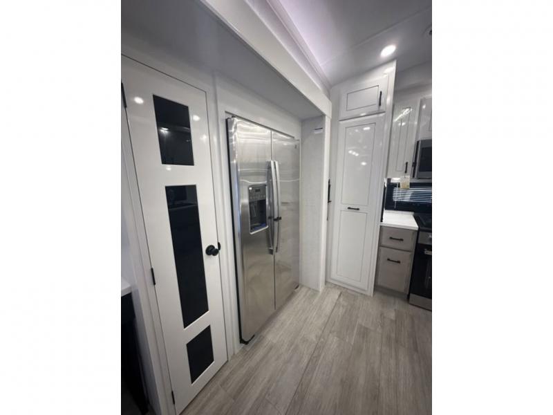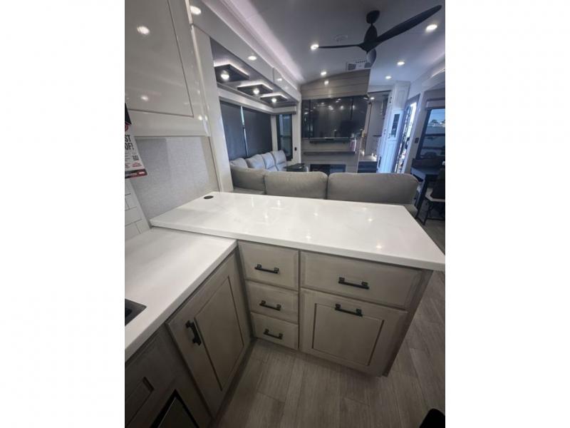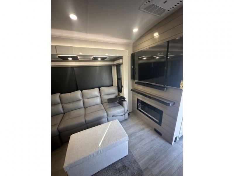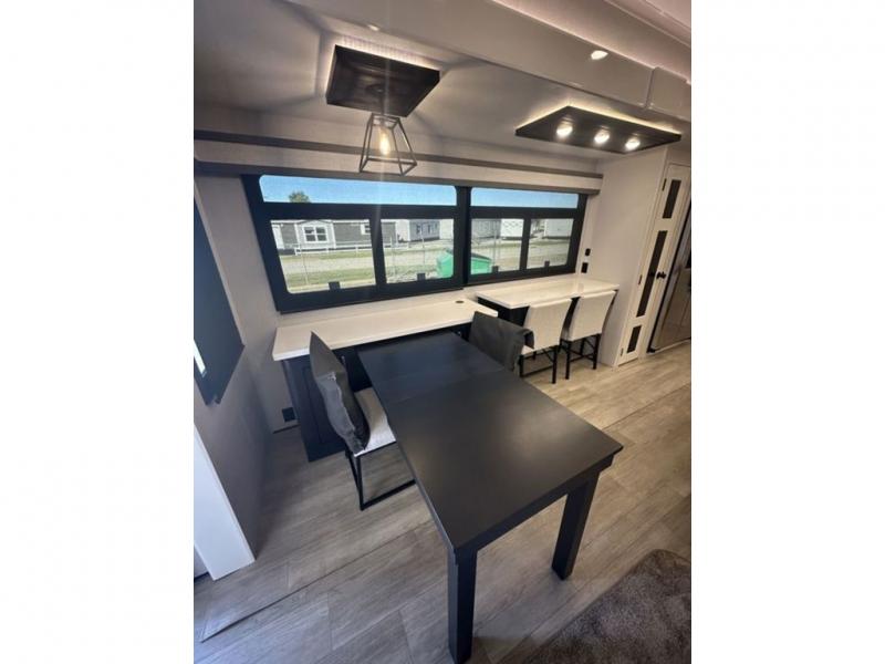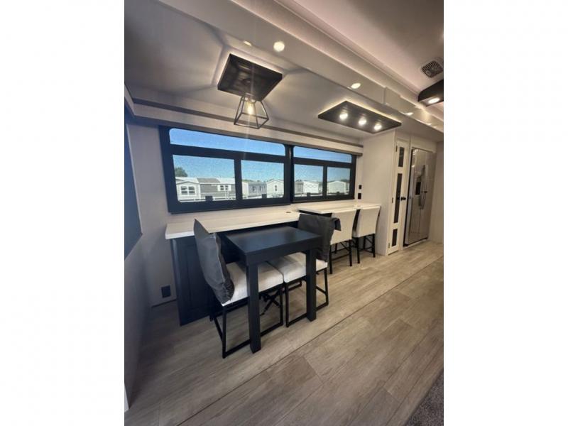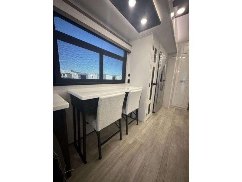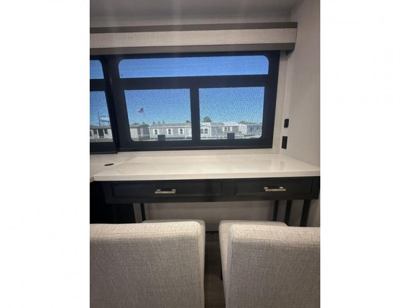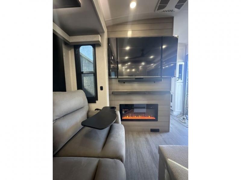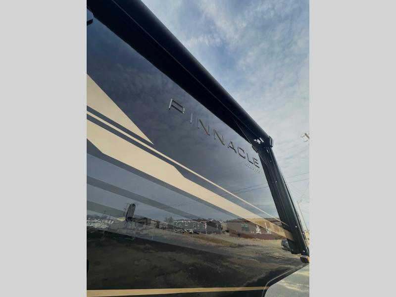 Triples slides, a desk/coffee bar, fireplace, and a huge master bath in front all indicate the kind of vacation you will experience in this Pinnacle Fifth Wheel! As you enter, a convenient half bath is located straight ahead. Slightly to your left, a nice seating area for gathering with family or friends to relax and watch TV, enjoy the fireplace while reading a book or watching a movie, and the dining table with chairs. The dinette slide also houses a 21 cu. ft. residential refrigerator and pantry. The rear kitchen features a u-shaped counter, all the appliances you need to cook like at home, even a pull-out butcher block space for chopping up your veggies. Back through and up the steps to your right in front, the master bedroom will make you feel like royalty with its king bed, plus luxurious full rear bath. A huge vanity with dual bath sinks will allow you both to get ready at the same time, plus there is a walk-in shower with a seat for added convenience. Speaking of walk-in, you will also love the spacious walk-in closet that includes washer/dryer prep.