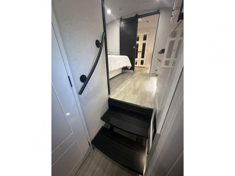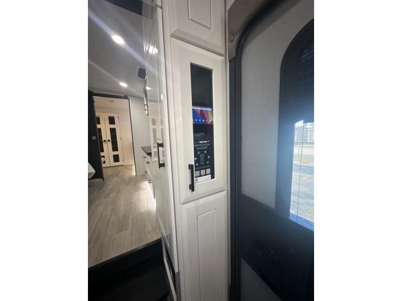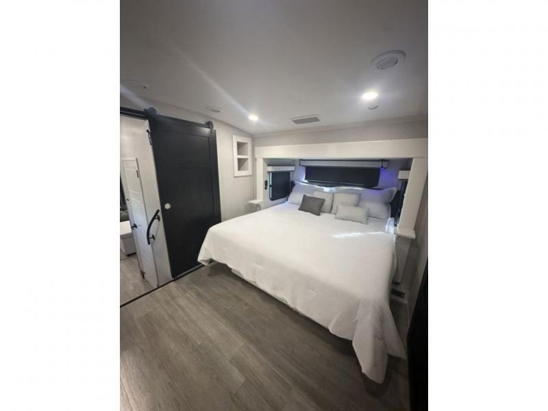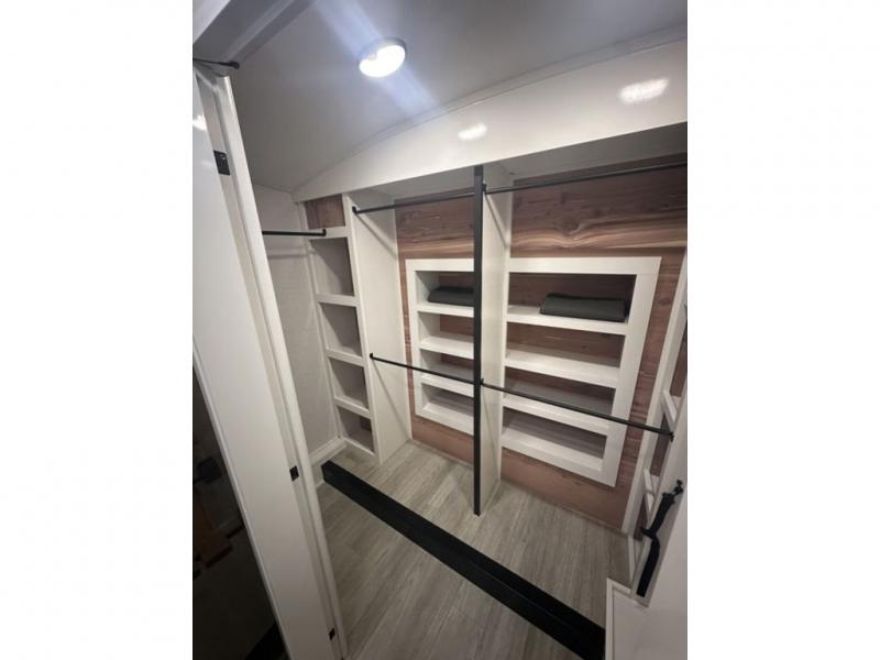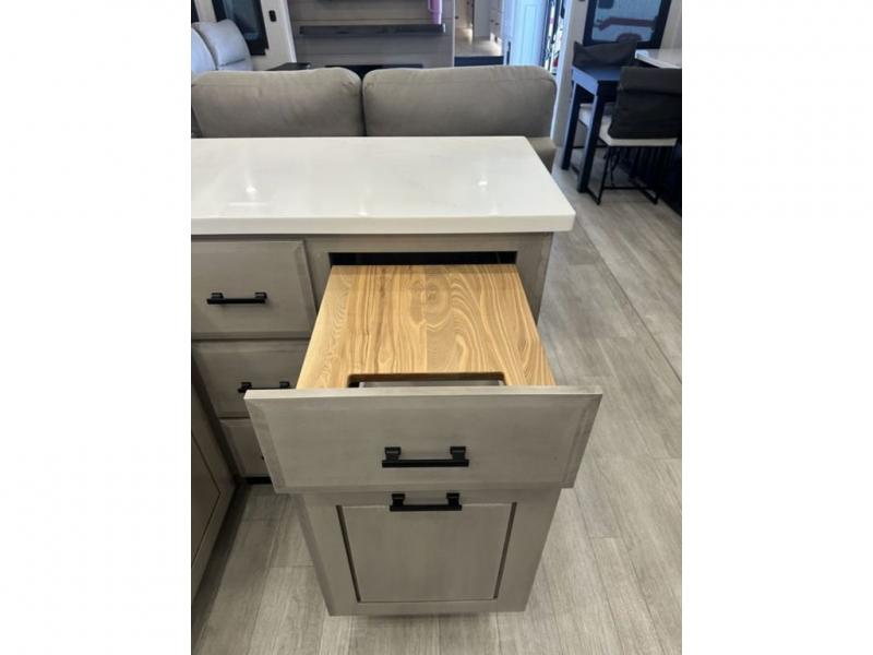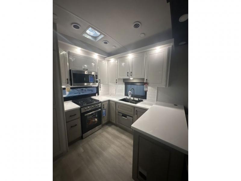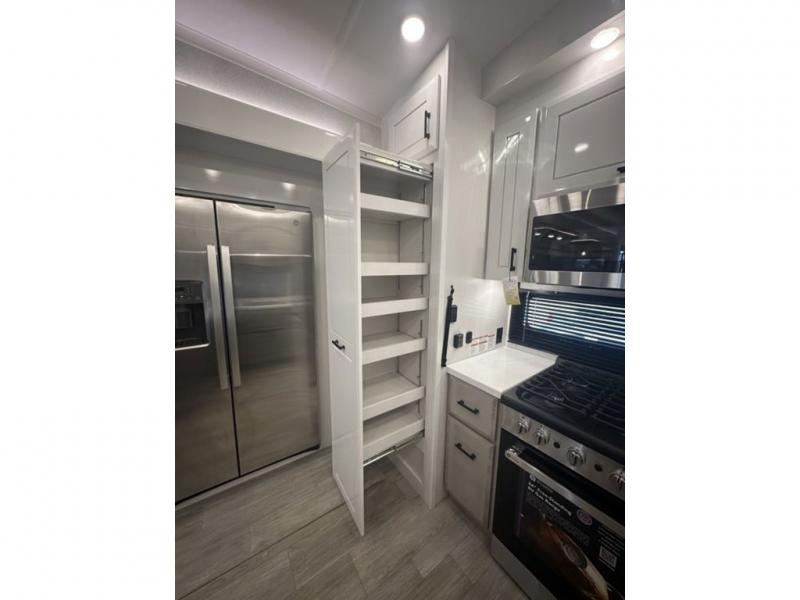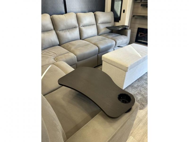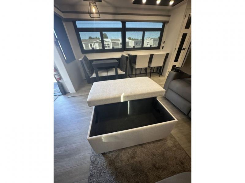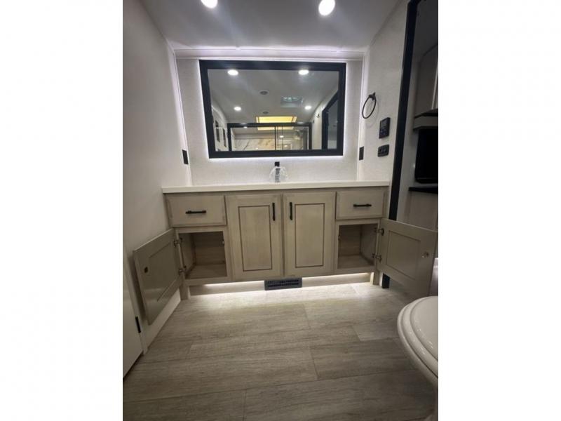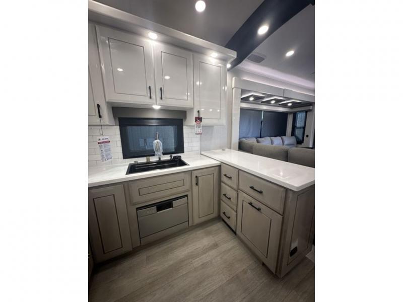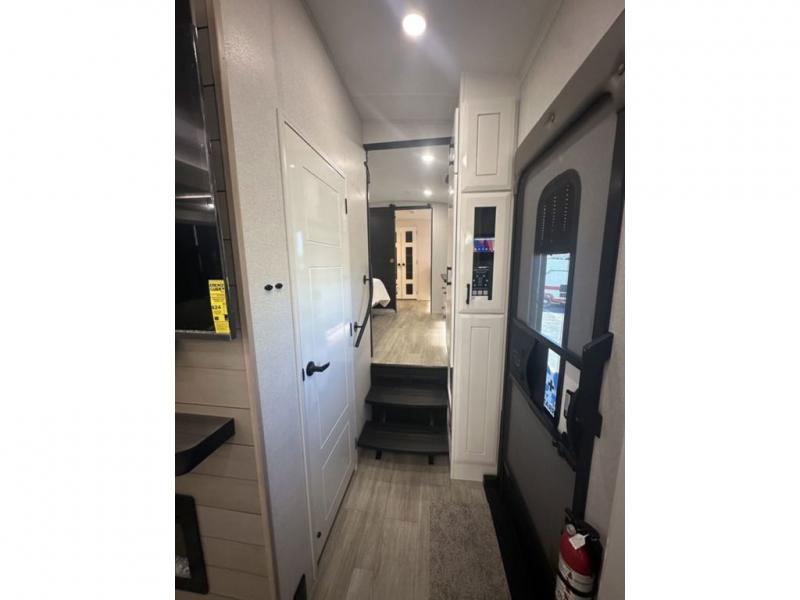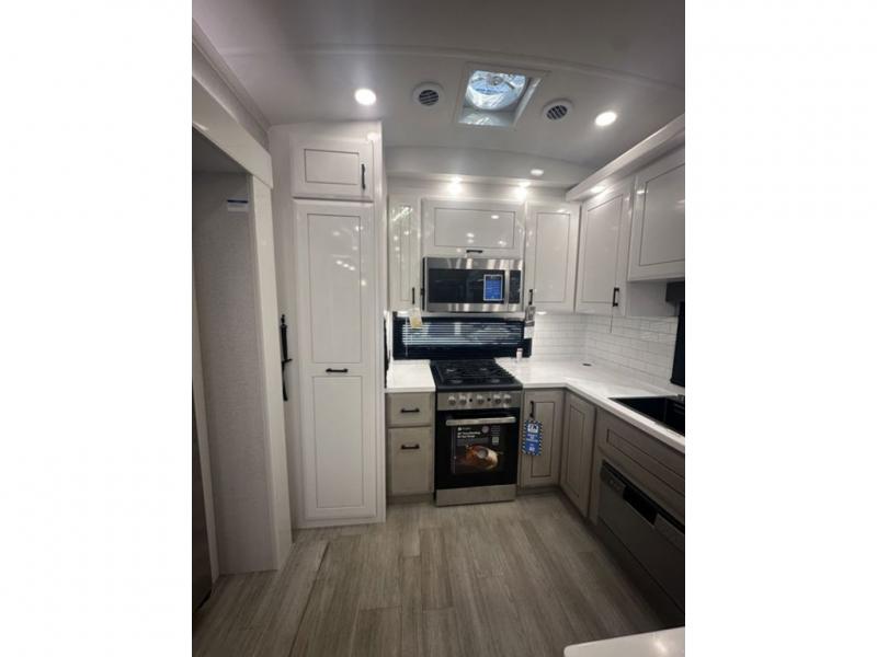 Triples slides, a desk/coffee bar, fireplace, and a huge master bath in front all indicate the kind of vacation you will experience in this Pinnacle Fifth Wheel! As you enter, a convenient half bath is located straight ahead. Slightly to your left, a nice seating area for gathering with family or friends to relax and watch TV, enjoy the fireplace while reading a book or watching a movie, and the dining table with chairs. The dinette slide also houses a 21 cu. ft. residential refrigerator and pantry. The rear kitchen features a u-shaped counter, all the appliances you need to cook like at home, even a pull-out butcher block space for chopping up your veggies. Back through and up the steps to your right in front, the master bedroom will make you feel like royalty with its king bed, plus luxurious full rear bath. A huge vanity with dual bath sinks will allow you both to get ready at the same time, plus there is a walk-in shower with a seat for added convenience. Speaking of walk-in, you will also love the spacious walk-in closet that includes washer/dryer prep.