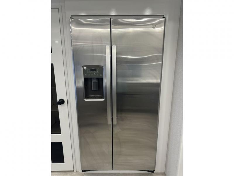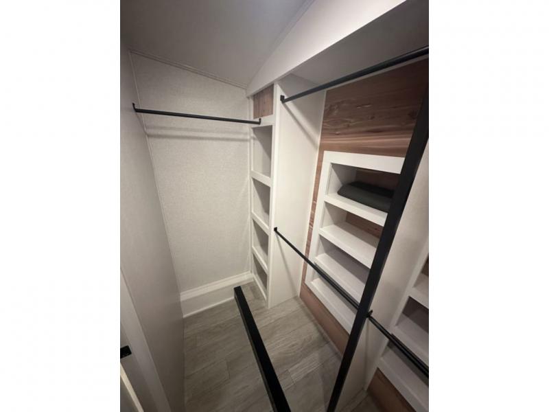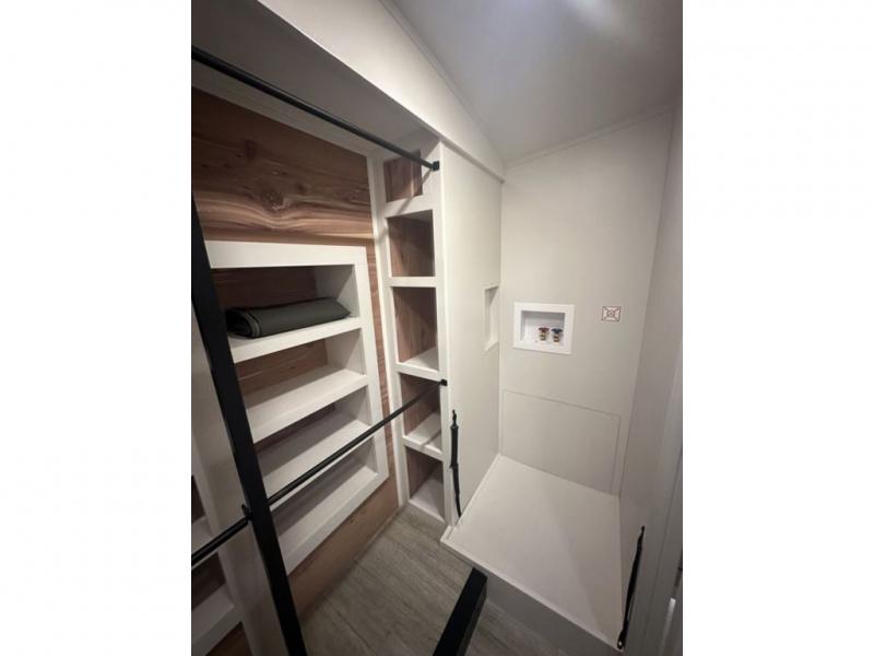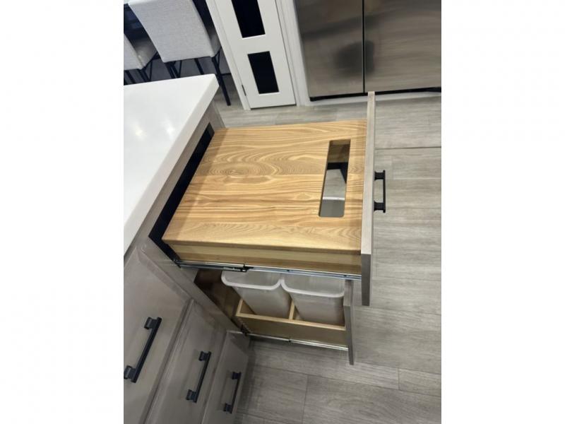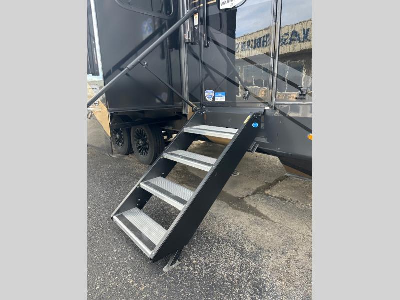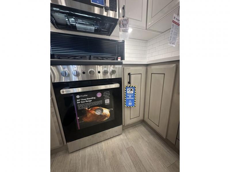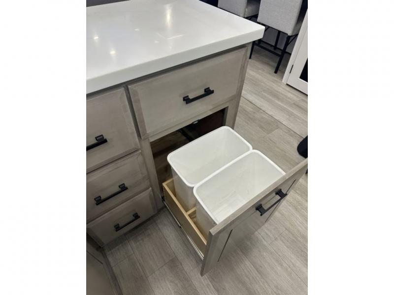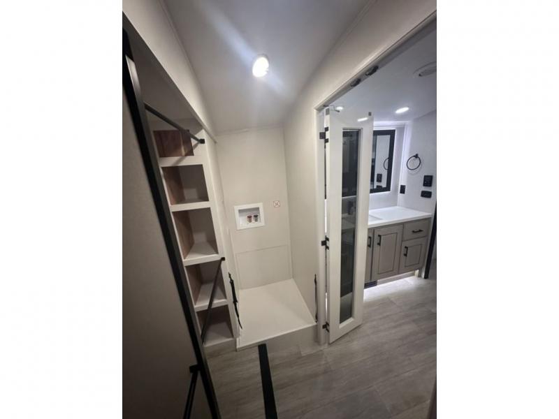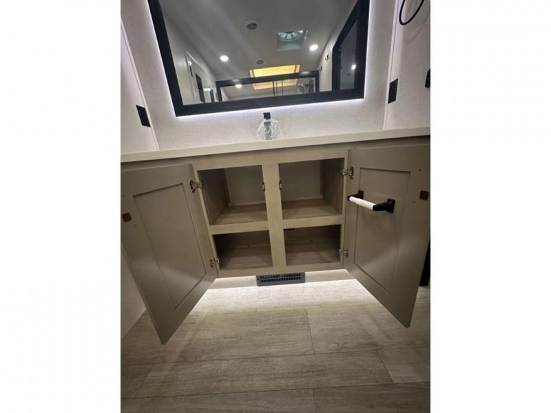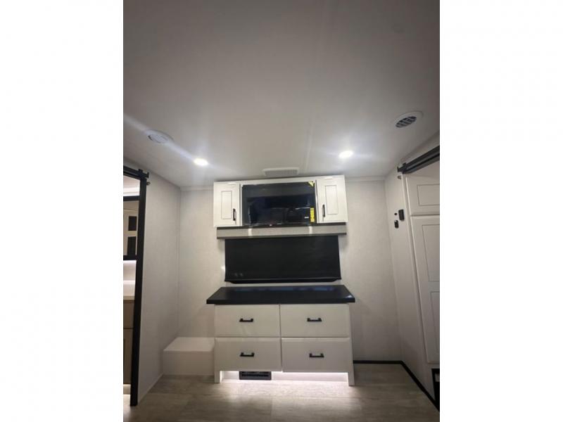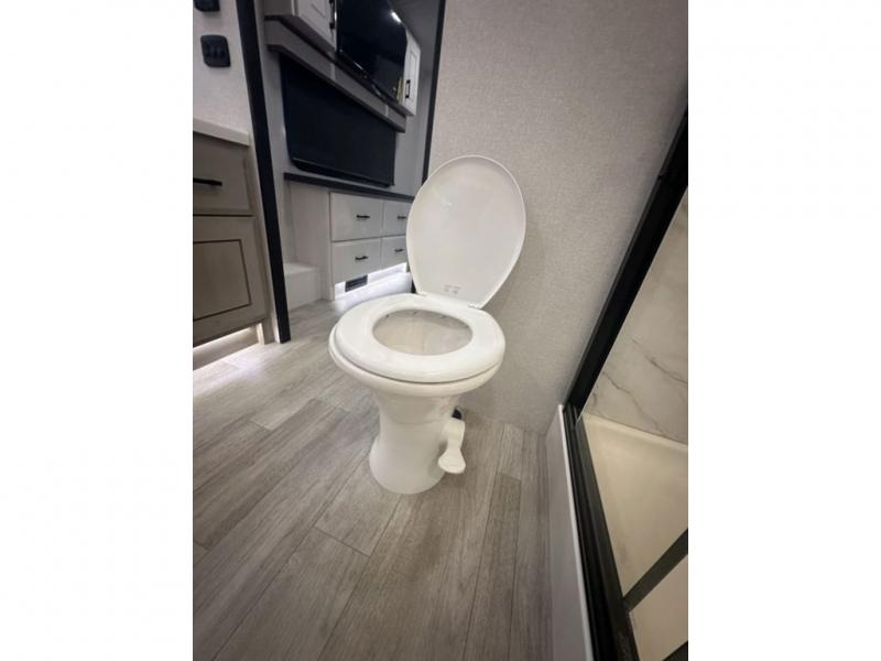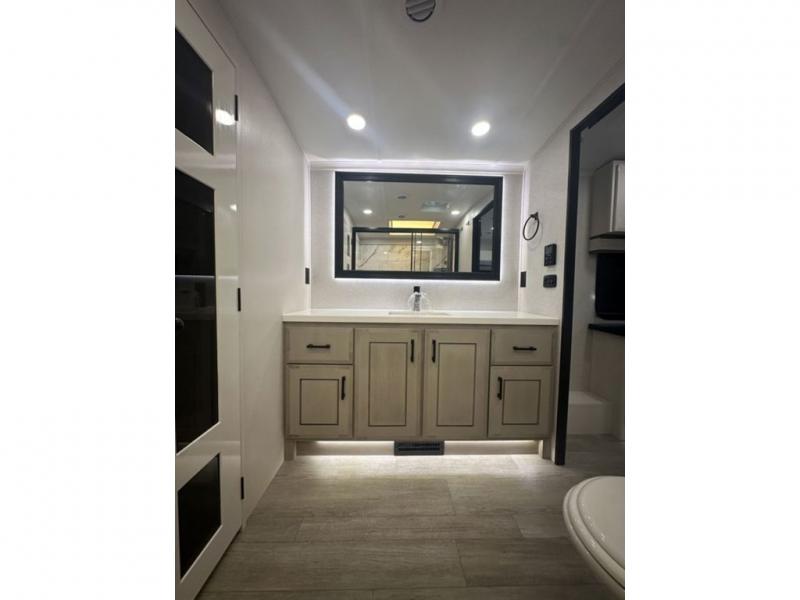 Triples slides, a desk/coffee bar, fireplace, and a huge master bath in front all indicate the kind of vacation you will experience in this Pinnacle Fifth Wheel! As you enter, a convenient half bath is located straight ahead. Slightly to your left, a nice seating area for gathering with family or friends to relax and watch TV, enjoy the fireplace while reading a book or watching a movie, and the dining table with chairs. The dinette slide also houses a 21 cu. ft. residential refrigerator and pantry. The rear kitchen features a u-shaped counter, all the appliances you need to cook like at home, even a pull-out butcher block space for chopping up your veggies. Back through and up the steps to your right in front, the master bedroom will make you feel like royalty with its king bed, plus luxurious full rear bath. A huge vanity with dual bath sinks will allow you both to get ready at the same time, plus there is a walk-in shower with a seat for added convenience. Speaking of walk-in, you will also love the spacious walk-in closet that includes washer/dryer prep.