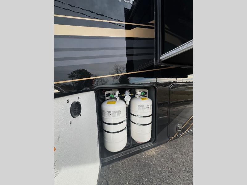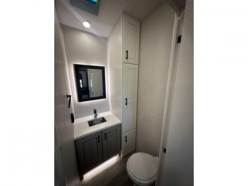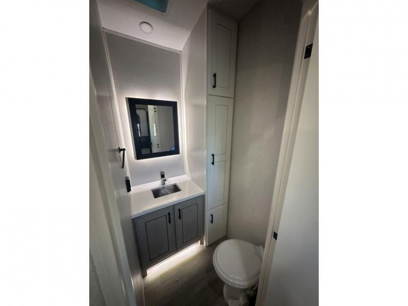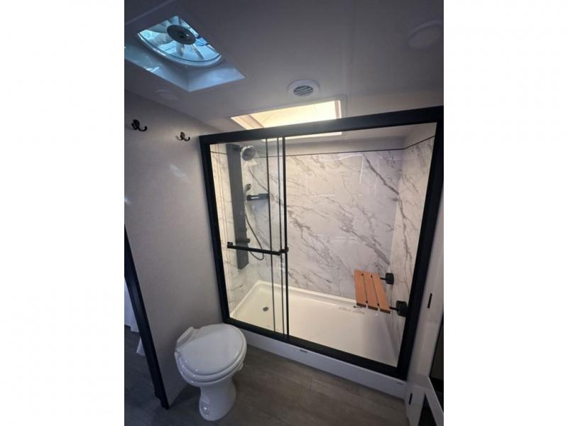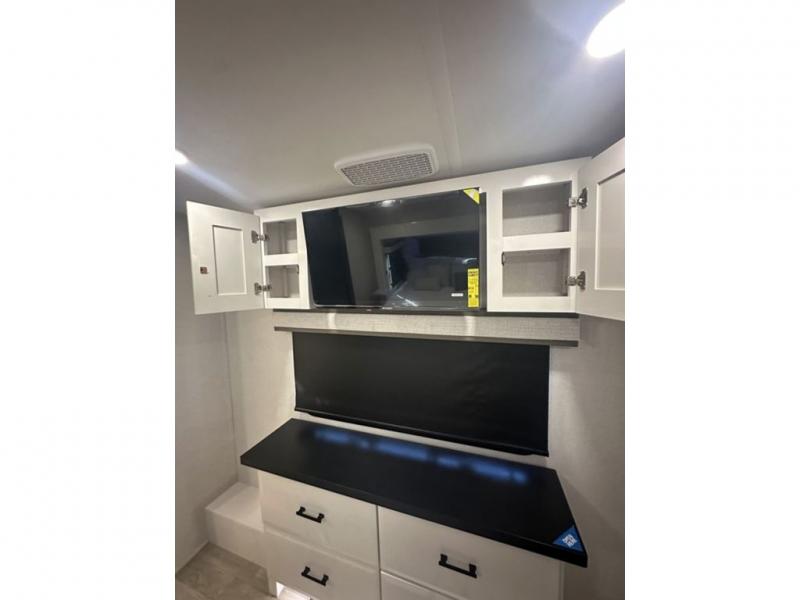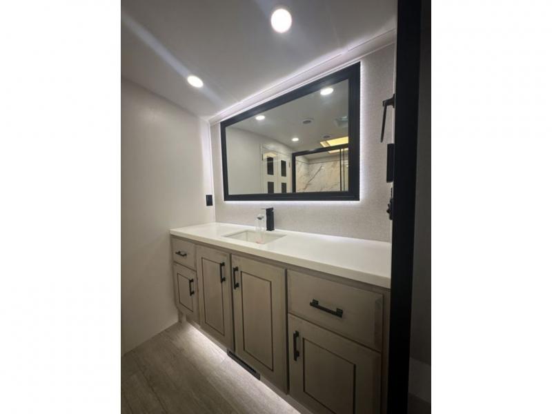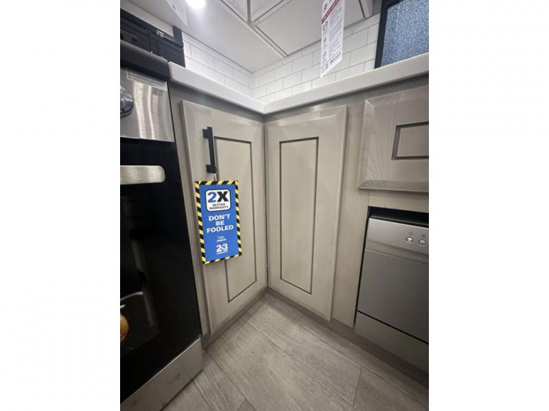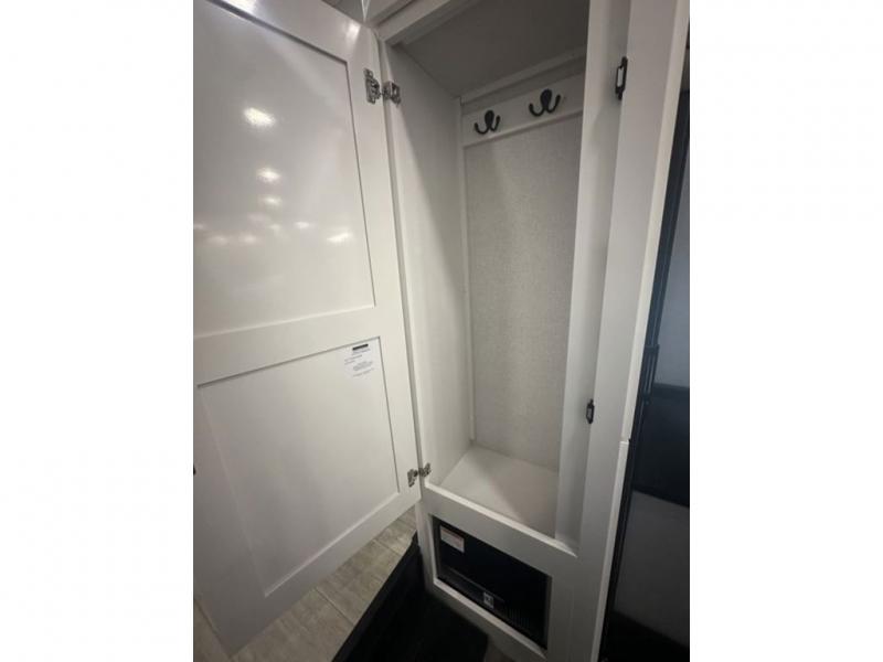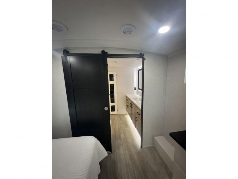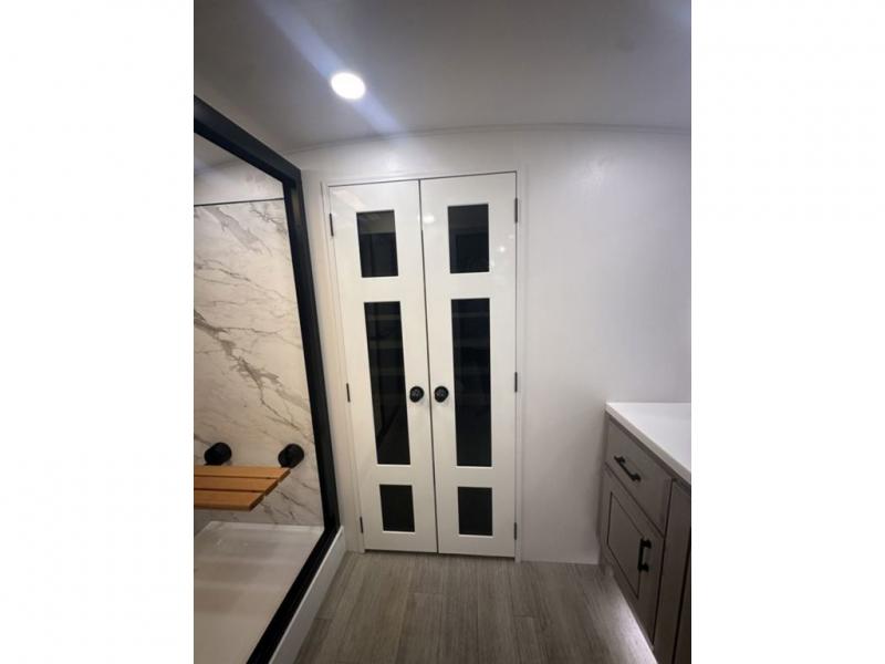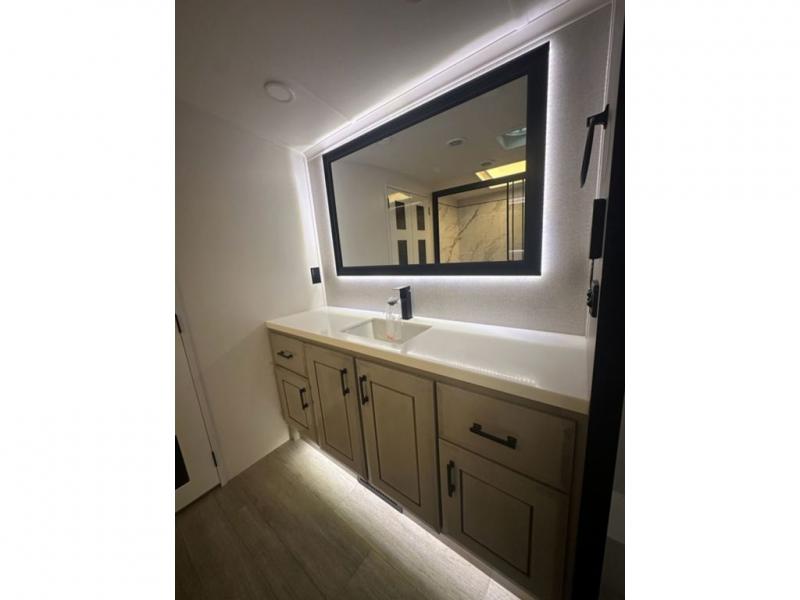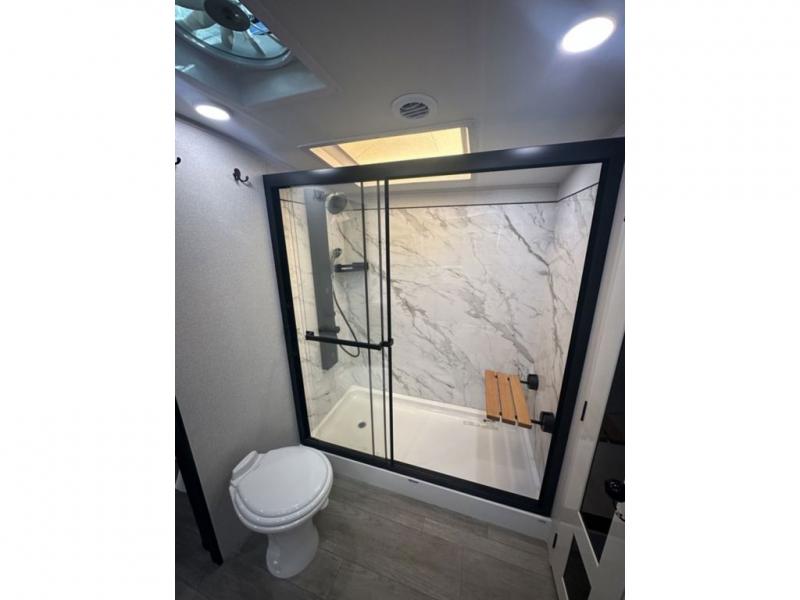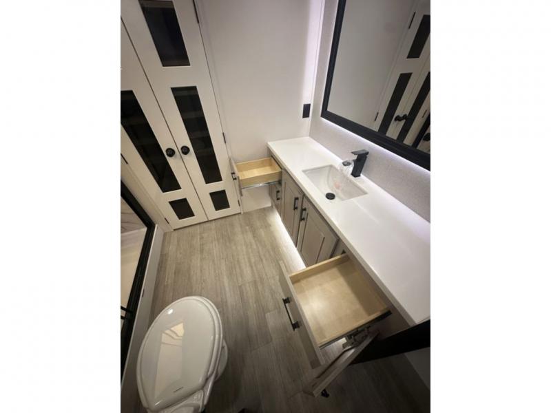 Triples slides, a desk/coffee bar, fireplace, and a huge master bath in front all indicate the kind of vacation you will experience in this Pinnacle Fifth Wheel! As you enter, a convenient half bath is located straight ahead. Slightly to your left, a nice seating area for gathering with family or friends to relax and watch TV, enjoy the fireplace while reading a book or watching a movie, and the dining table with chairs. The dinette slide also houses a 21 cu. ft. residential refrigerator and pantry. The rear kitchen features a u-shaped counter, all the appliances you need to cook like at home, even a pull-out butcher block space for chopping up your veggies. Back through and up the steps to your right in front, the master bedroom will make you feel like royalty with its king bed, plus luxurious full rear bath. A huge vanity with dual bath sinks will allow you both to get ready at the same time, plus there is a walk-in shower with a seat for added convenience. Speaking of walk-in, you will also love the spacious walk-in closet that includes washer/dryer prep.