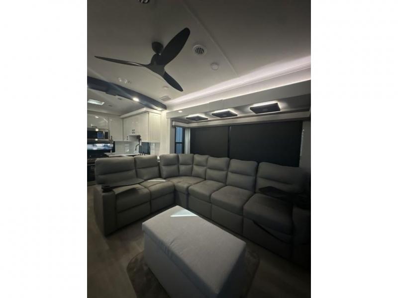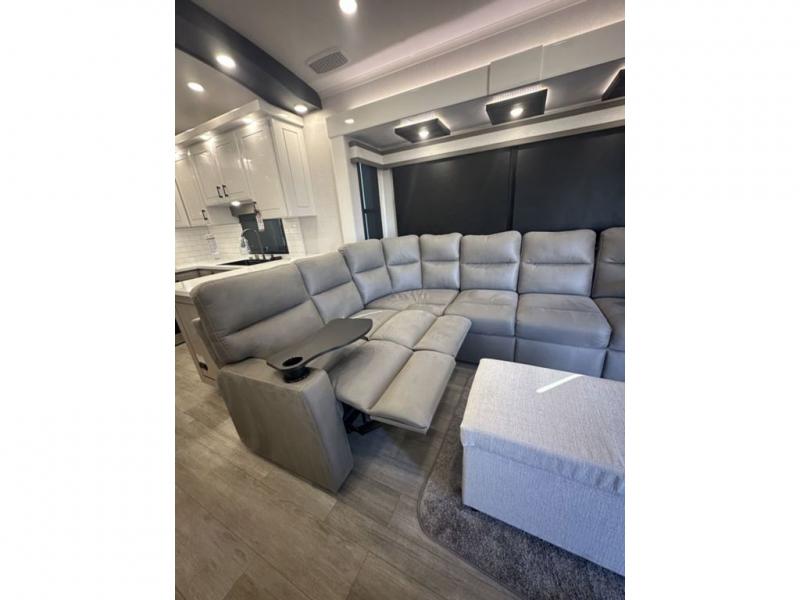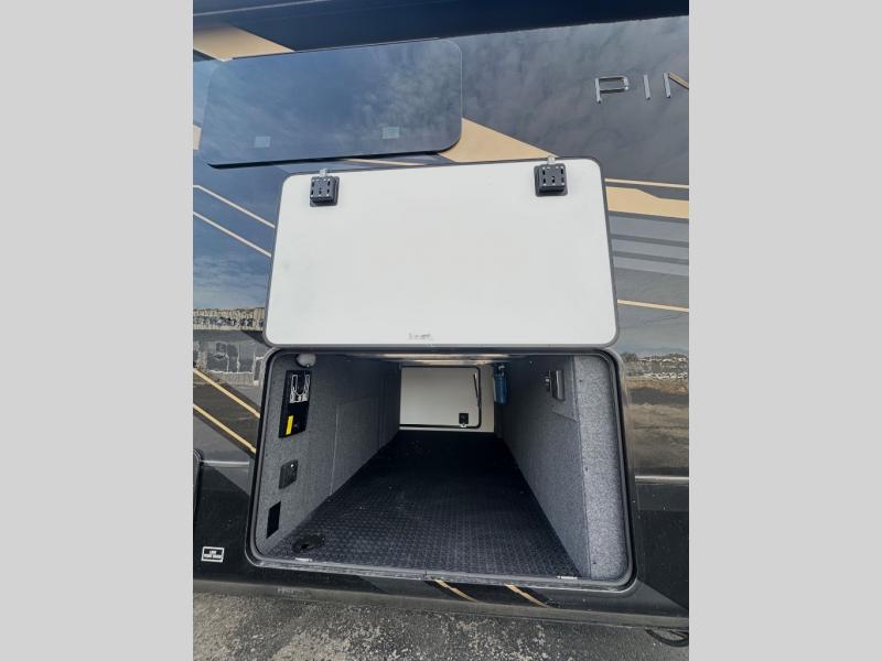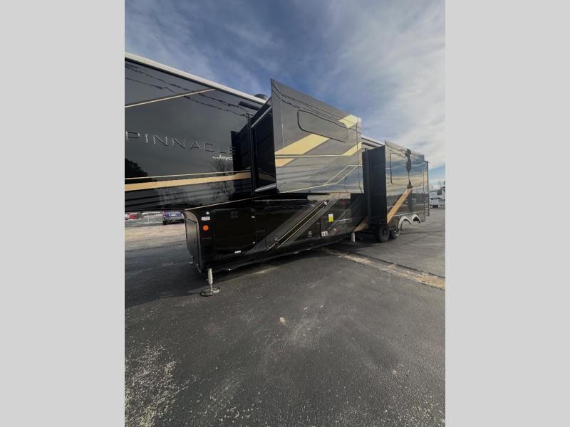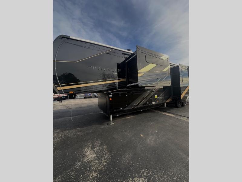 Each Pinnacle fifth wheel features Stronghold VBL lamination for the lightest, yet strongest construction in the RV industry. Add that to the Magnum Truss XL6 roof system and Climate Shield zero-degree tested weather protection and you'll be enjoying your fifth wheel for years to come. Some of the exterior conveniences you will appreciate are the Keyed-Alike lock system, the fully enclosed, universal docking center, and the 6-point hydraulic auto-leveling system for quick and easy set up. The 5 Star Handling Package will make towing a fifth wheel a walk in the park, and the two Whisper Quiet A/C units will keep you comfortable during the hot summer months. Inside, you'll enjoy the residential "Do it all" sink with pull-out kitchen faucet, glass rinse, and vegetable rinse, the handcrafted hardwood glazed cabinetry, the vinyl flooring throughout, plus many more comforts. There is even a central vacuum system, a wireless remote control system, USB ports throughout, plus many more conveniences to make each trip enjoyable.