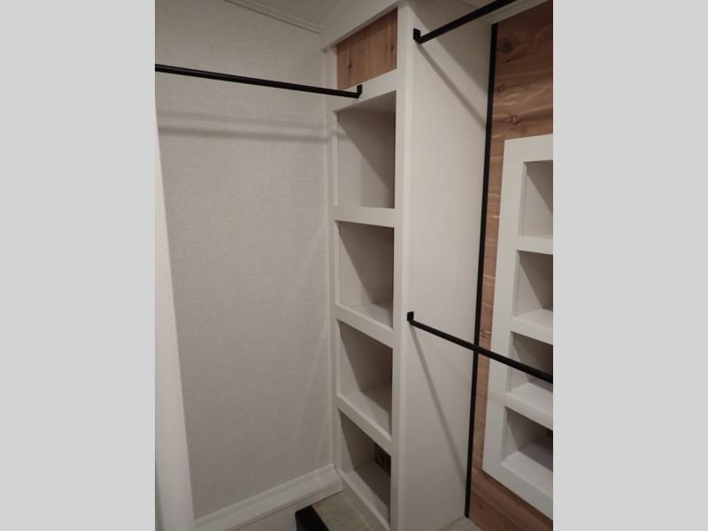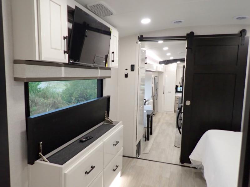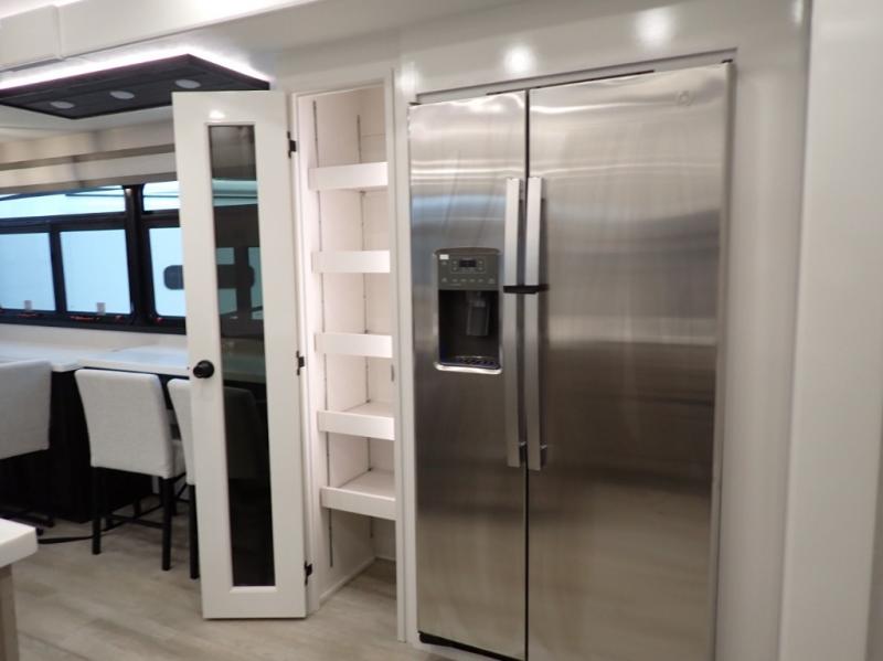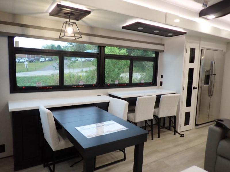 Triples slides, a desk/coffee bar, fireplace, and a huge master bath in front all indicate the kind of vacation you will experience in this Pinnacle Fifth Wheel! As you enter, a convenient half bath is located straight ahead. Slightly to your left, a nice seating area for gathering with family or friends to relax and watch TV, enjoy the fireplace while reading a book or watching a movie, and the dining table with chairs. The dinette slide also houses a 21 cu. ft. residential refrigerator and pantry. The rear kitchen features a u-shaped counter, all the appliances you need to cook like at home, even a pull-out butcher block space for chopping up your veggies. Back through and up the steps to your right in front, the master bedroom will make you feel like royalty with its king bed, plus luxurious full rear bath. A huge vanity with dual bath sinks will allow you both to get ready at the same time, plus there is a walk-in shower with a seat for added convenience. Speaking of walk-in, you will also love the spacious walk-in closet that includes washer/dryer prep.