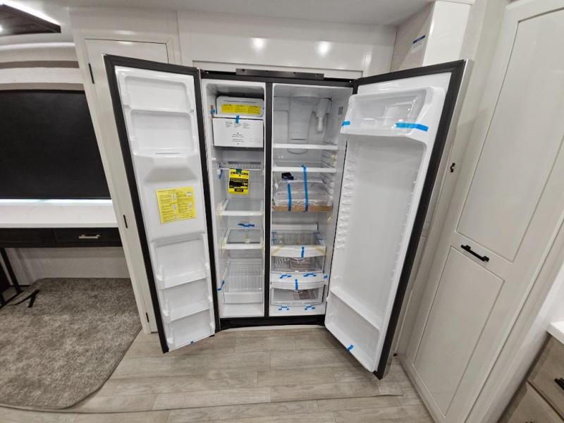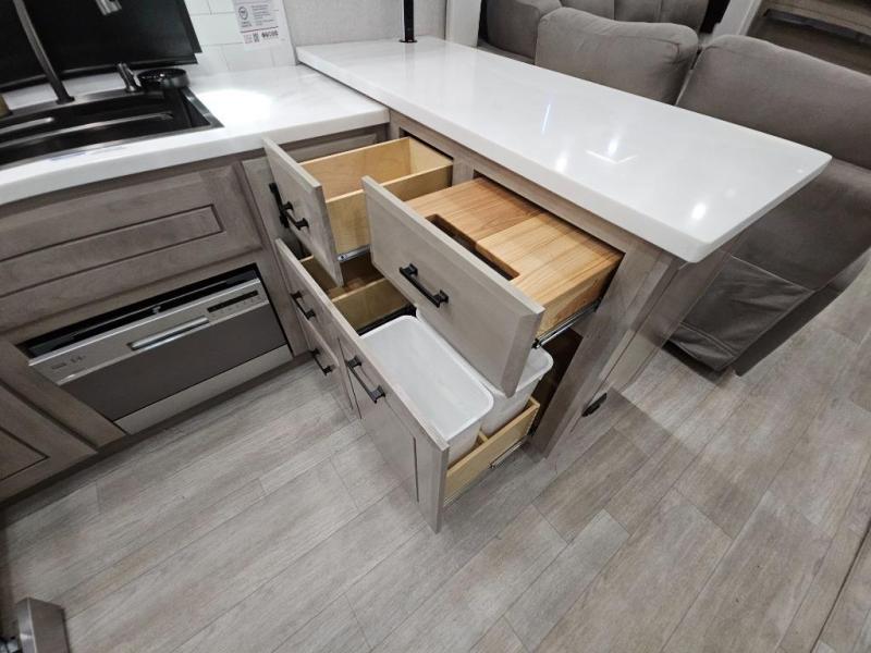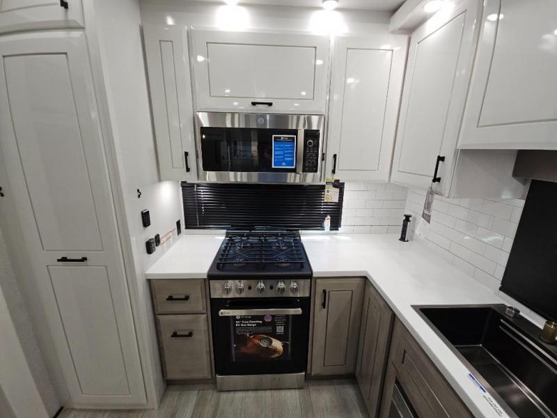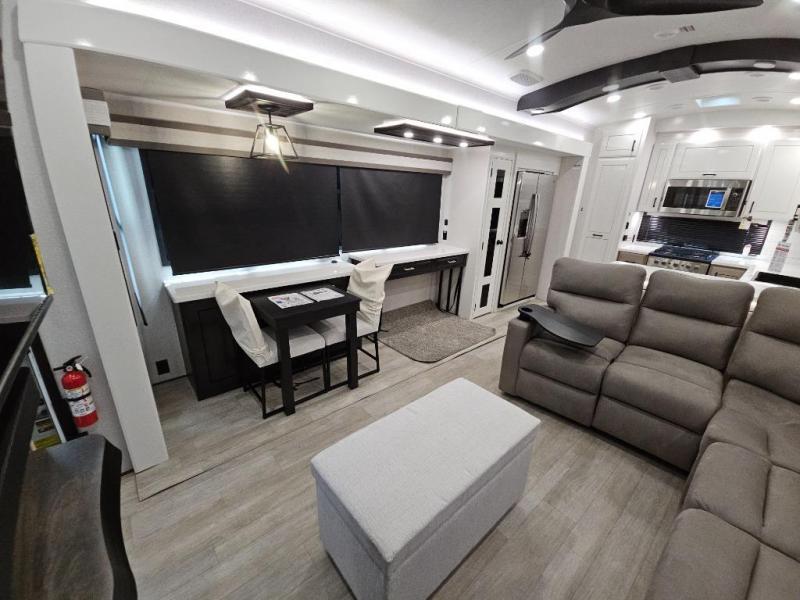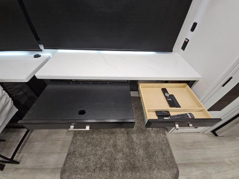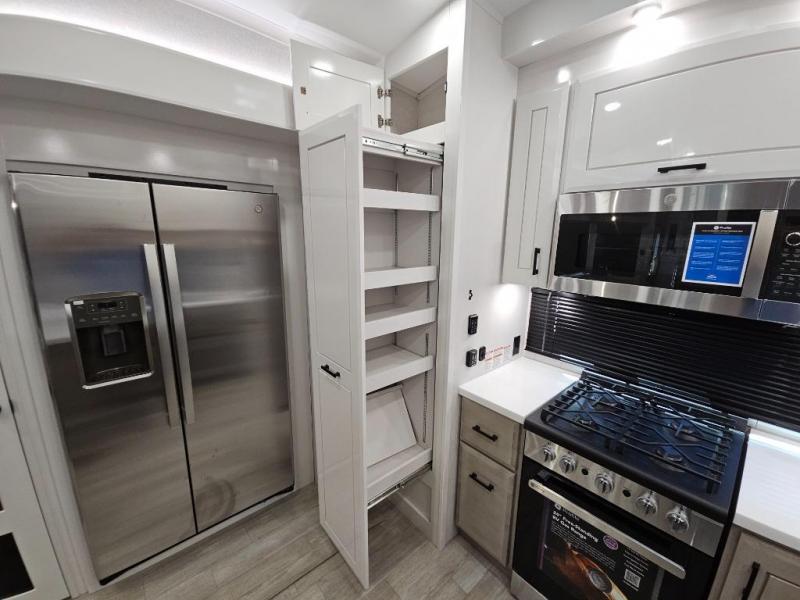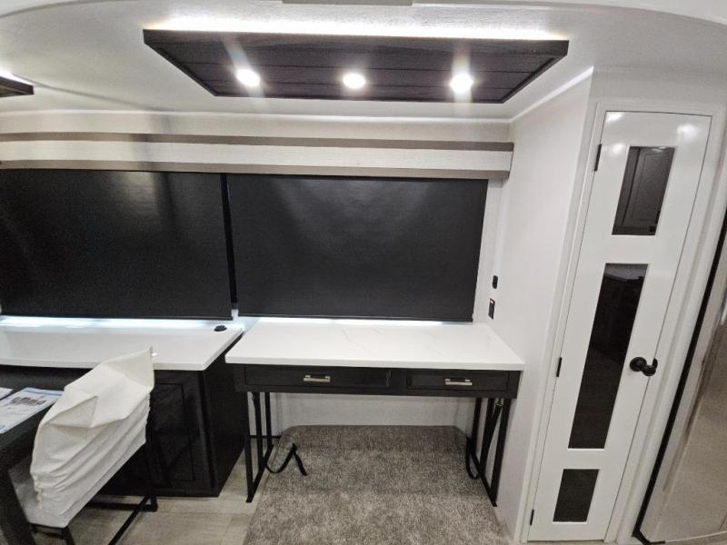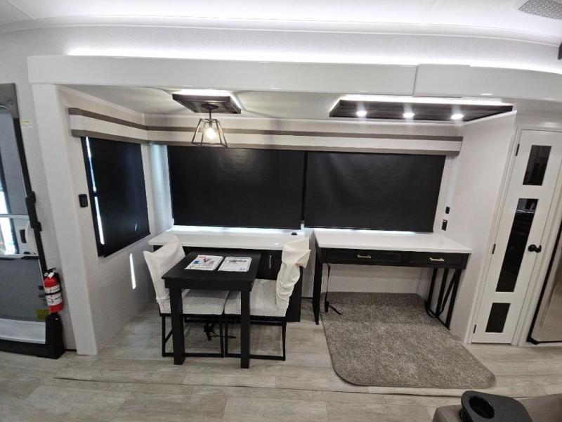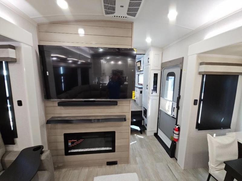 Triples slides, a desk/coffee bar, fireplace, and a huge master bath in front all indicate the kind of vacation you will experience in this Pinnacle Fifth Wheel! As you enter, a convenient half bath is located straight ahead. Slightly to your left, a nice seating area for gathering with family or friends to relax and watch TV, enjoy the fireplace while reading a book or watching a movie, and the dining table with chairs. The dinette slide also houses a 21 cu. ft. residential refrigerator and pantry. The rear kitchen features a u-shaped counter, all the appliances you need to cook like at home, even a pull-out butcher block space for chopping up your veggies. Back through and up the steps to your right in front, the master bedroom will make you feel like royalty with its king bed, plus luxurious full rear bath. A huge vanity with dual bath sinks will allow you both to get ready at the same time, plus there is a walk-in shower with a seat for added convenience. Speaking of walk-in, you will also love the spacious walk-in closet that includes washer/dryer prep.