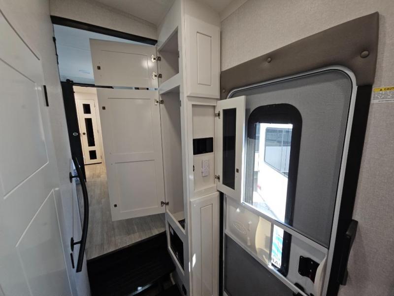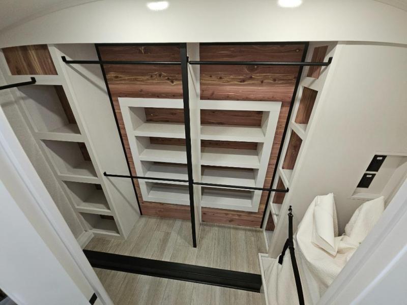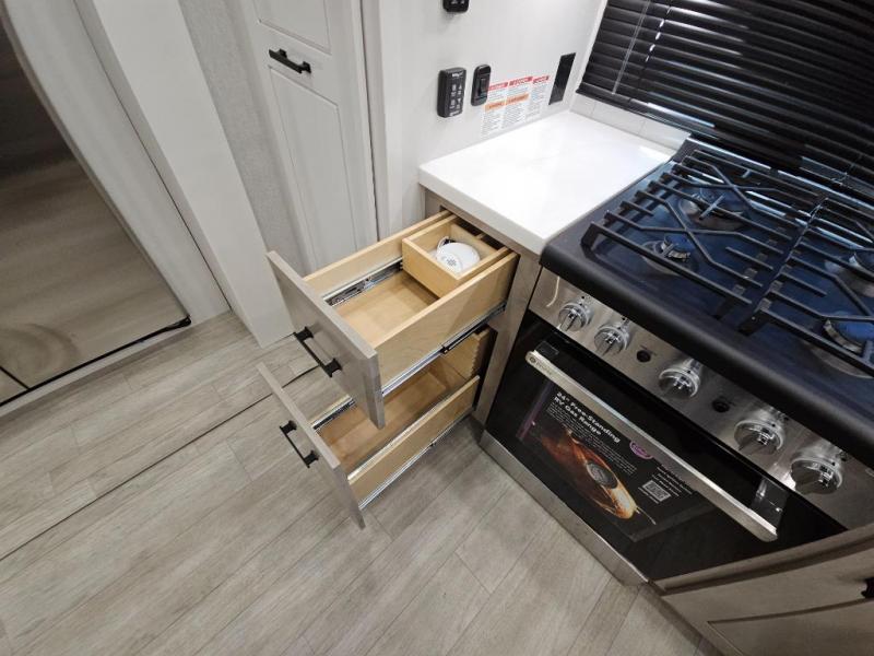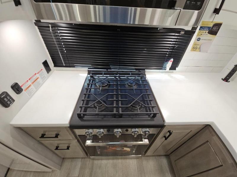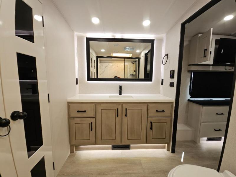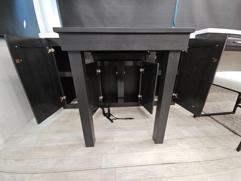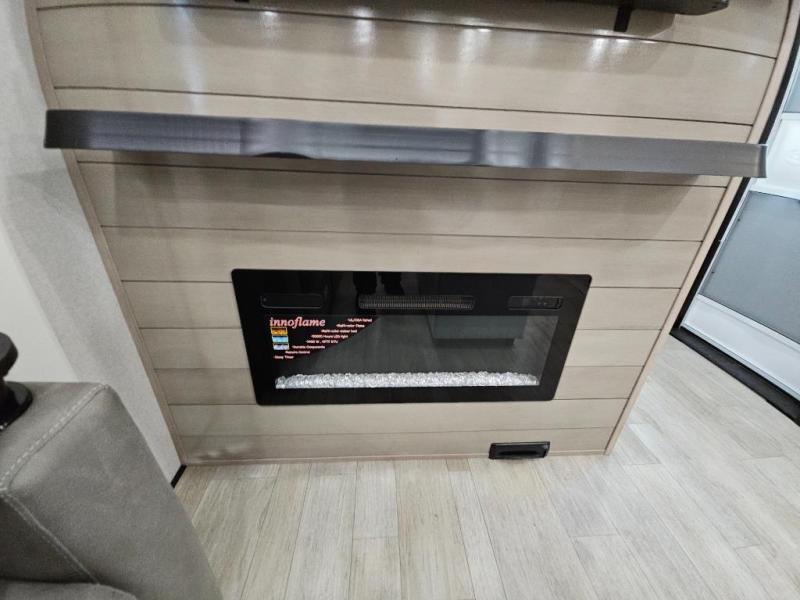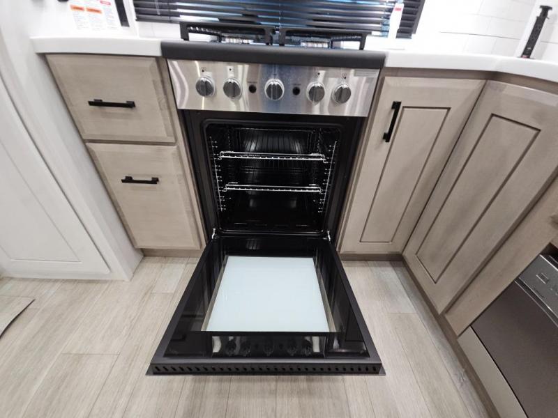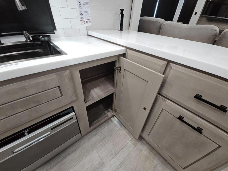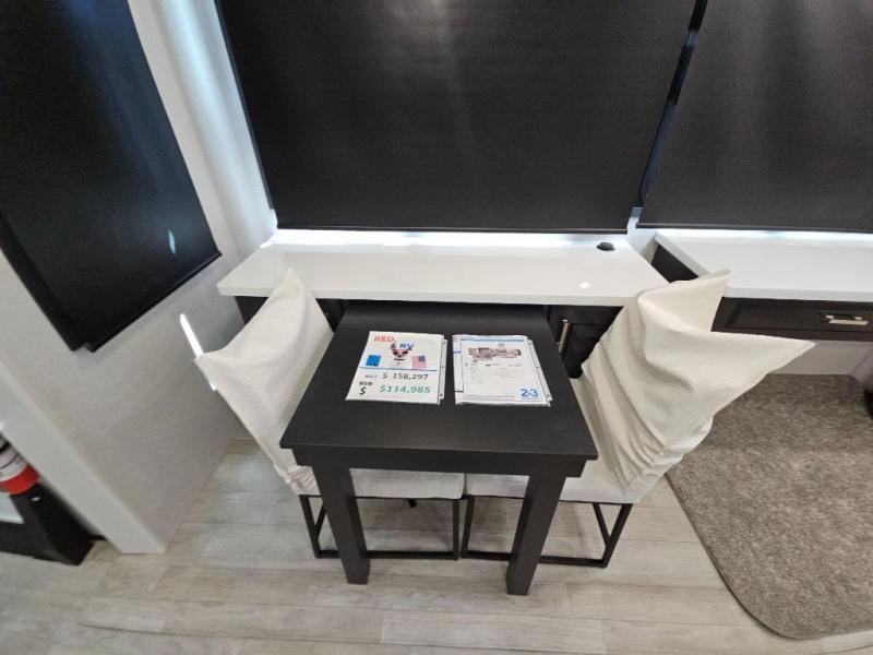 Triples slides, a desk/coffee bar, fireplace, and a huge master bath in front all indicate the kind of vacation you will experience in this Pinnacle Fifth Wheel! As you enter, a convenient half bath is located straight ahead. Slightly to your left, a nice seating area for gathering with family or friends to relax and watch TV, enjoy the fireplace while reading a book or watching a movie, and the dining table with chairs. The dinette slide also houses a 21 cu. ft. residential refrigerator and pantry. The rear kitchen features a u-shaped counter, all the appliances you need to cook like at home, even a pull-out butcher block space for chopping up your veggies. Back through and up the steps to your right in front, the master bedroom will make you feel like royalty with its king bed, plus luxurious full rear bath. A huge vanity with dual bath sinks will allow you both to get ready at the same time, plus there is a walk-in shower with a seat for added convenience. Speaking of walk-in, you will also love the spacious walk-in closet that includes washer/dryer prep.