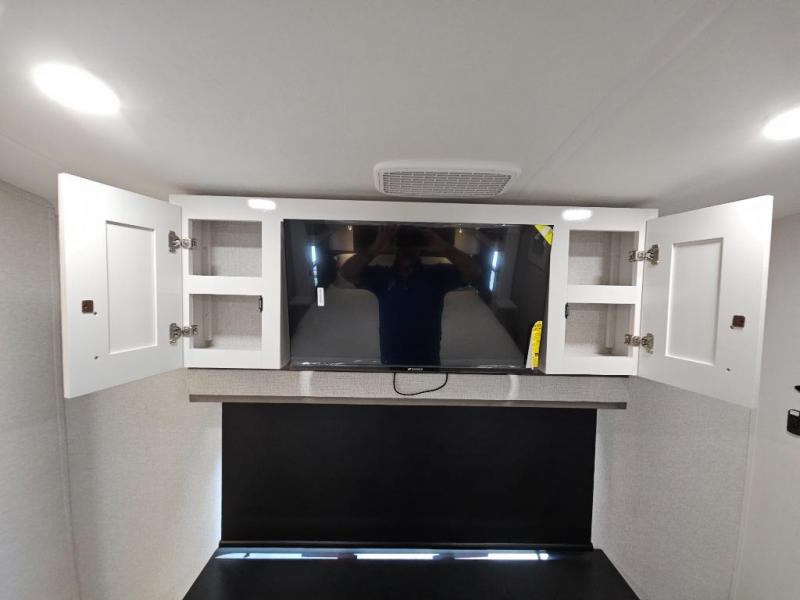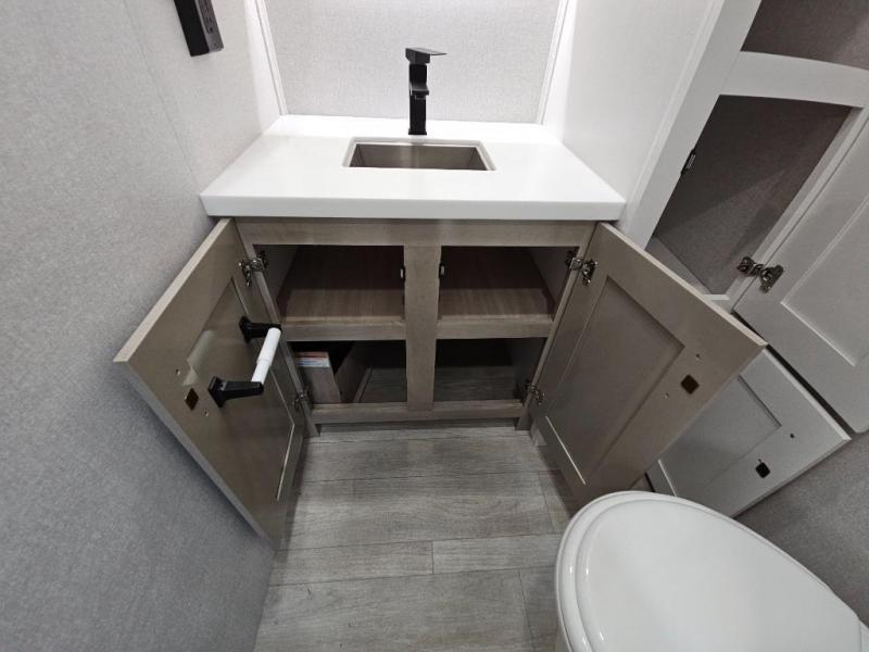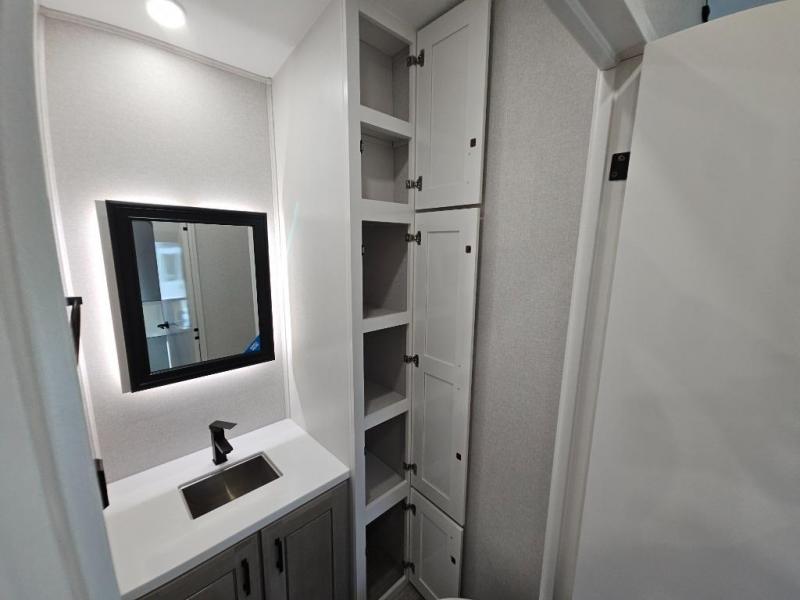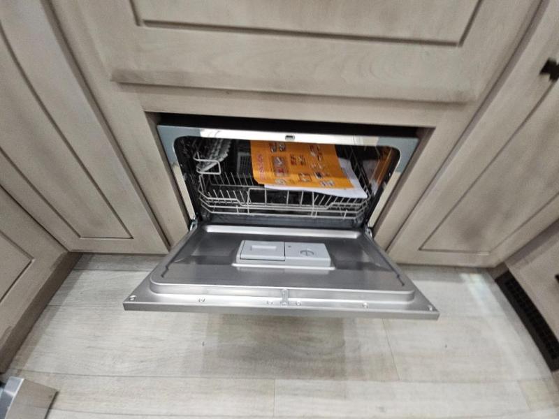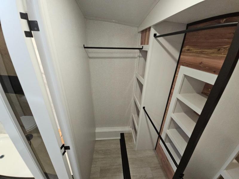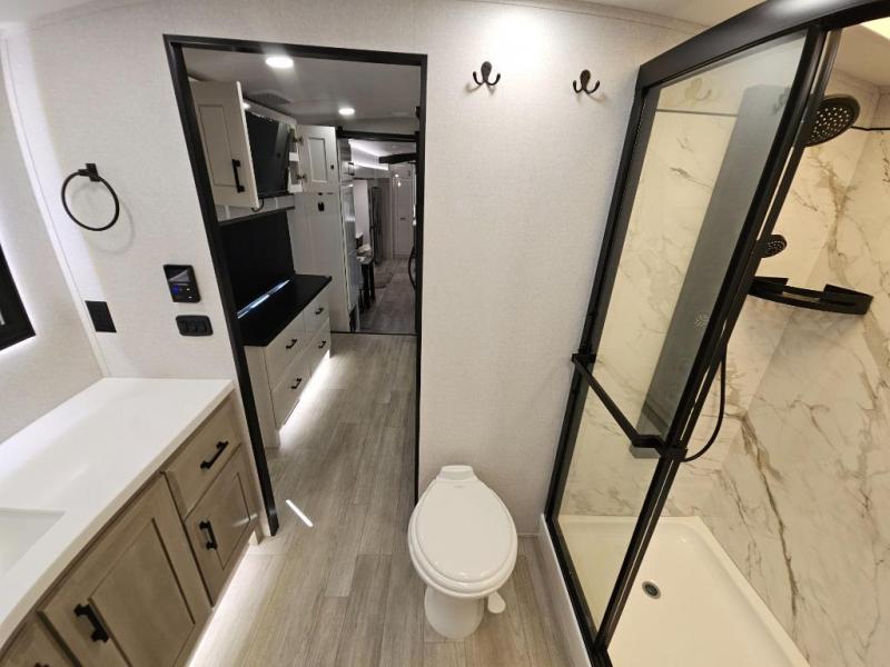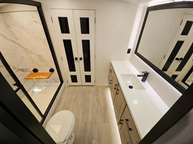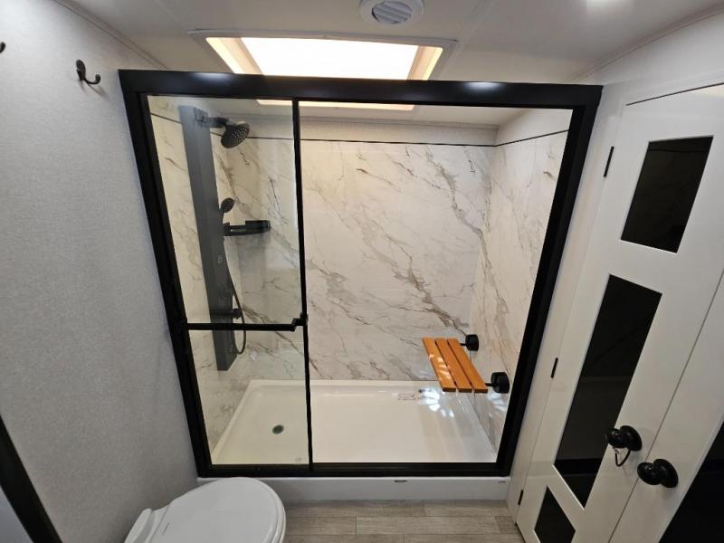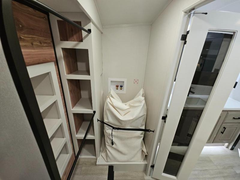 Triples slides, a desk/coffee bar, fireplace, and a huge master bath in front all indicate the kind of vacation you will experience in this Pinnacle Fifth Wheel! As you enter, a convenient half bath is located straight ahead. Slightly to your left, a nice seating area for gathering with family or friends to relax and watch TV, enjoy the fireplace while reading a book or watching a movie, and the dining table with chairs. The dinette slide also houses a 21 cu. ft. residential refrigerator and pantry. The rear kitchen features a u-shaped counter, all the appliances you need to cook like at home, even a pull-out butcher block space for chopping up your veggies. Back through and up the steps to your right in front, the master bedroom will make you feel like royalty with its king bed, plus luxurious full rear bath. A huge vanity with dual bath sinks will allow you both to get ready at the same time, plus there is a walk-in shower with a seat for added convenience. Speaking of walk-in, you will also love the spacious walk-in closet that includes washer/dryer prep.