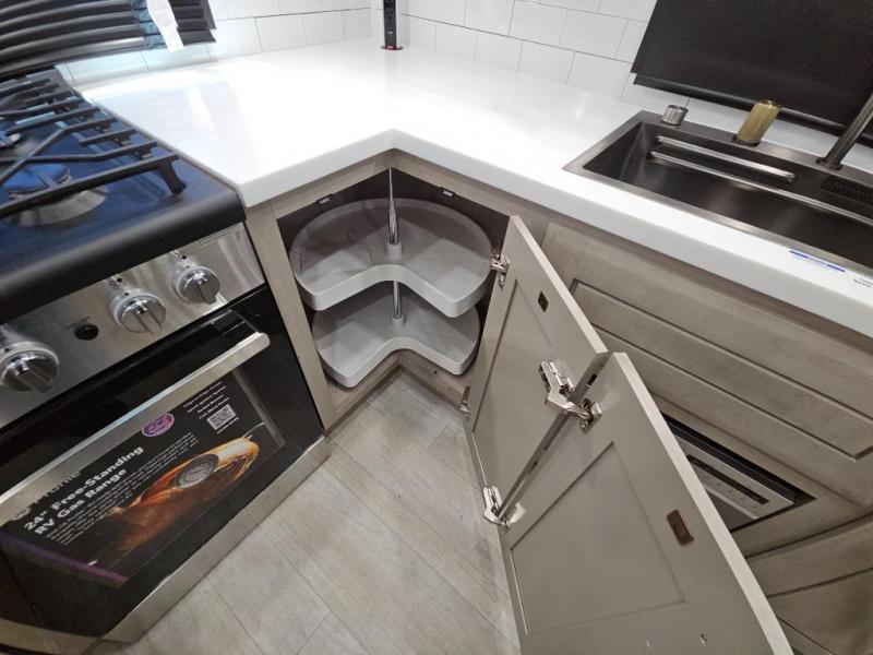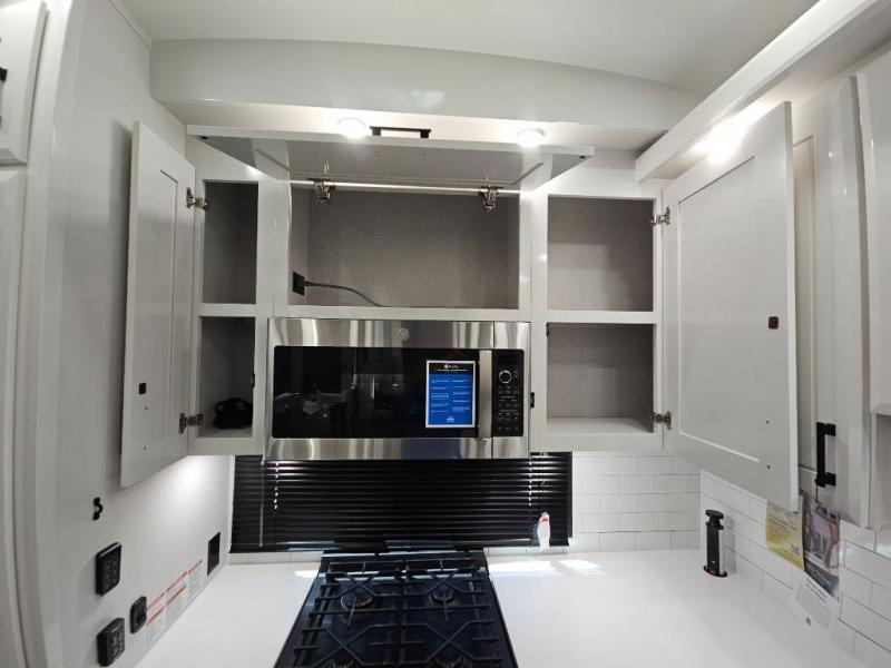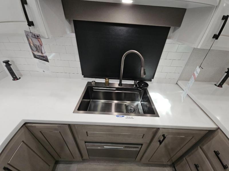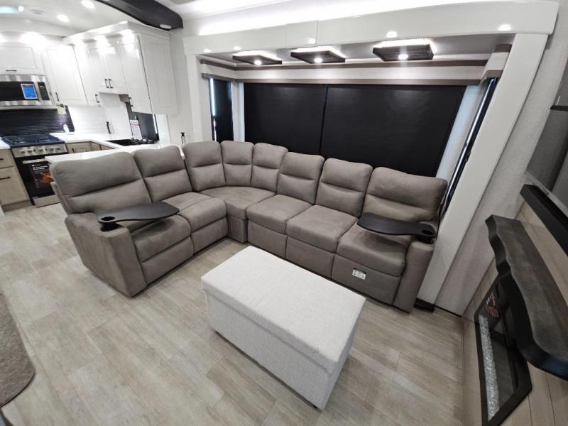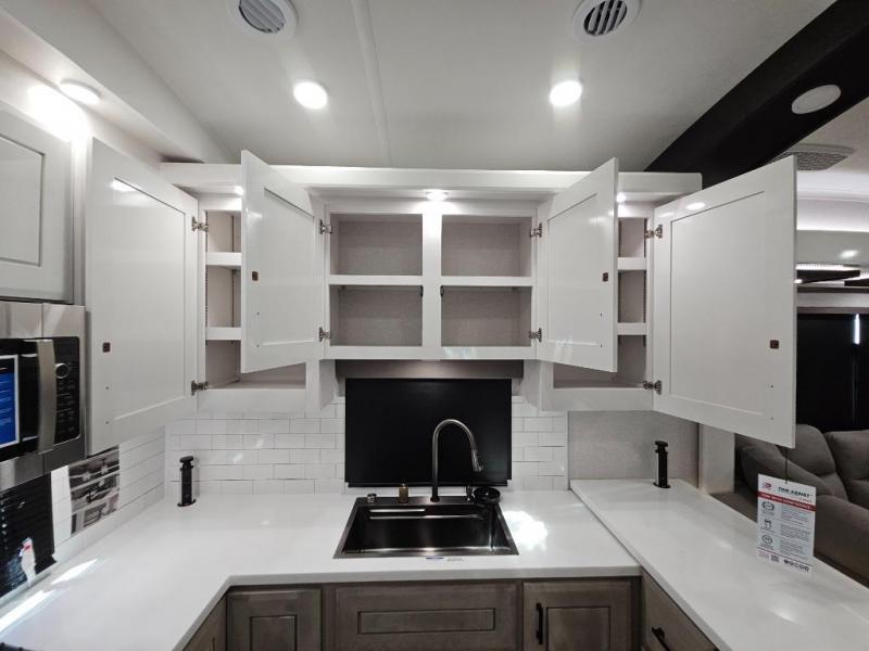 Each Pinnacle fifth wheel features Stronghold VBL lamination for the lightest, yet strongest construction in the RV industry. Add that to the Magnum Truss XL6 roof system and Climate Shield zero-degree tested weather protection and you'll be enjoying your fifth wheel for years to come. Some of the exterior conveniences you will appreciate are the Keyed-Alike lock system, the fully enclosed, universal docking center, and the 6-point hydraulic auto-leveling system for quick and easy set up. The 5 Star Handling Package will make towing a fifth wheel a walk in the park, and the two Whisper Quiet A/C units will keep you comfortable during the hot summer months. Inside, you'll enjoy the residential "Do it all" sink with pull-out kitchen faucet, glass rinse, and vegetable rinse, the handcrafted hardwood glazed cabinetry, the vinyl flooring throughout, plus many more comforts. There is even a central vacuum system, a wireless remote control system, USB ports throughout, plus many more conveniences to make each trip enjoyable.