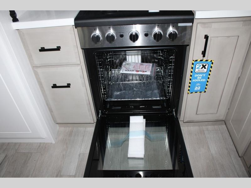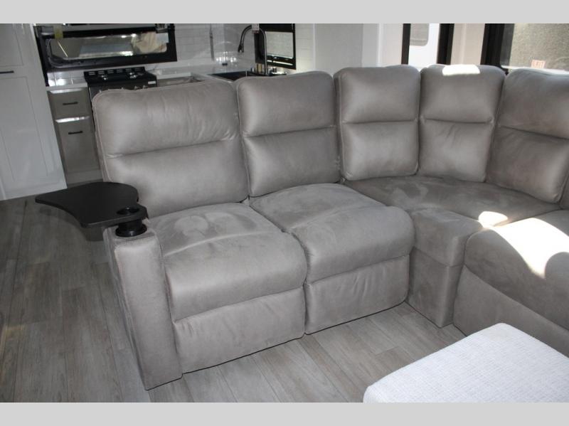 Triples slides, a desk/coffee bar, fireplace, and a huge master bath in front all indicate the kind of vacation you will experience in this Pinnacle Fifth Wheel! As you enter, a convenient half bath is located straight ahead. Slightly to your left, a nice seating area for gathering with family or friends to relax and watch TV, enjoy the fireplace while reading a book or watching a movie, and the dining table with chairs. The dinette slide also houses a 21 cu. ft. residential refrigerator and pantry. The rear kitchen features a u-shaped counter, all the appliances you need to cook like at home, even a pull-out butcher block space for chopping up your veggies. Back through and up the steps to your right in front, the master bedroom will make you feel like royalty with its king bed, plus luxurious full rear bath. A huge vanity with dual bath sinks will allow you both to get ready at the same time, plus there is a walk-in shower with a seat for added convenience. Speaking of walk-in, you will also love the spacious walk-in closet that includes washer/dryer prep.