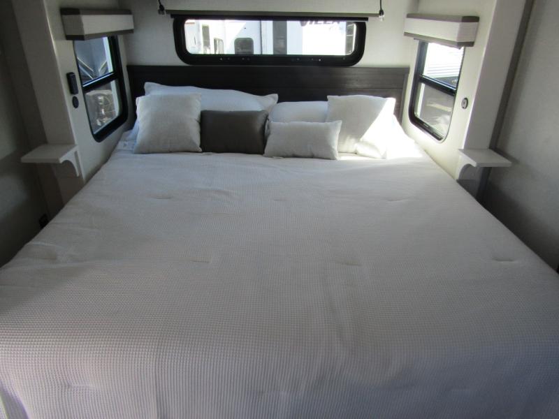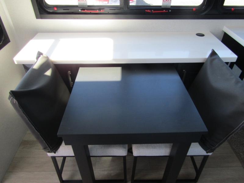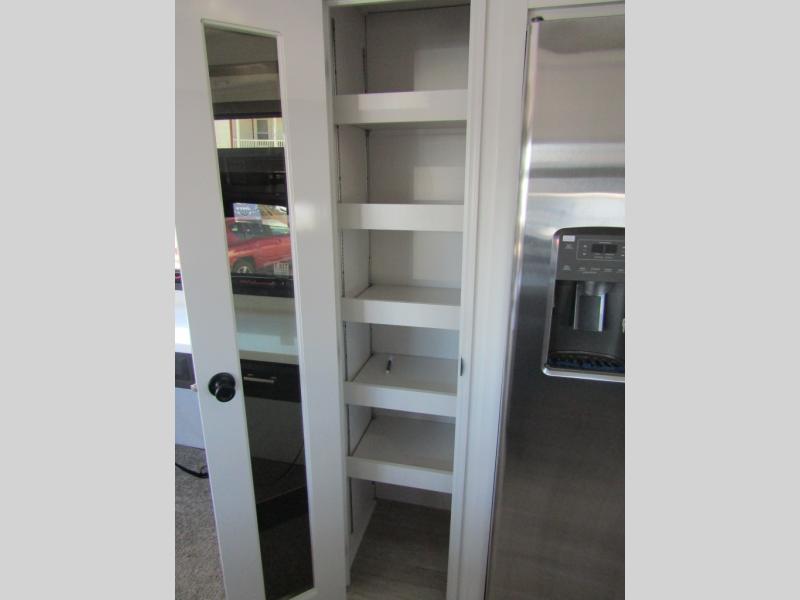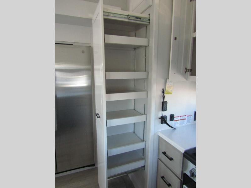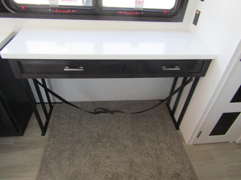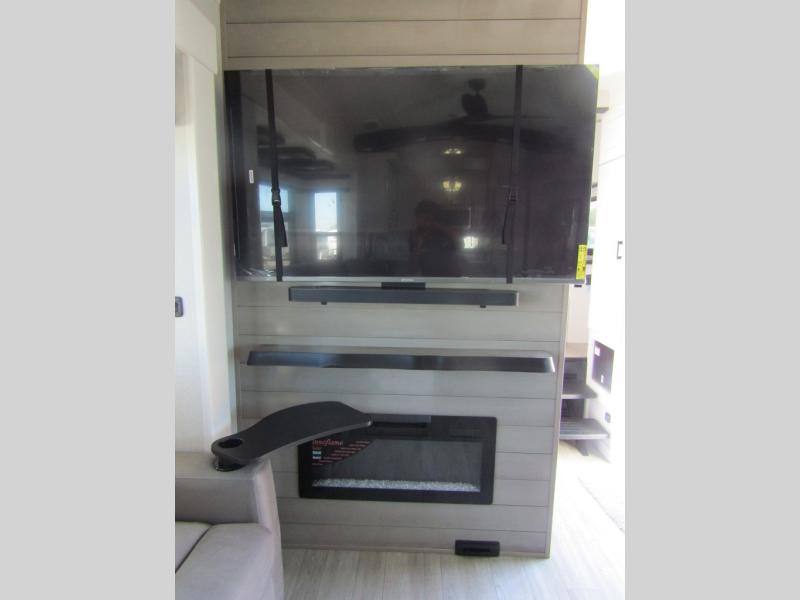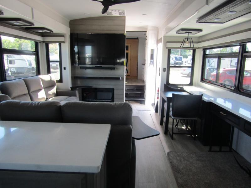 Triples slides, a desk/coffee bar, fireplace, and a huge master bath in front all indicate the kind of vacation you will experience in this Pinnacle Fifth Wheel! As you enter, a convenient half bath is located straight ahead. Slightly to your left, a nice seating area for gathering with family or friends to relax and watch TV, enjoy the fireplace while reading a book or watching a movie, and the dining table with chairs. The dinette slide also houses a 21 cu. ft. residential refrigerator and pantry. The rear kitchen features a u-shaped counter, all the appliances you need to cook like at home, even a pull-out butcher block space for chopping up your veggies. Back through and up the steps to your right in front, the master bedroom will make you feel like royalty with its king bed, plus luxurious full rear bath. A huge vanity with dual bath sinks will allow you both to get ready at the same time, plus there is a walk-in shower with a seat for added convenience. Speaking of walk-in, you will also love the spacious walk-in closet that includes washer/dryer prep.