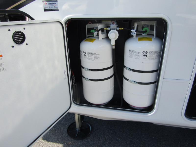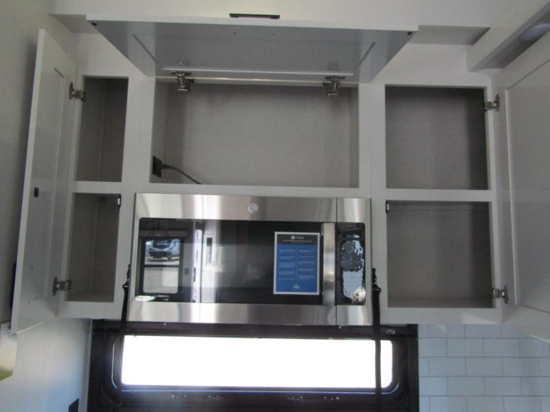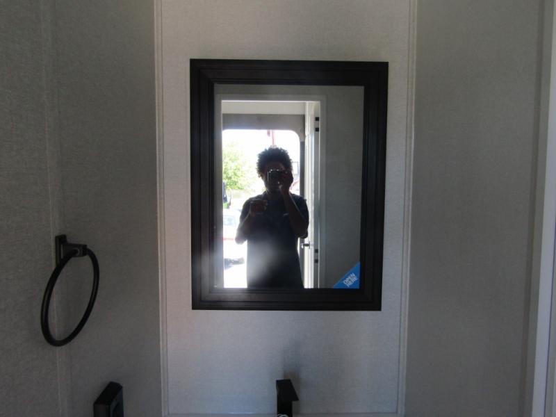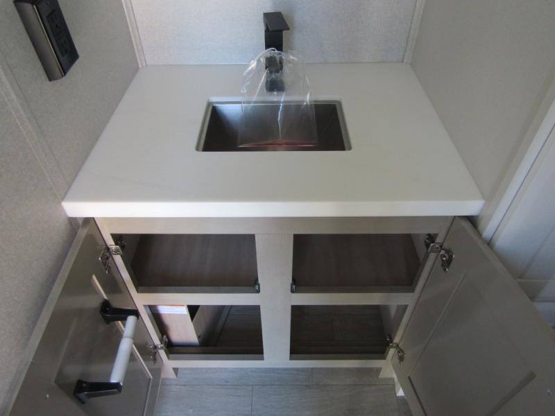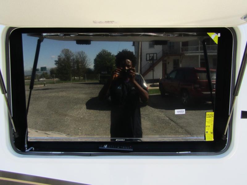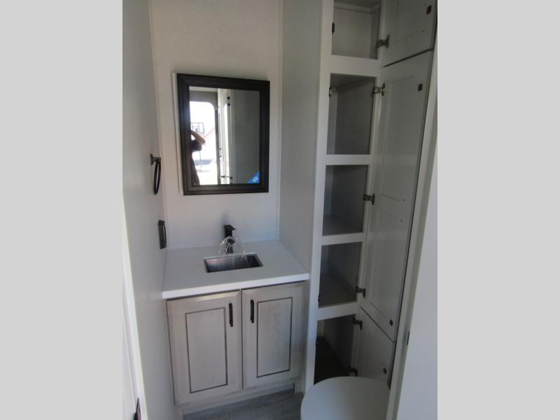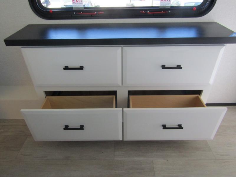 Triples slides, a desk/coffee bar, fireplace, and a huge master bath in front all indicate the kind of vacation you will experience in this Pinnacle Fifth Wheel! As you enter, a convenient half bath is located straight ahead. Slightly to your left, a nice seating area for gathering with family or friends to relax and watch TV, enjoy the fireplace while reading a book or watching a movie, and the dining table with chairs. The dinette slide also houses a 21 cu. ft. residential refrigerator and pantry. The rear kitchen features a u-shaped counter, all the appliances you need to cook like at home, even a pull-out butcher block space for chopping up your veggies. Back through and up the steps to your right in front, the master bedroom will make you feel like royalty with its king bed, plus luxurious full rear bath. A huge vanity with dual bath sinks will allow you both to get ready at the same time, plus there is a walk-in shower with a seat for added convenience. Speaking of walk-in, you will also love the spacious walk-in closet that includes washer/dryer prep.