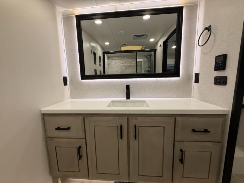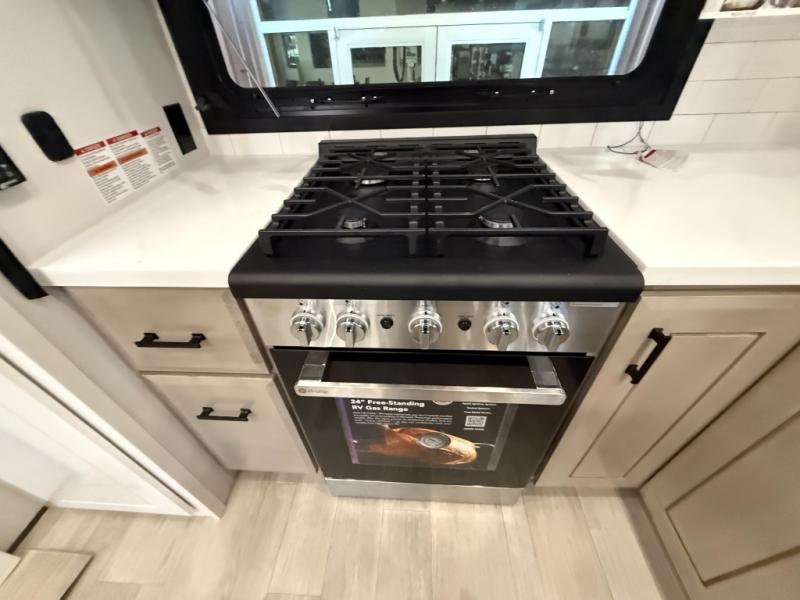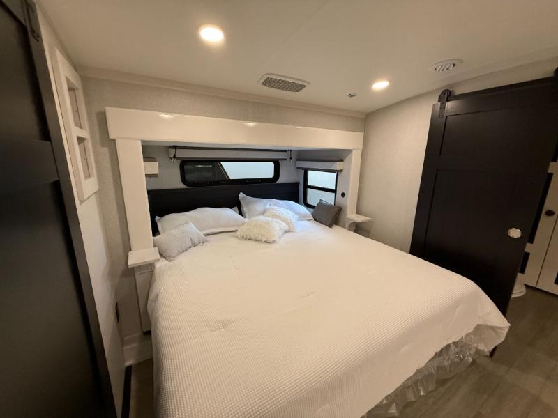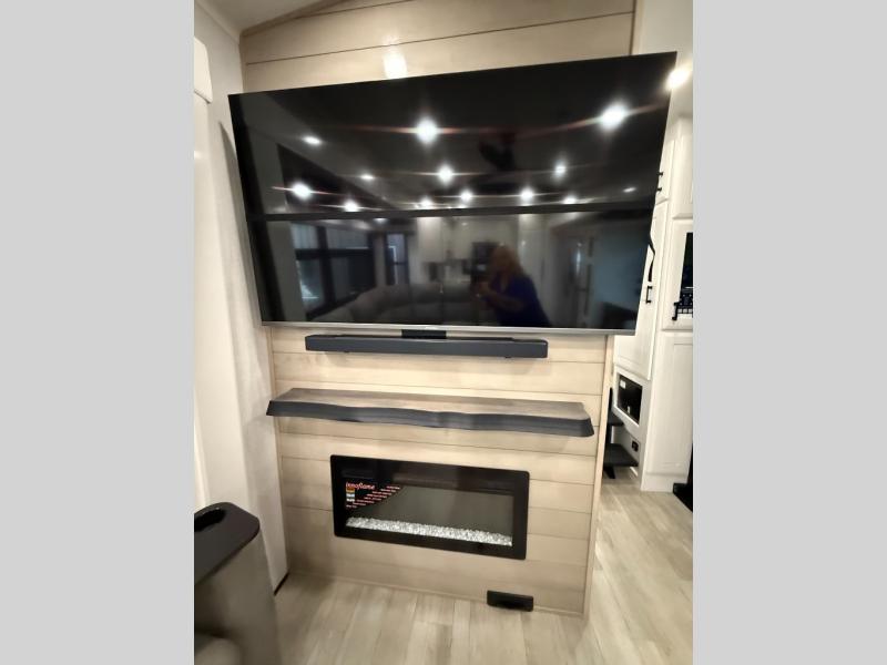 Triples slides, a desk/coffee bar, fireplace, and a huge master bath in front all indicate the kind of vacation you will experience in this Pinnacle Fifth Wheel! As you enter, a convenient half bath is located straight ahead. Slightly to your left, a nice seating area for gathering with family or friends to relax and watch TV, enjoy the fireplace while reading a book or watching a movie, and the dining table with chairs. The dinette slide also houses a 21 cu. ft. residential refrigerator and pantry. The rear kitchen features a u-shaped counter, all the appliances you need to cook like at home, even a pull-out butcher block space for chopping up your veggies. Back through and up the steps to your right in front, the master bedroom will make you feel like royalty with its king bed, plus luxurious full rear bath. A huge vanity with dual bath sinks will allow you both to get ready at the same time, plus there is a walk-in shower with a seat for added convenience. Speaking of walk-in, you will also love the spacious walk-in closet that includes washer/dryer prep.