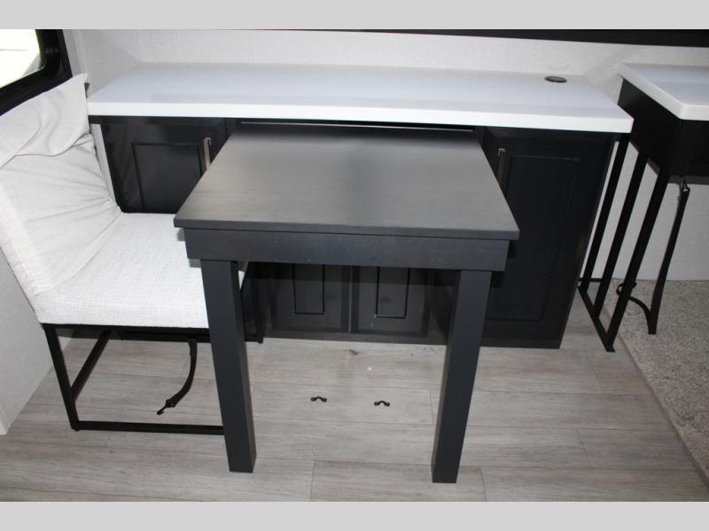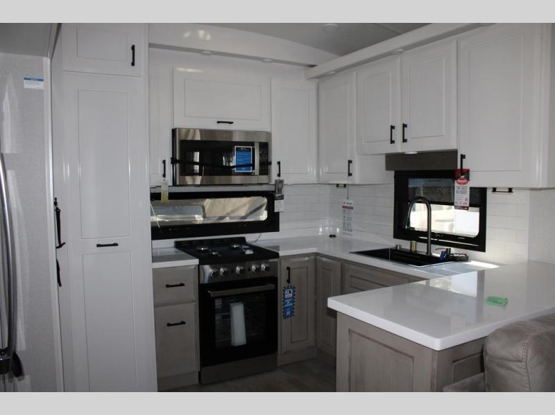 Triples slides, a desk/coffee bar, fireplace, and a huge master bath in front all indicate the kind of vacation you will experience in this Pinnacle Fifth Wheel! As you enter, a convenient half bath is located straight ahead. Slightly to your left, a nice seating area for gathering with family or friends to relax and watch TV, enjoy the fireplace while reading a book or watching a movie, and the dining table with chairs. The dinette slide also houses a 21 cu. ft. residential refrigerator and pantry. The rear kitchen features a u-shaped counter, all the appliances you need to cook like at home, even a pull-out butcher block space for chopping up your veggies. Back through and up the steps to your right in front, the master bedroom will make you feel like royalty with its king bed, plus luxurious full rear bath. A huge vanity with dual bath sinks will allow you both to get ready at the same time, plus there is a walk-in shower with a seat for added convenience. Speaking of walk-in, you will also love the spacious walk-in closet that includes washer/dryer prep.