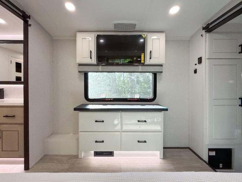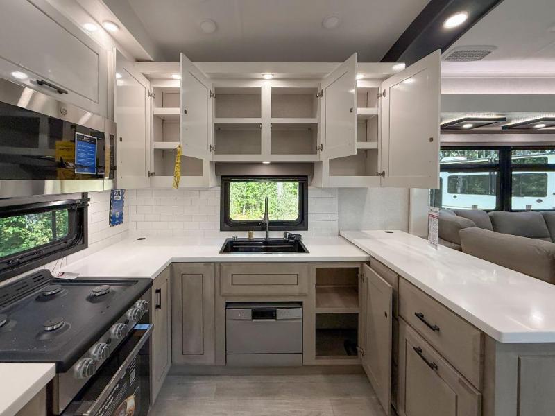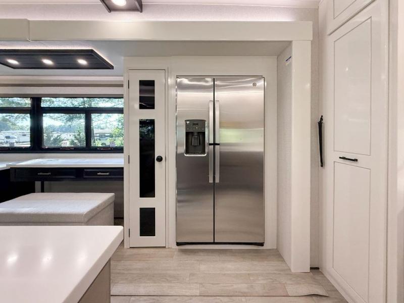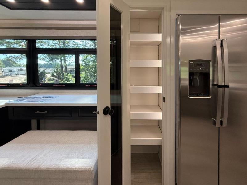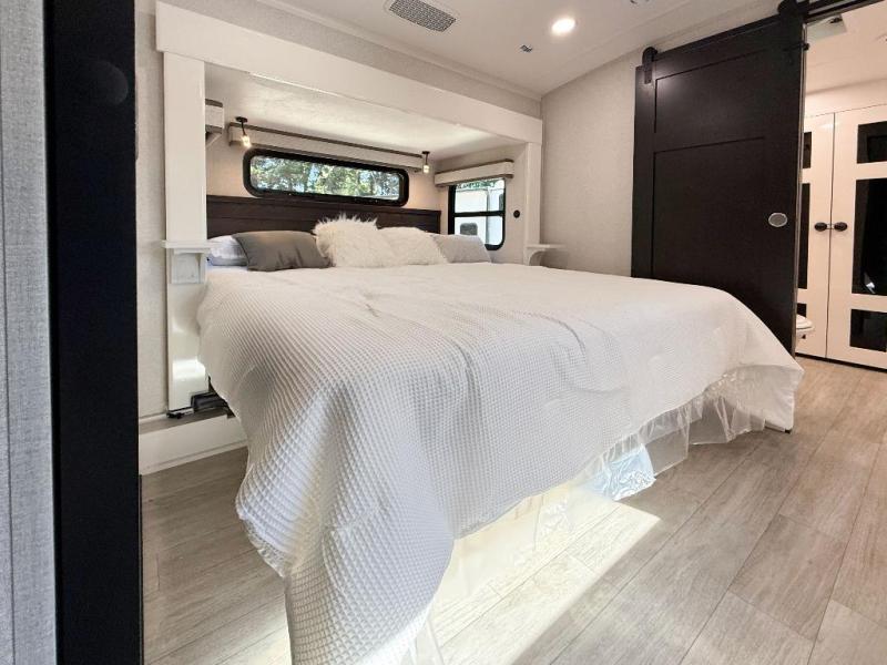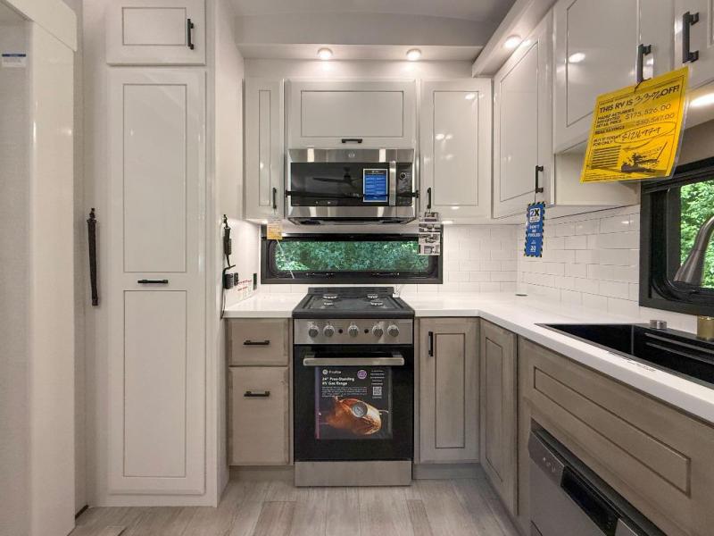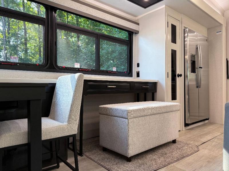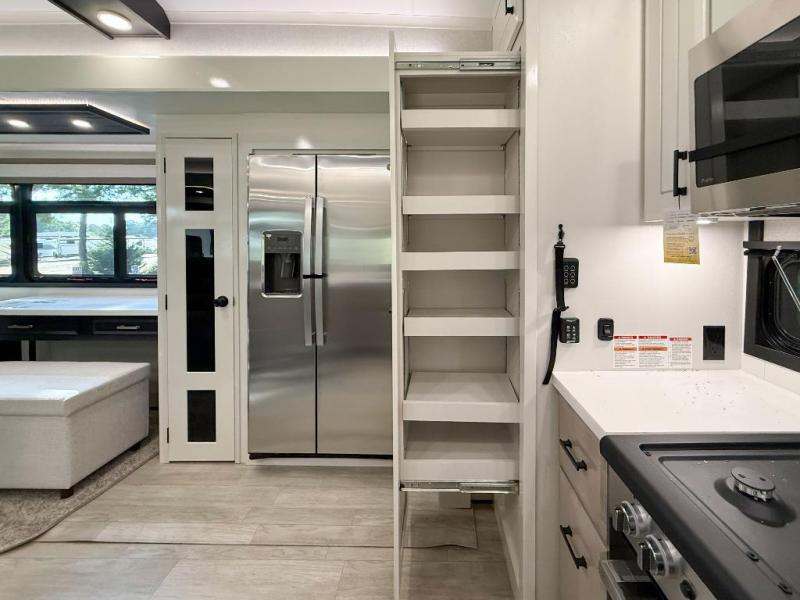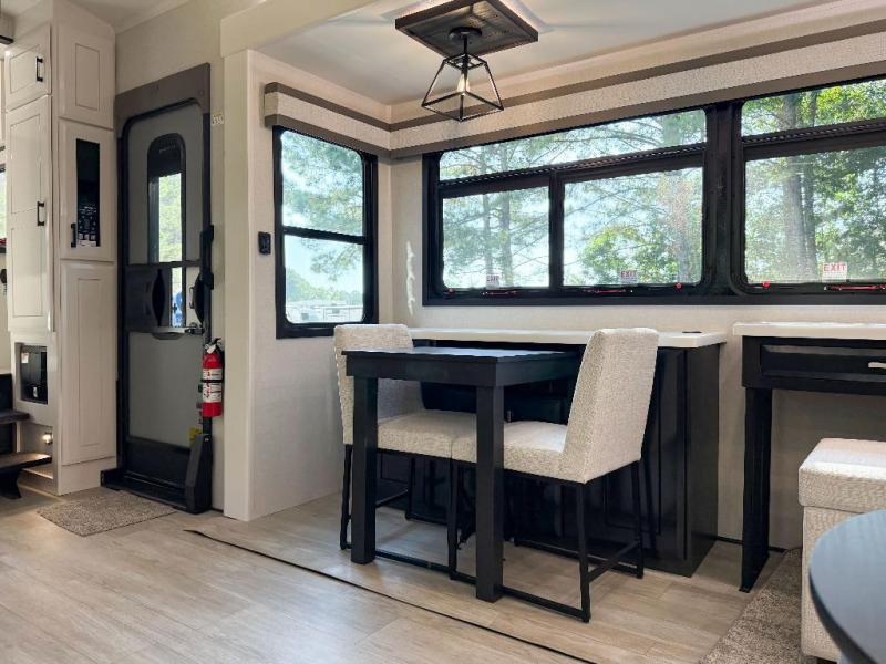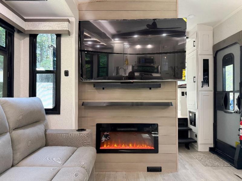Triples slides, a desk/coffee bar, fireplace, and a huge master bath in front all indicate the kind of vacation you will experience in this Pinnacle Fifth Wheel! As you enter, a convenient half bath is located straight ahead. Slightly to your left, a nice seating area for gathering with family or friends to relax and watch TV, enjoy the fireplace while reading a book or watching a movie, and the dining table with chairs. The dinette slide also houses a 21 cu. ft. residential refrigerator and pantry. The rear kitchen features a u-shaped counter, all the appliances you need to cook like at home, even a pull-out butcher block space for chopping up your veggies. Back through and up the steps to your right in front, the master bedroom will make you feel like royalty with its king bed, plus luxurious full rear bath. A huge vanity with dual bath sinks will allow you both to get ready at the same time, plus there is a walk-in shower with a seat for added convenience. Speaking of walk-in, you will also love the spacious walk-in closet that includes washer/dryer prep.