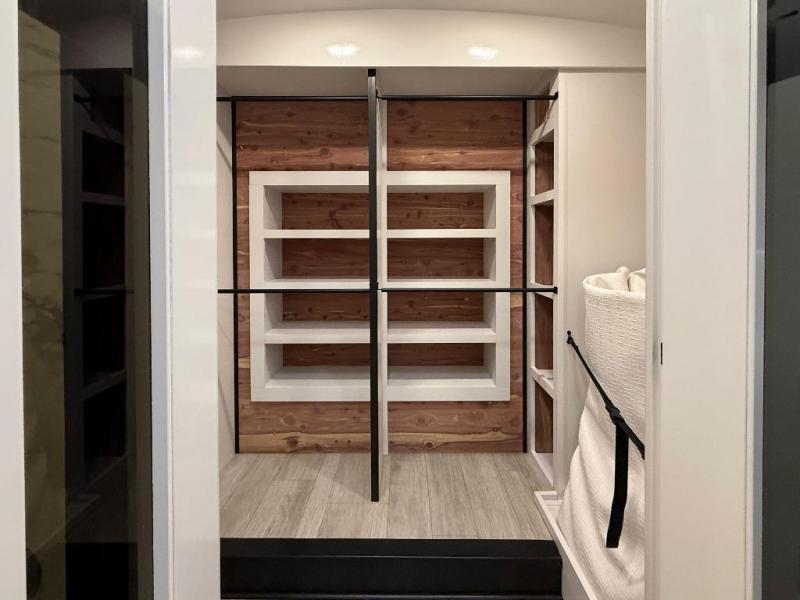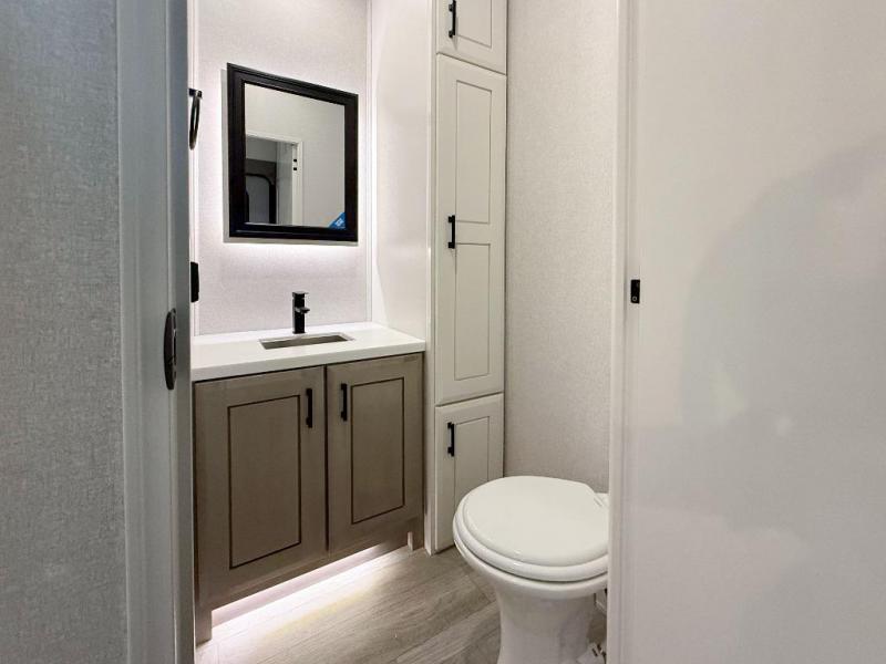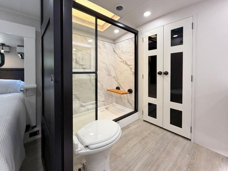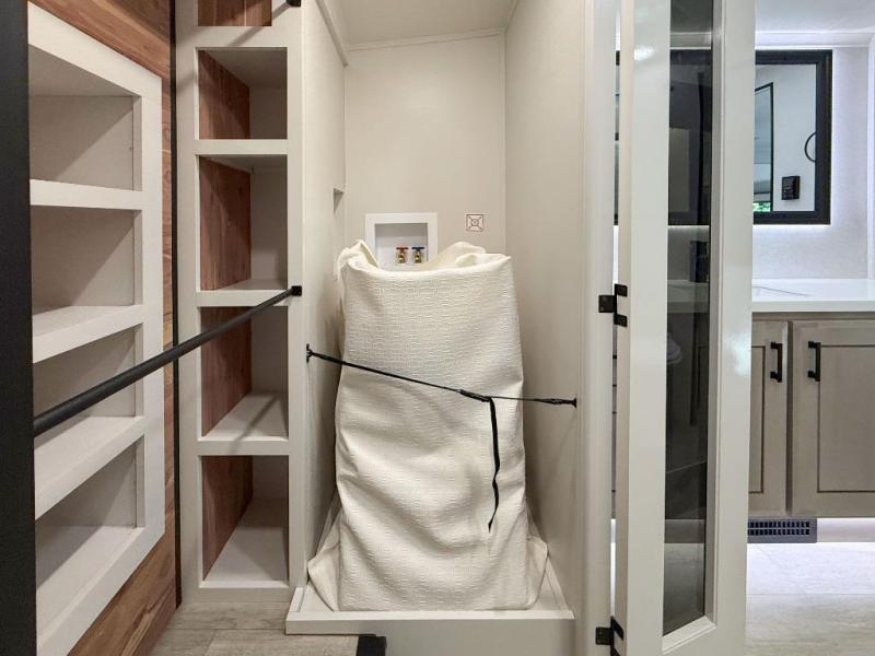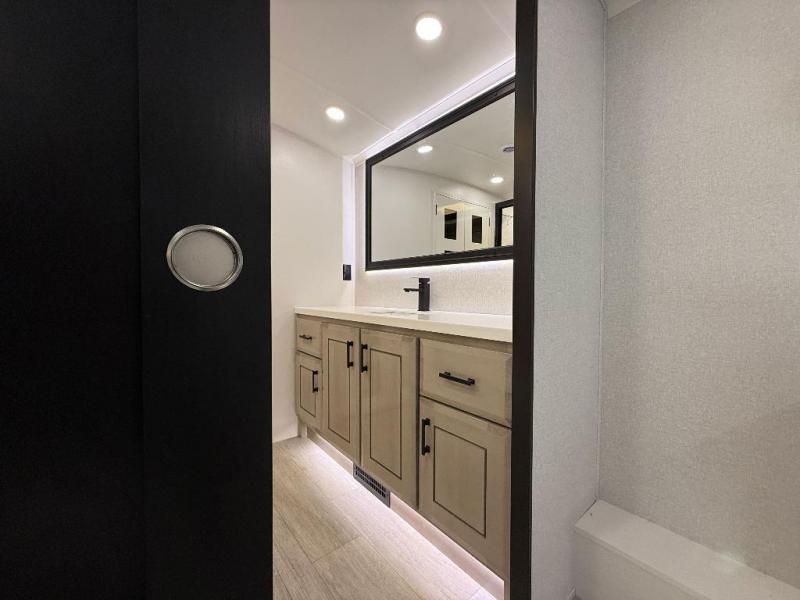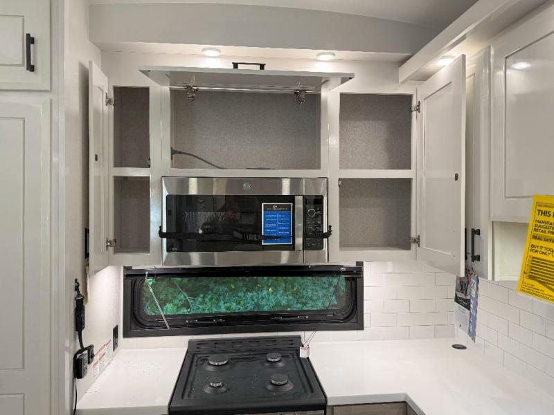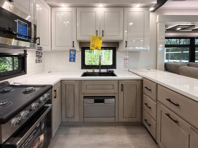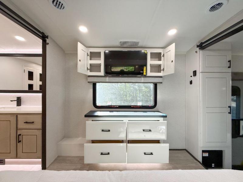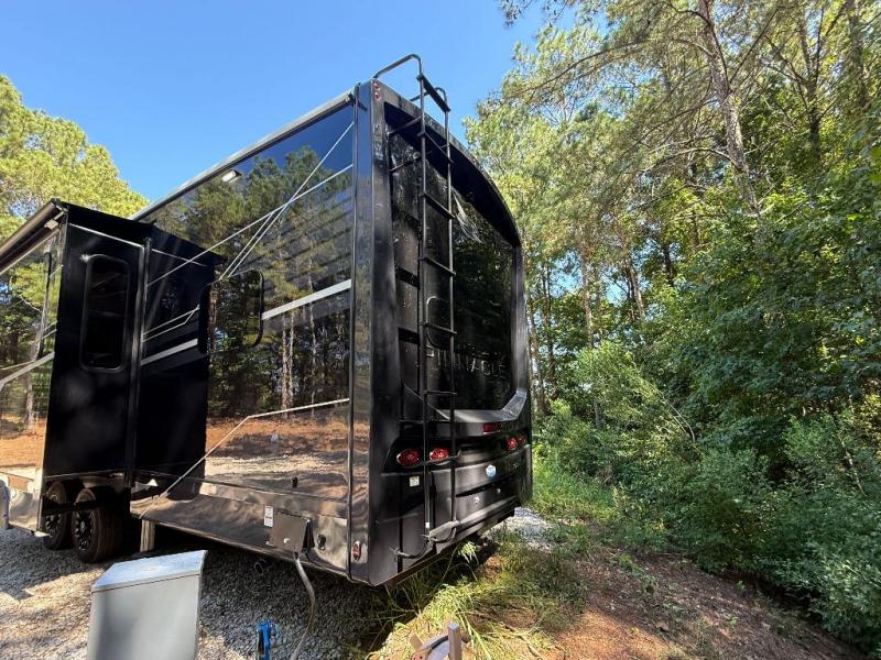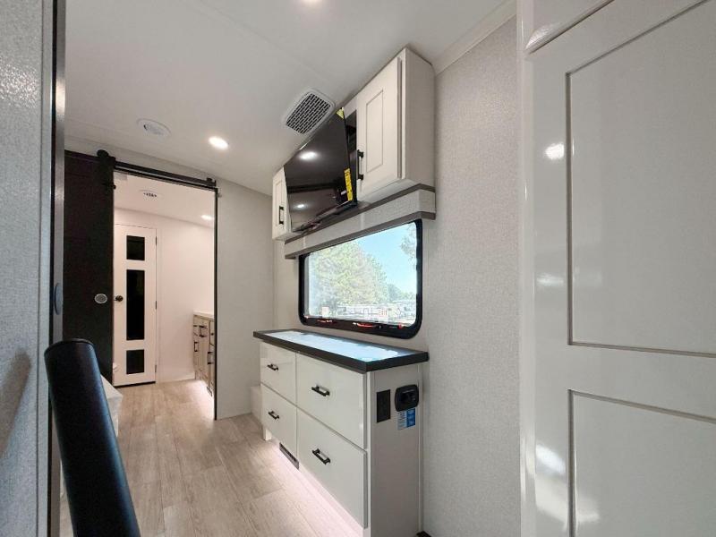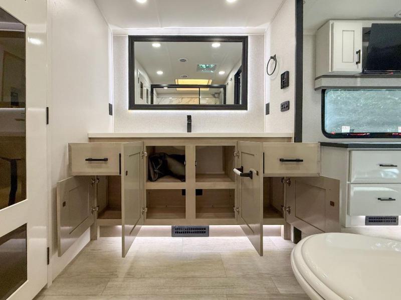 Triples slides, a desk/coffee bar, fireplace, and a huge master bath in front all indicate the kind of vacation you will experience in this Pinnacle Fifth Wheel! As you enter, a convenient half bath is located straight ahead. Slightly to your left, a nice seating area for gathering with family or friends to relax and watch TV, enjoy the fireplace while reading a book or watching a movie, and the dining table with chairs. The dinette slide also houses a 21 cu. ft. residential refrigerator and pantry. The rear kitchen features a u-shaped counter, all the appliances you need to cook like at home, even a pull-out butcher block space for chopping up your veggies. Back through and up the steps to your right in front, the master bedroom will make you feel like royalty with its king bed, plus luxurious full rear bath. A huge vanity with dual bath sinks will allow you both to get ready at the same time, plus there is a walk-in shower with a seat for added convenience. Speaking of walk-in, you will also love the spacious walk-in closet that includes washer/dryer prep.