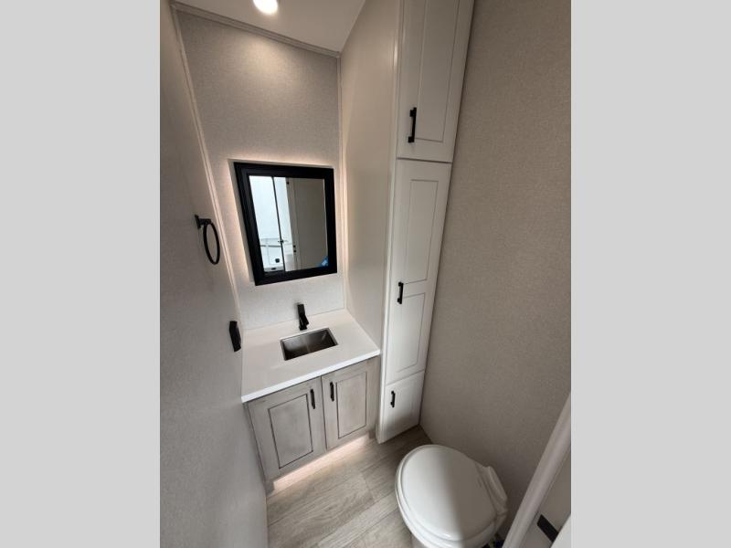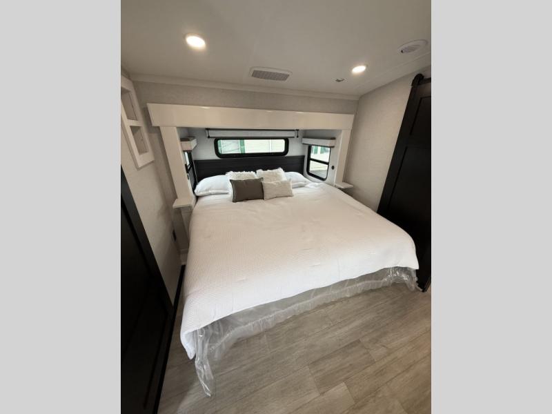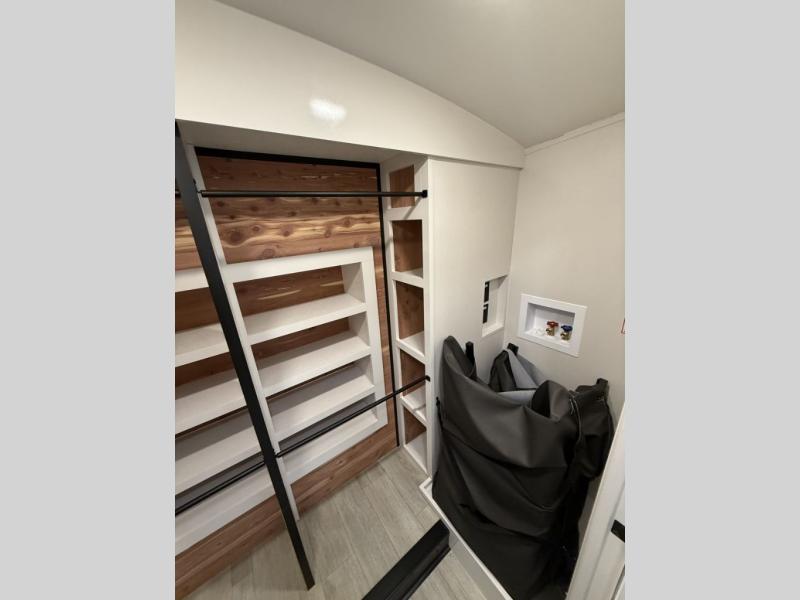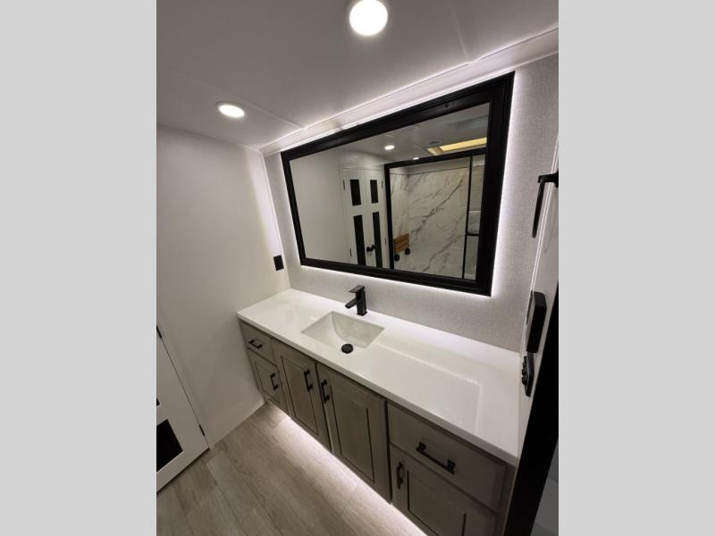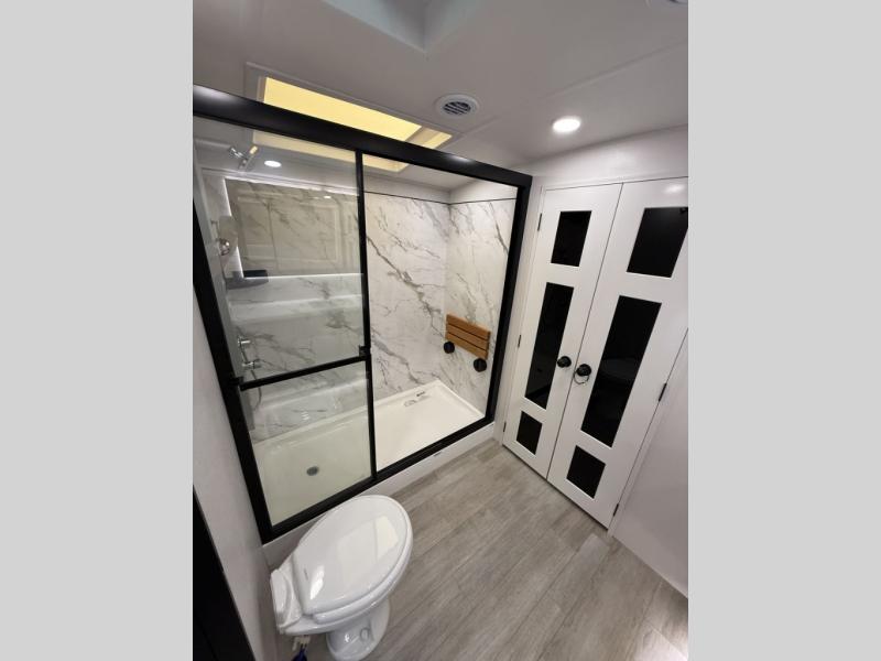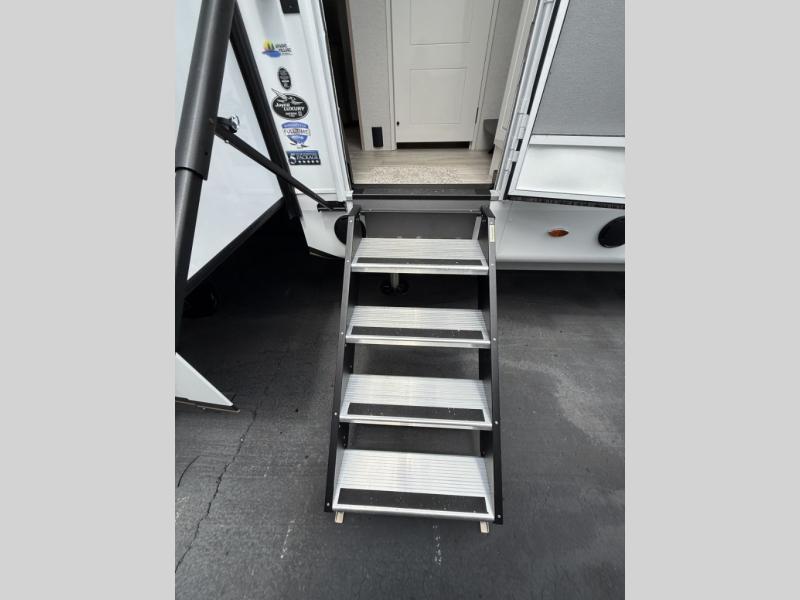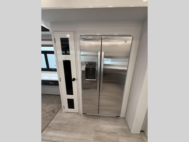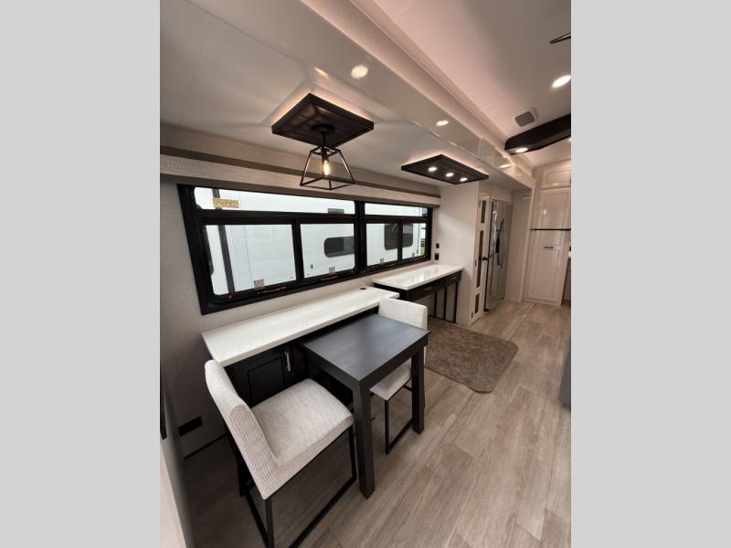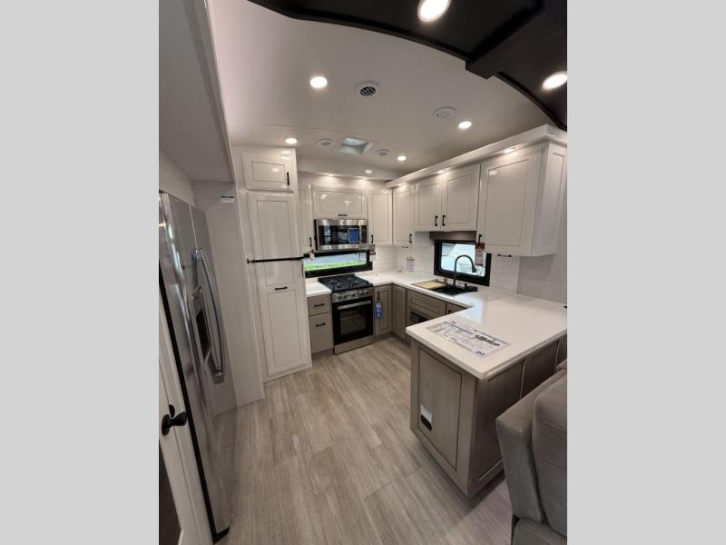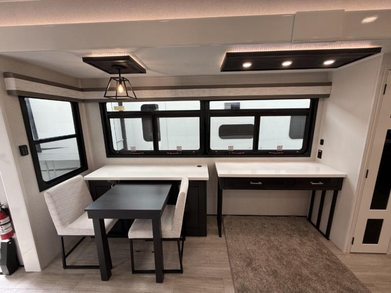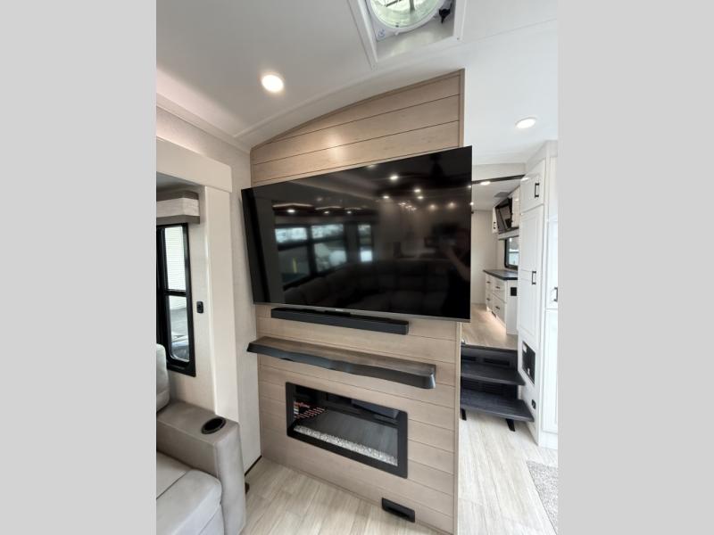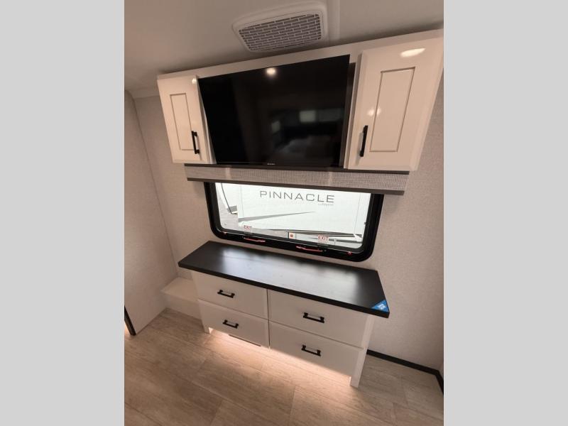 Triples slides, a desk/coffee bar, fireplace, and a huge master bath in front all indicate the kind of vacation you will experience in this Pinnacle Fifth Wheel! As you enter, a convenient half bath is located straight ahead. Slightly to your left, a nice seating area for gathering with family or friends to relax and watch TV, enjoy the fireplace while reading a book or watching a movie, and the dining table with chairs. The dinette slide also houses a 21 cu. ft. residential refrigerator and pantry. The rear kitchen features a u-shaped counter, all the appliances you need to cook like at home, even a pull-out butcher block space for chopping up your veggies. Back through and up the steps to your right in front, the master bedroom will make you feel like royalty with its king bed, plus luxurious full rear bath. A huge vanity with dual bath sinks will allow you both to get ready at the same time, plus there is a walk-in shower with a seat for added convenience. Speaking of walk-in, you will also love the spacious walk-in closet that includes washer/dryer prep.