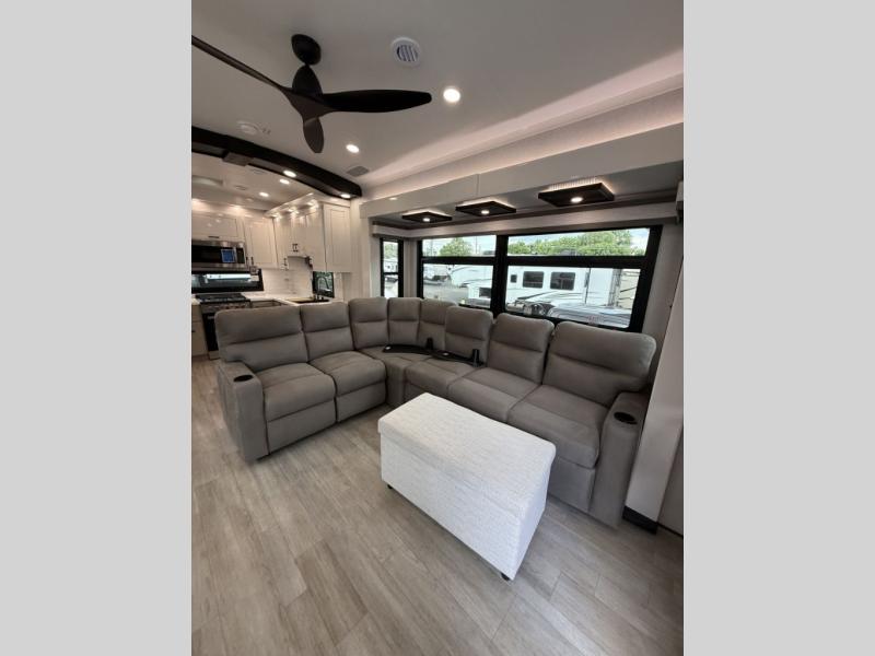 Each Pinnacle fifth wheel features Stronghold VBL lamination for the lightest, yet strongest construction in the RV industry. Add that to the Magnum Truss XL6 roof system and Climate Shield zero-degree tested weather protection and you'll be enjoying your fifth wheel for years to come. Some of the exterior conveniences you will appreciate are the Keyed-Alike lock system, the fully enclosed, universal docking center, and the 6-point hydraulic auto-leveling system for quick and easy set up. The 5 Star Handling Package will make towing a fifth wheel a walk in the park, and the two Whisper Quiet A/C units will keep you comfortable during the hot summer months. Inside, you'll enjoy the residential "Do it all" sink with pull-out kitchen faucet, glass rinse, and vegetable rinse, the handcrafted hardwood glazed cabinetry, the vinyl flooring throughout, plus many more comforts. There is even a central vacuum system, a wireless remote control system, USB ports throughout, plus many more conveniences to make each trip enjoyable.