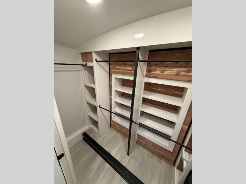 Triples slides, a desk/coffee bar, fireplace, and a huge master bath in front all indicate the kind of vacation you will experience in this Pinnacle Fifth Wheel! As you enter, a convenient half bath is located straight ahead. Slightly to your left, a nice seating area for gathering with family or friends to relax and watch TV, enjoy the fireplace while reading a book or watching a movie, and the dining table with chairs. The dinette slide also houses a 21 cu. ft. residential refrigerator and pantry. The rear kitchen features a u-shaped counter, all the appliances you need to cook like at home, even a pull-out butcher block space for chopping up your veggies. Back through and up the steps to your right in front, the master bedroom will make you feel like royalty with its king bed, plus luxurious full rear bath. A huge vanity with dual bath sinks will allow you both to get ready at the same time, plus there is a walk-in shower with a seat for added convenience. Speaking of walk-in, you will also love the spacious walk-in closet that includes washer/dryer prep.