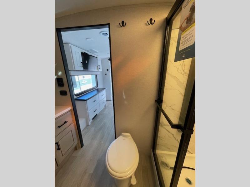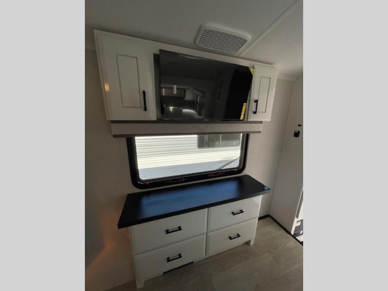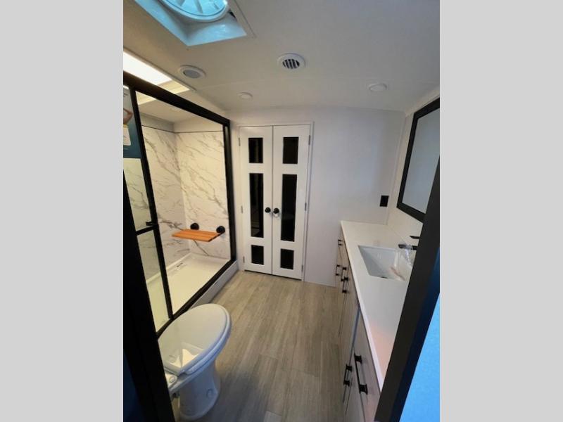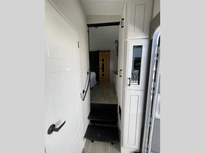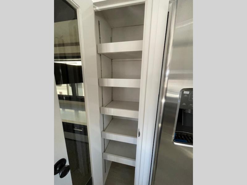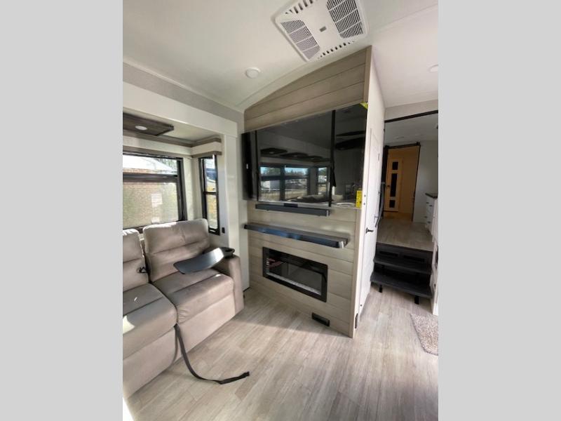 Triples slides, a desk/coffee bar, fireplace, and a huge master bath in front all indicate the kind of vacation you will experience in this Pinnacle Fifth Wheel! As you enter, a convenient half bath is located straight ahead. Slightly to your left, a nice seating area for gathering with family or friends to relax and watch TV, enjoy the fireplace while reading a book or watching a movie, and the dining table with chairs. The dinette slide also houses a 21 cu. ft. residential refrigerator and pantry. The rear kitchen features a u-shaped counter, all the appliances you need to cook like at home, even a pull-out butcher block space for chopping up your veggies. Back through and up the steps to your right in front, the master bedroom will make you feel like royalty with its king bed, plus luxurious full rear bath. A huge vanity with dual bath sinks will allow you both to get ready at the same time, plus there is a walk-in shower with a seat for added convenience. Speaking of walk-in, you will also love the spacious walk-in closet that includes washer/dryer prep.