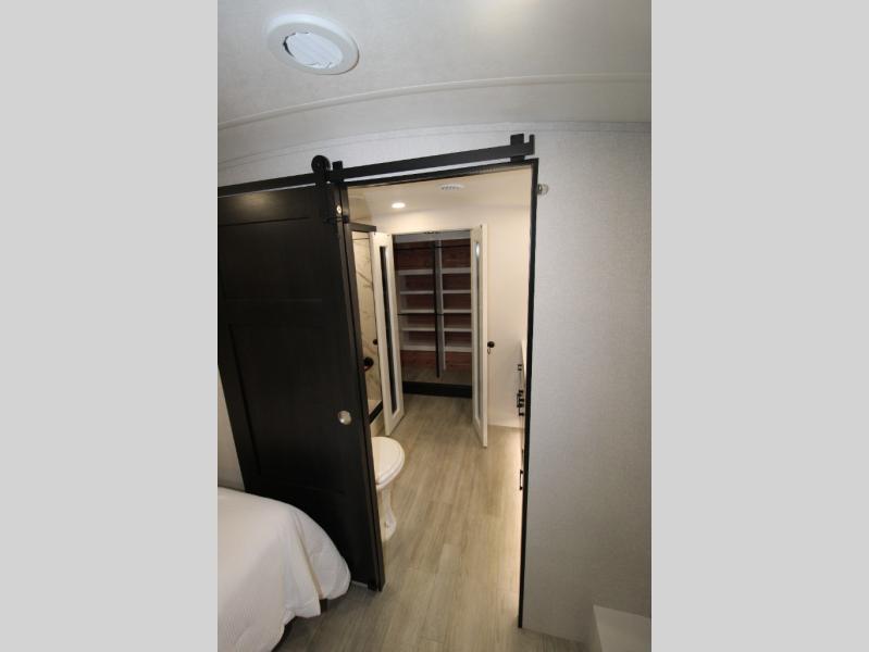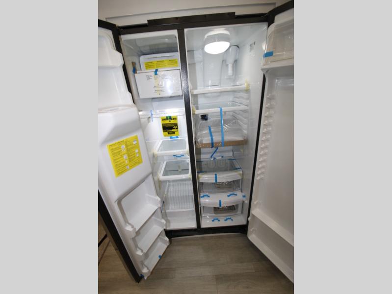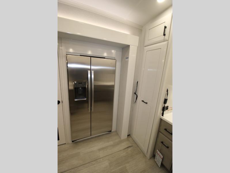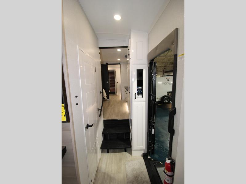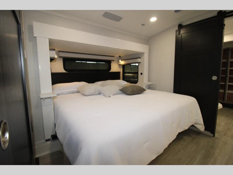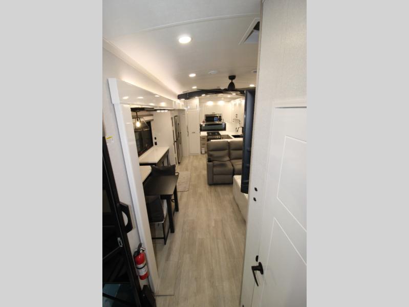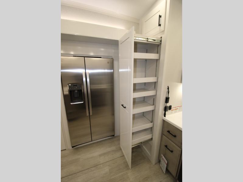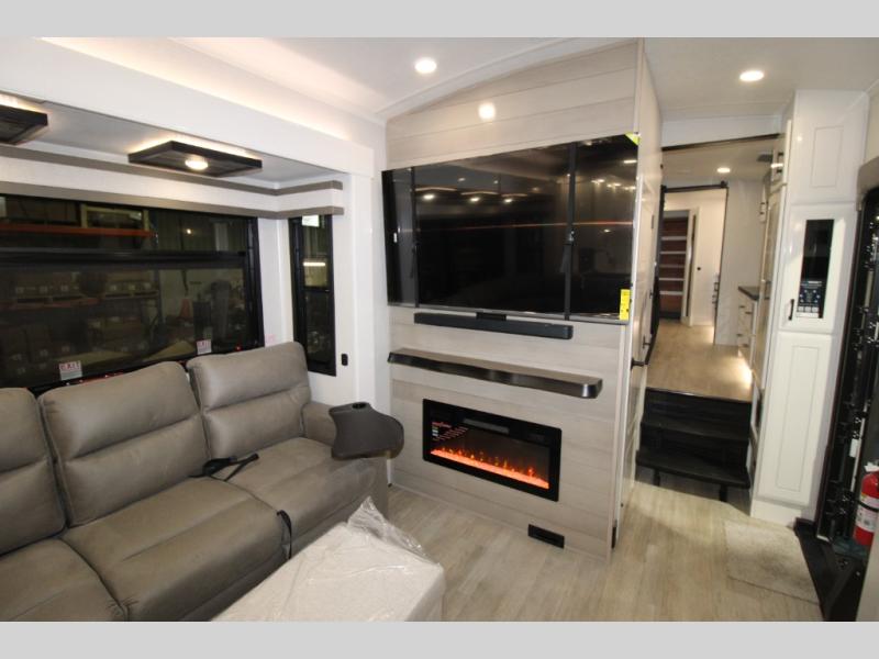 Triples slides, a desk/coffee bar, fireplace, and a huge master bath in front all indicate the kind of vacation you will experience in this Pinnacle Fifth Wheel! As you enter, a convenient half bath is located straight ahead. Slightly to your left, a nice seating area for gathering with family or friends to relax and watch TV, enjoy the fireplace while reading a book or watching a movie, and the dining table with chairs. The dinette slide also houses a 21 cu. ft. residential refrigerator and pantry. The rear kitchen features a u-shaped counter, all the appliances you need to cook like at home, even a pull-out butcher block space for chopping up your veggies. Back through and up the steps to your right in front, the master bedroom will make you feel like royalty with its king bed, plus luxurious full rear bath. A huge vanity with dual bath sinks will allow you both to get ready at the same time, plus there is a walk-in shower with a seat for added convenience. Speaking of walk-in, you will also love the spacious walk-in closet that includes washer/dryer prep.